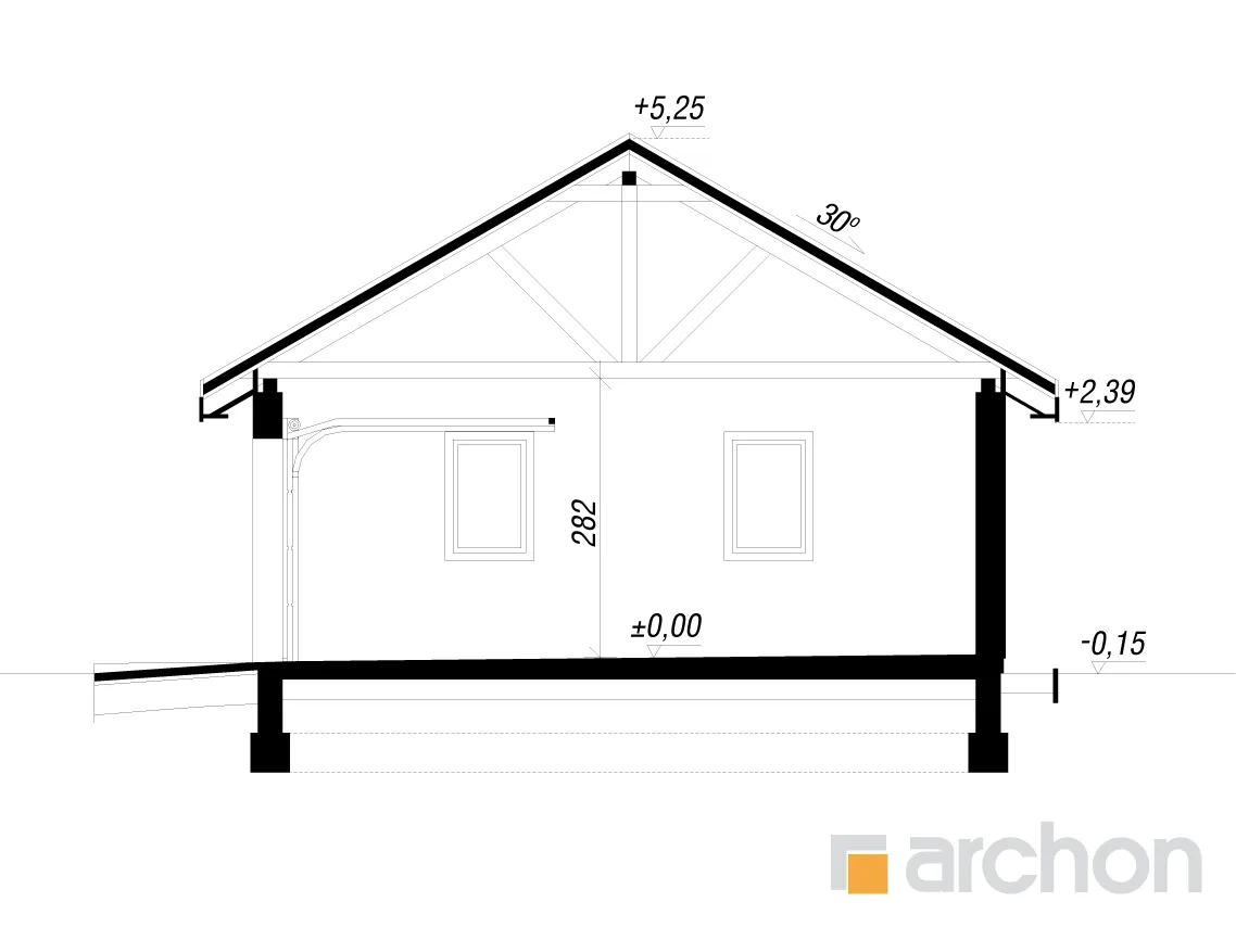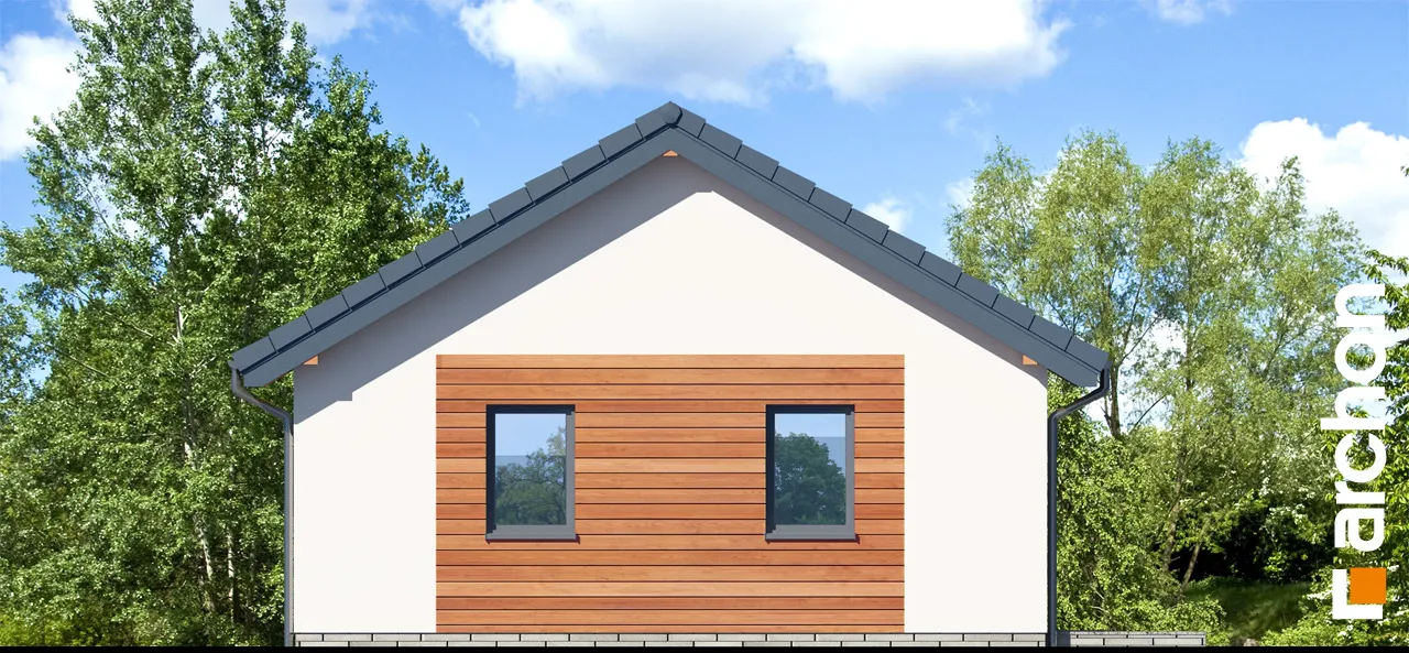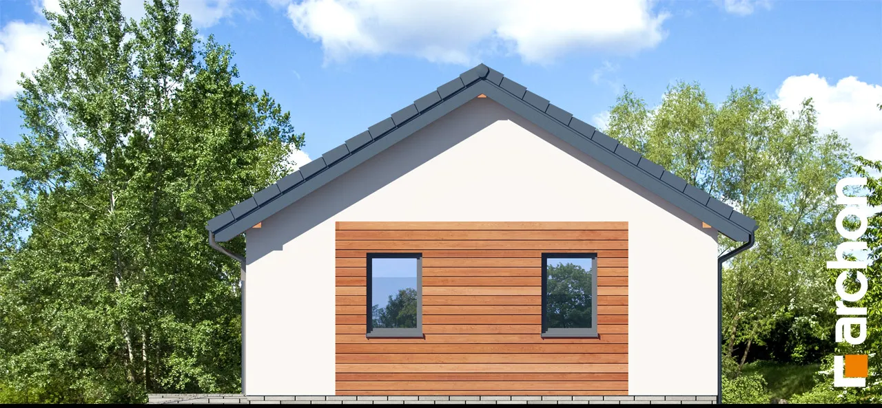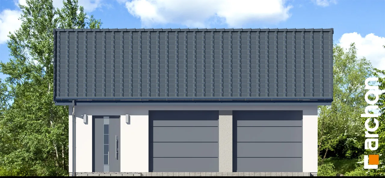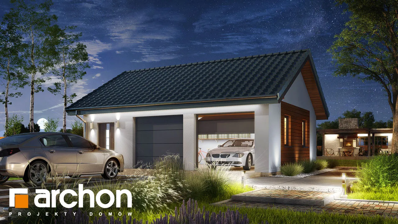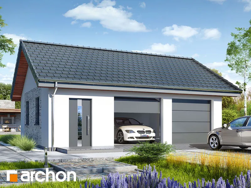 Одноэтажный гараж на две машины компактной формы, покрытый двускатной крышей. Благодаря использованию простых строительных решений строительство гаража пройдет гладко. Здание отличается современным внешним видом и элегантным оформлением фасада. Для отделки использована светлая штукатурка, обогащенная натуральной облицовкой. На передней стене гаража спроектированы двое ворот, обеспечивающих удобный доступ во внутренние помещения, а также в проекте предусмотрена дополнительная входная дверь. Внутри гаража одно большое помещение, естественно освещенное, окна расположены на боковых стенах здания. Помимо двух автомобилей, гараж также можно использовать для свободного хранения садовых инструментов или спортивного инвентаря, а также есть место для практичных шкафов, которые можно использовать для хранения запасных шин и других автомобильных аксессуаров.