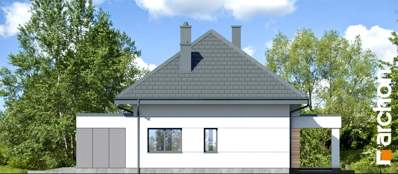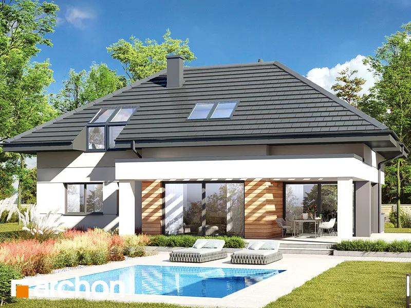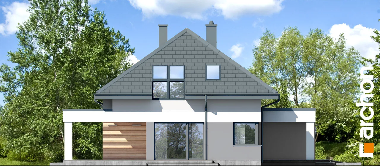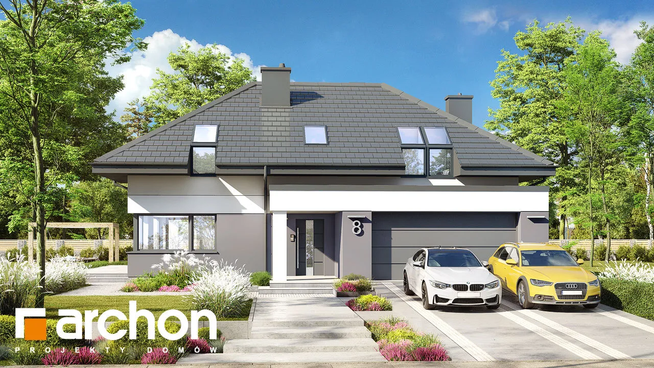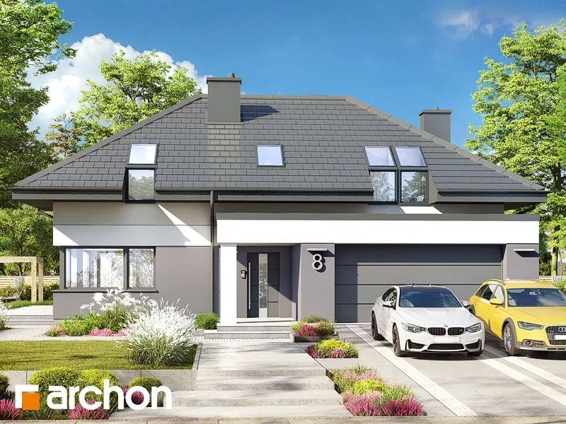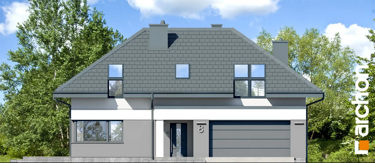 Интересный проект односемейного дома с жилой мансардой и просторным гаражом на две машины, массивным выступающим перед фронтальной частью здания. Монохроматическая композиция цветов штукатурки была разноображена натуральным деревом в части террасы. Входная зона получила интересный навес, который был создан путем расширения перекрытия гаража. Современной деталью являются окна в мансарде, которые обеспечивают привлекательное освещение расположенных там комнат. Первый этаж "Дом в дабециях 5 (Г2)" представляет собой комфортабельное жилое пространство, с впечатляющим проемом на скат крыши в гостиной и видом на мезонин, расположенным в мансарде. Отсюда открывается панорамный вид на сад, а широкое раздвижное остекление плавно соединяет гостиную с террасой. Из столовой, которая является просторным и представительным помещением дома, имеется раздвижной выход на покрытую аркадой часть террасы. Кухня может быть оборудована встроенной мебелью, в которой есть место для больших столешниц, а также современным островом с барной стойкой. В уединенной части первого этажа были спроектированы кабинет и ванная комната, а котельная с функцией прачечной завершает программу первого этажа. Удобная одномаршевая лестница ведет в ночную зону. Конструкция мансарды предусматривает три детские комнаты, спальню родителей с гардеробной и ванную комнату. В средней части мансарды находится антресольный этаж, который может служить открытым кабинетом или зоной отдыха. "Дом в дабециях 5 (Г2)" принадлежит к коллекции: проекты современных домов, проекты домов с мезонином, проекты домов с жилой мансардой. Среди других доступных версий мы имеем, в частности: "Дом в дабециях 4 (Г)" - с гаражом и "Дом в дабециях" - проект одноэтажного дома с мансардой для адаптации.