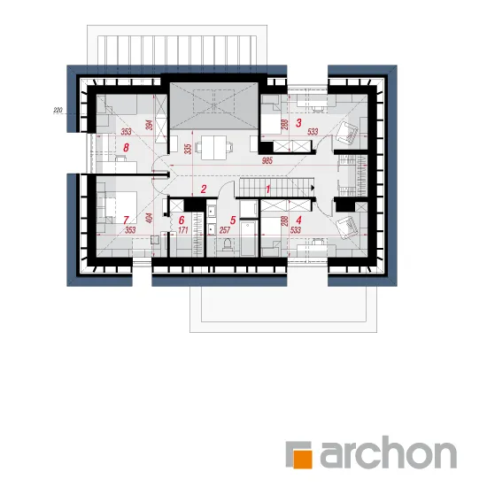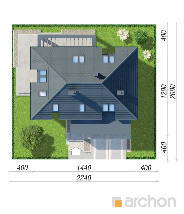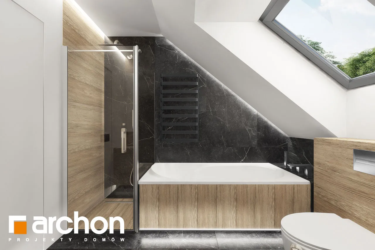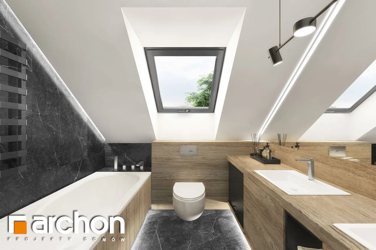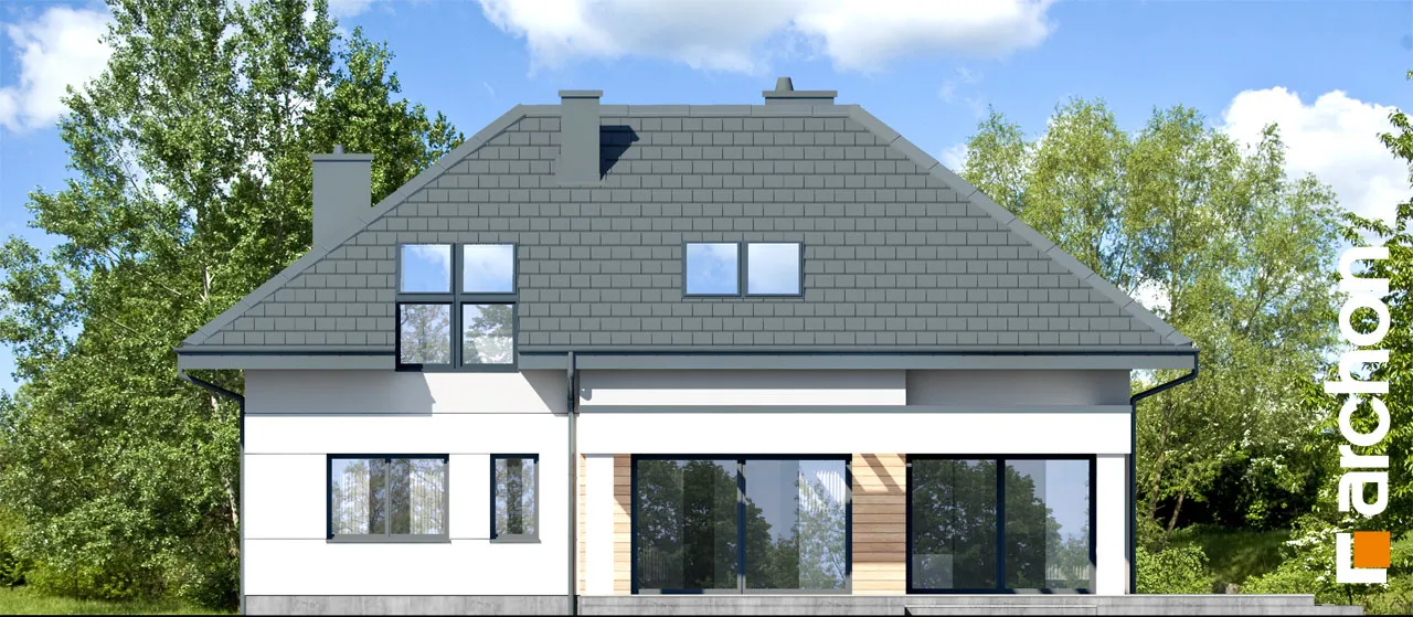 Интересный проект односемейного дома с жилой мансардой и просторным гаражом на две машины, массивным выступающим перед фронтальной частью здания. Монохроматическая композиция цветов штукатурки была разноображена натуральным деревом в части террасы. Входная зона получила интересный навес, который был создан путем расширения перекрытия гаража. Современной деталью являются окна в мансарде, которые обеспечивают привлекательное освещение расположенных там комнат. Первый этаж "Дом в дабециях 5 (Г2)" представляет собой комфортабельное жилое пространство, с впечатляющим проемом на скат крыши в гостиной и видом на мезонин, расположенным в мансарде. Отсюда открывается панорамный вид на сад, а широкое раздвижное остекление плавно соединяет гостиную с террасой. Из столовой, которая является просторным и представительным помещением дома, имеется раздвижной выход на покрытую аркадой часть террасы. Кухня может быть оборудована встроенной мебелью, в которой есть место для больших столешниц, а также современным островом с барной стойкой. В уединенной части первого этажа были спроектированы кабинет и ванная комната, а котельная с функцией прачечной завершает программу первого этажа. Удобная одномаршевая лестница ведет в ночную зону. Конструкция мансарды предусматривает три детские комнаты, спальню родителей с гардеробной и ванную комнату. В средней части мансарды находится антресольный этаж, который может служить открытым кабинетом или зоной отдыха. "Дом в дабециях 5 (Г2)" принадлежит к коллекции: проекты современных домов, проекты домов с мезонином, проекты домов с жилой мансардой. Среди других доступных версий мы имеем, в частности: "Дом в дабециях 4 (Г)" - с гаражом и "Дом в дабециях" - проект одноэтажного дома с мансардой для адаптации.