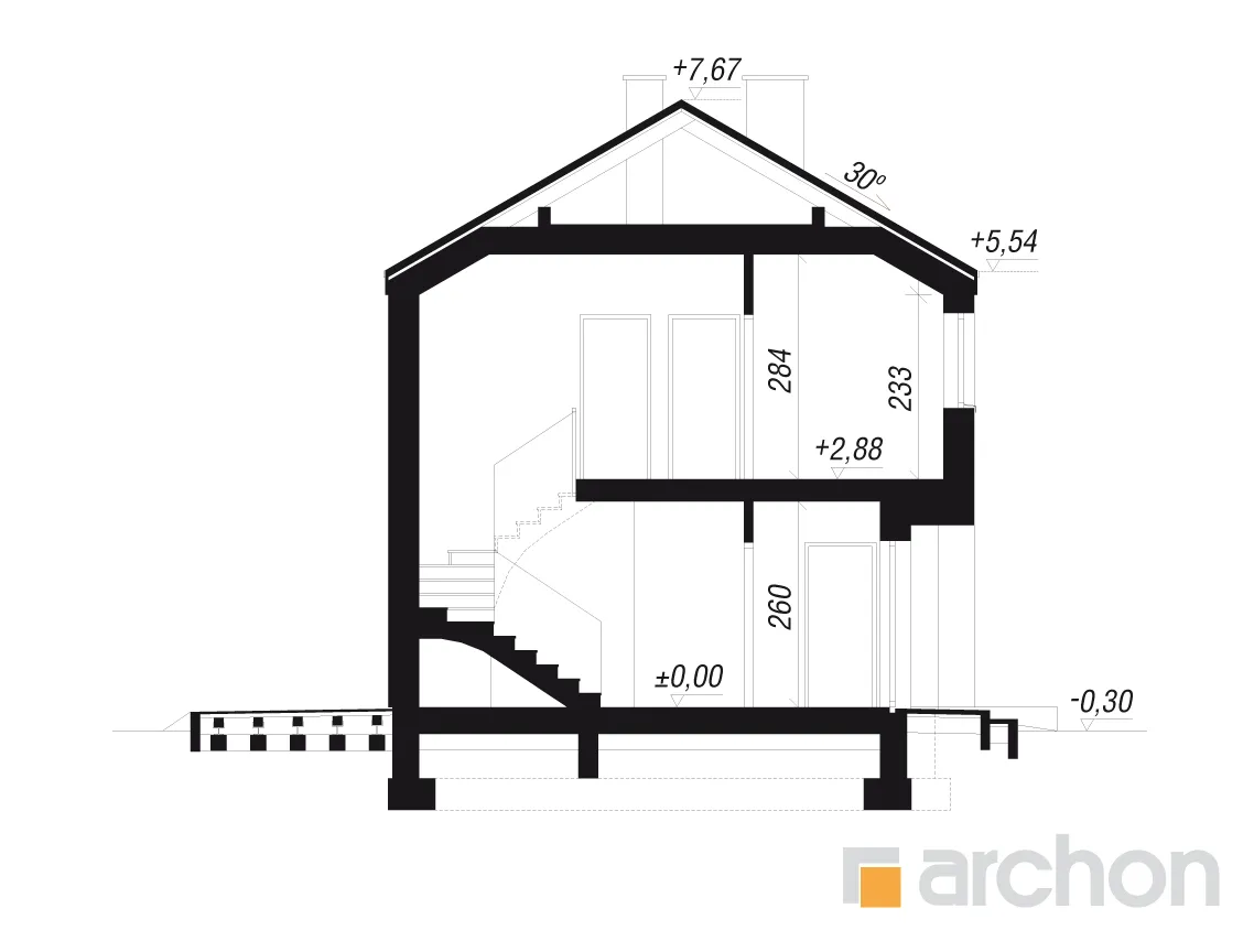 - Разрезы со всеми размерами (высоты этажей, кровли и др.)