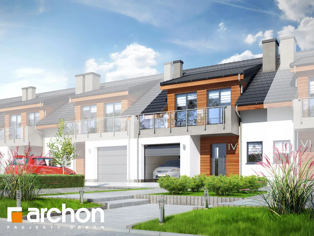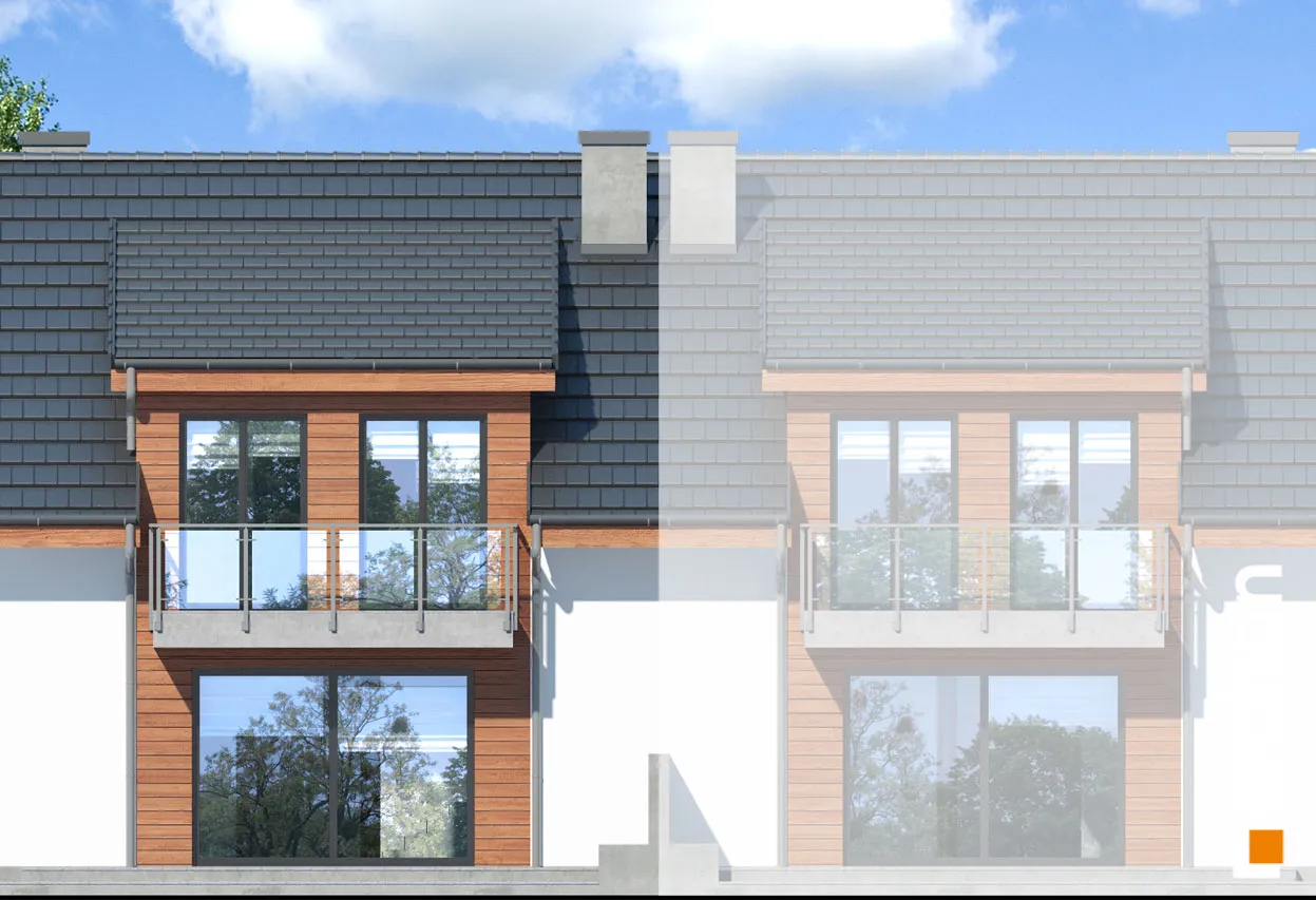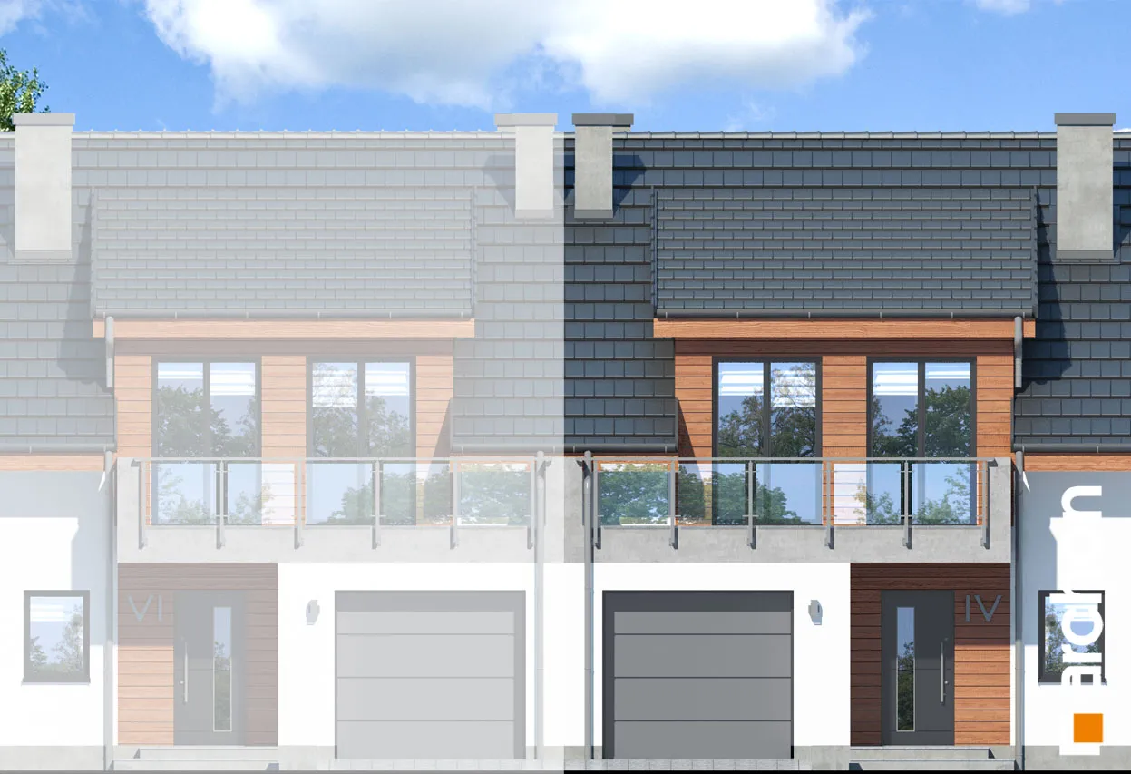 Проект дома с жилой мансардой, с небольшой шириной сегмента, который является интересным предложением для реализации на узких участках, предназначенных для рядовой застройки. Он относится к коллекции современных проектов домов. Характер здания подчеркивают деревянная облицовка, застекленные балюстрады, которые эффектно обнажаются на фоне светлой штукатурки. Двускатная крыша покрыта элегантной плоской черепицей антрацитового цвета. Прямоугольные мансардные окна - интересная деталь, обеспечивающая прекрасное освещение мансардных комнат. Выступающий гараж на переднем фасаде и балкон в мансарде практично защищают вход в здание. Каждый сегмент представляет собой функциональную программу и имеет гараж на 1 машину. Через тамбур и прихожую мы попадаем в жилую зону с гостиной, столовой и кухней - центр повседневной жизни жильцов. Широкий выход на террасу обеспечивает хорошее освещение внутренних помещений дома и естественным образом соединяет его с садом. Тщательно продуманная кухня имеет возможность установки высоких встроенных шкафов и удобную столешницу. На первом этаже также есть ванная комната. Гараж и котельная на твердом топливе доступны из вестибюля. Двойная лестница ведет в приватную зону в мансарде. В каждом сегменте частной зоны находится до четырех комнат, каждая из которых имеет выход на балкон и ванную комнату. Проект дома отличается высокой коленной стеной и прямоугольными мансардными окнами, которые делают комнаты более просторными, удачно расположенными и удобными для обустройства. Предоставляется достаточное пространство для сна и учебы.