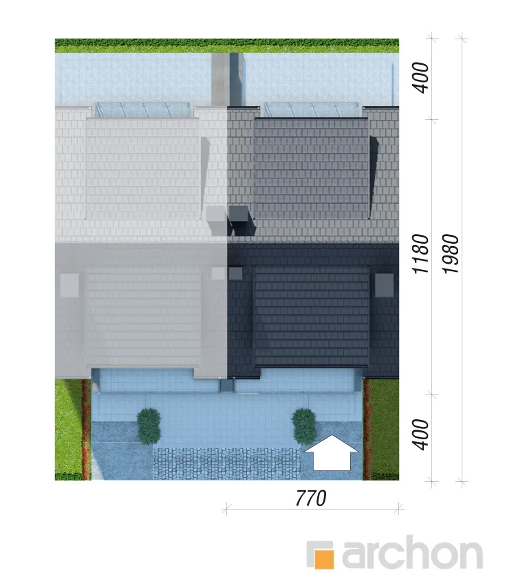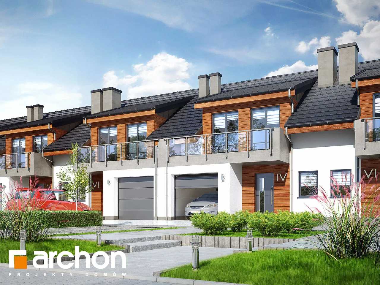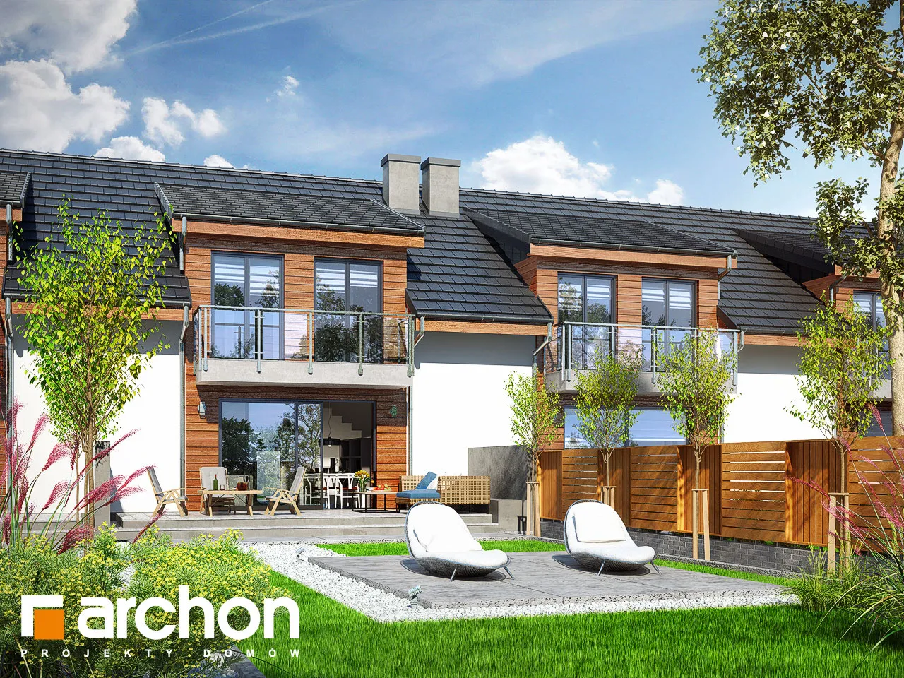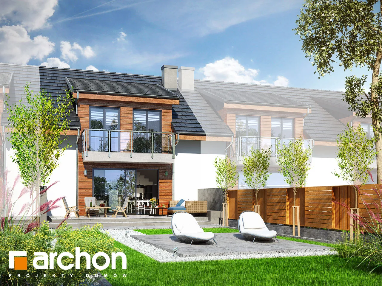 Проект дома с жилой мансардой, с небольшой шириной сегмента, который является интересным предложением для реализации на узких участках, предназначенных для рядовой застройки. Он относится к коллекции современных проектов домов. Характер здания подчеркивают деревянная облицовка, застекленные балюстрады, которые эффектно обнажаются на фоне светлой штукатурки. Двускатная крыша покрыта элегантной плоской черепицей антрацитового цвета. Прямоугольные мансардные окна - интересная деталь, обеспечивающая прекрасное освещение мансардных комнат. Выступающий гараж на переднем фасаде и балкон в мансарде практично защищают вход в здание. Каждый сегмент представляет собой функциональную программу и имеет гараж на 1 машину. Через тамбур и прихожую мы попадаем в жилую зону с гостиной, столовой и кухней - центр повседневной жизни жильцов. Широкий выход на террасу обеспечивает хорошее освещение внутренних помещений дома и естественным образом соединяет его с садом. Тщательно продуманная кухня имеет возможность установки высоких встроенных шкафов и удобную столешницу. На первом этаже также есть ванная комната. Гараж и котельная на твердом топливе доступны из вестибюля. Двойная лестница ведет в приватную зону в мансарде. В каждом сегменте частной зоны находится до четырех комнат, каждая из которых имеет выход на балкон и ванную комнату. Проект дома отличается высокой коленной стеной и прямоугольными мансардными окнами, которые делают комнаты более просторными, удачно расположенными и удобными для обустройства. Предоставляется достаточное пространство для сна и учебы.