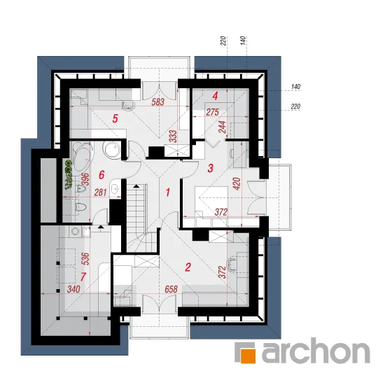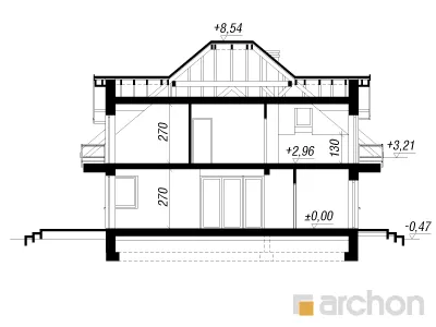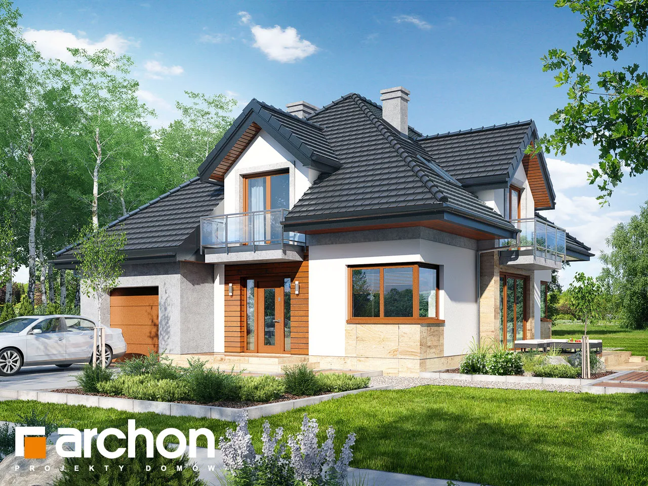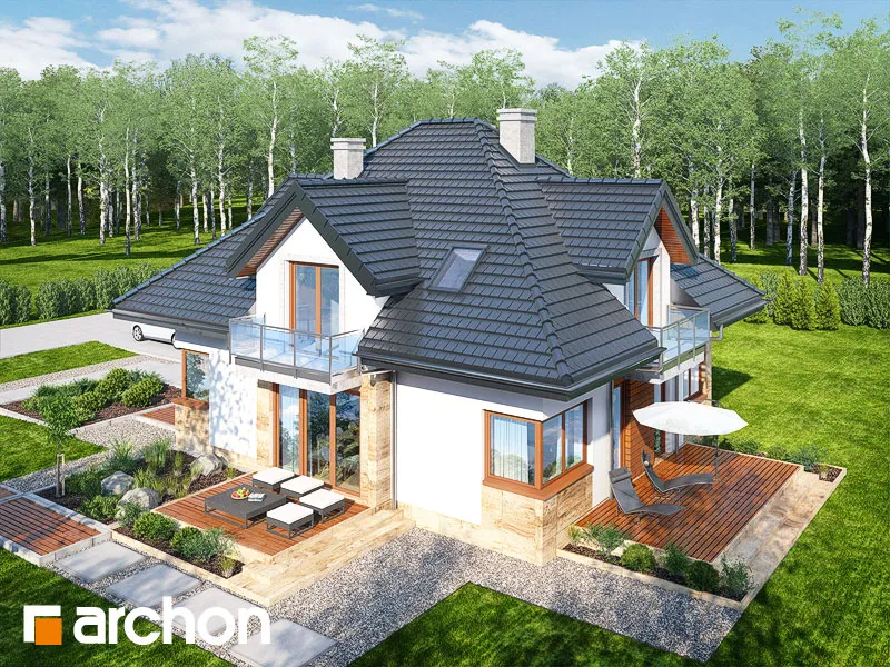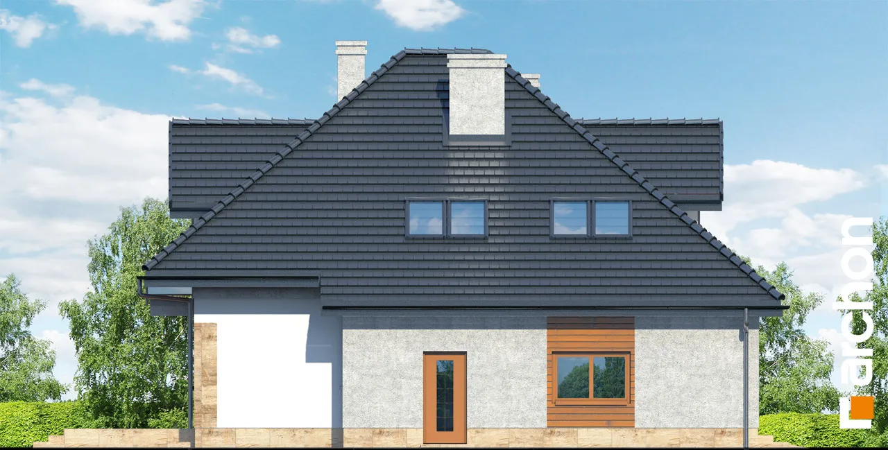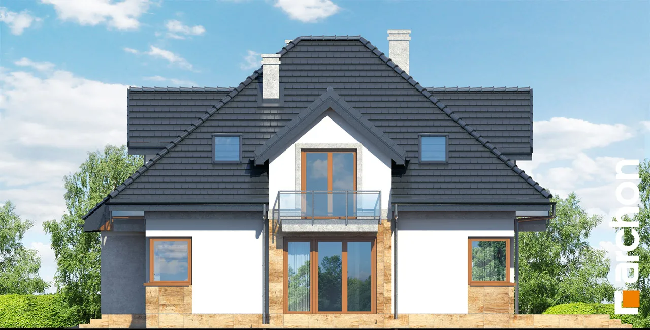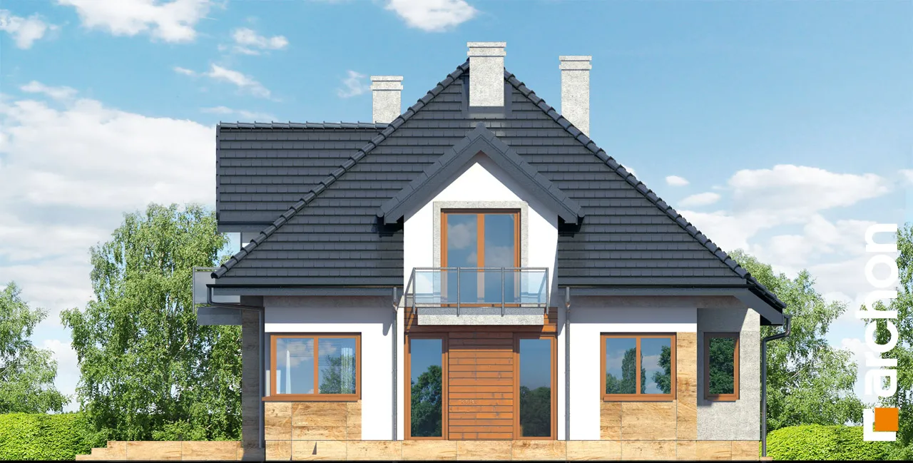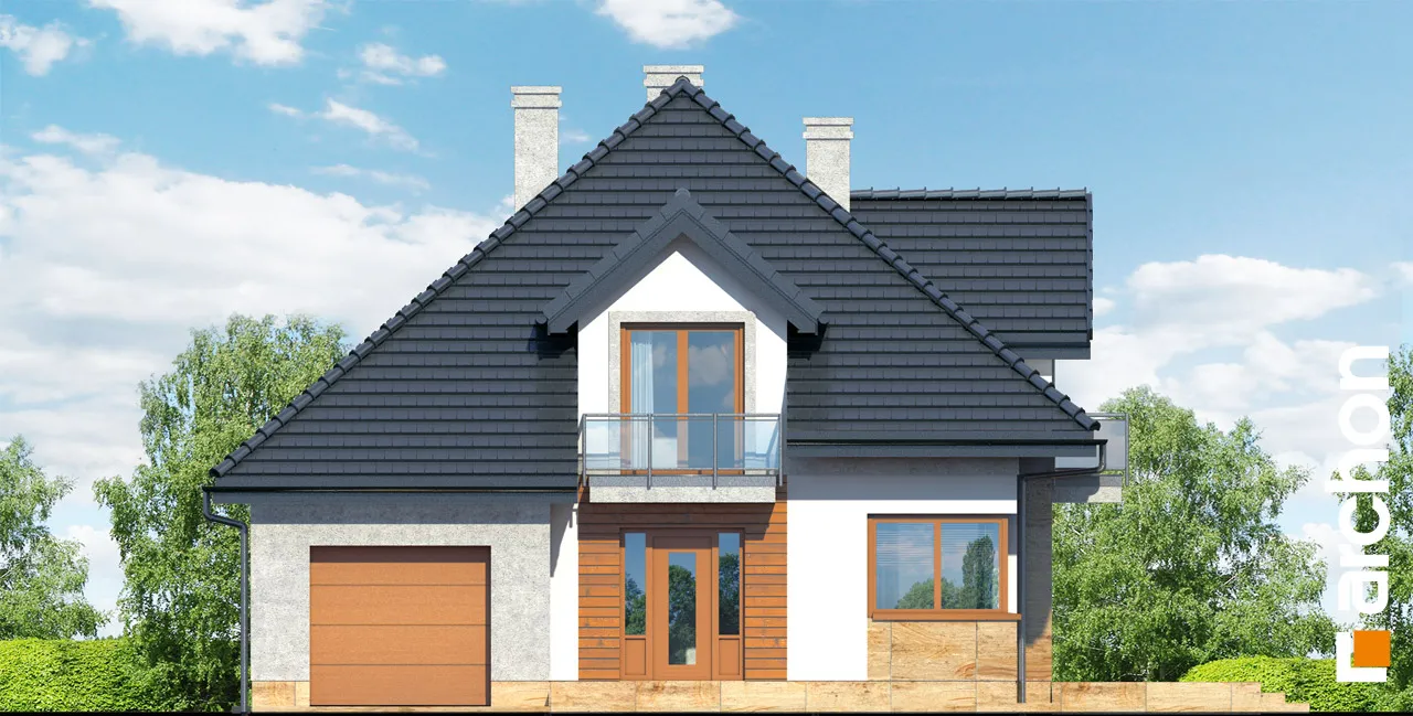 Очень красивый, оригинально спланированный дом с жилой мансардой и гаражом. Жилая зона в проекте дома представляет собой просторную гостиную с красивой столовой и широким выходом на террасу. Соединенная с полуоткрытой кухней, отделенной от гостиной барной стойкой, она создает место, располагающее к семейным встречам. Дополнительное освещение зоны отдыха с помощью углового остекления расширило перспективу и открыло вид на сад. В глубине дома была спроектирована спальня с удобным доступом к ванной комнате. Удобный тамбур с гардеробом ведет в гараж и расположенную за ним большую котельную на твердом топливе. В мансарде находятся три спальни с балконами, гардеробная и ванная комната с переходом в прачечную и сушильную комнату. Во всем доме отведено много места для хранения и складирования. Дом украшен интересными деревянными конструкциями и разделением фасада, подчеркнутым цветом и облицовкой.