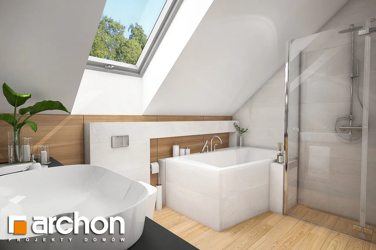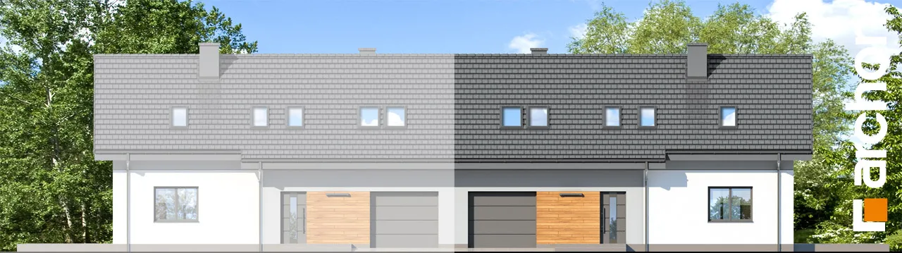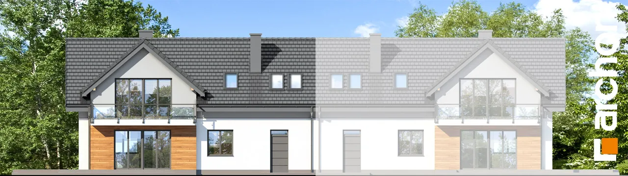 Это предложение из популярного семейства проектов "Домов в малиновках", рекомендованное инвесторам, заинтересованным в строительстве современного и функционального дома для сблокированной застройки. Здание привлекает внимание интересной отделкой фасада, цветовая гамма делает корпус здания более привлекательным, деревянная облицовка придает ему естественную выразительность. Каждый сегмент предлагает тщательно организованную программу удобств, оптимально адаптированную к различным потребностям жильцов. Прихожая практически отделяет жилую зону от хозяйственной зоны, которая в представленном проекте состоит из гаража на одну машину и газовой котельной. Жилая часть первого этажа прекрасно освещена, застекленная терраса обеспечивает широкий выход на улицу. Зона отдыха на открытом воздухе организована интересным образом, терраса, окружающая две стены дома, позволит вам отдыхать под солнечными лучами в разное время суток. Зона отдыха в гостиной плавно соединяется со столовой, которая непосредственно примыкает к кухне. Предлагаемая программа кухонной зоны отличается тщательно продуманной организацией отдельных функций, обеспечивающих комфортную работу для двух человек. Достоинством "Дома в Малиновках 5 (Б)" является гостевая зона, спроектированная на первом этаже, которая состоит из комнаты и прилегающей ванной комнаты. В спальной зоне, в уединении трех спален, жильцы имеют оптимальные условия для индивидуального отдыха и работы. Особенно привлекательна спальня родителей, пространство которой увеличено и открыто для внешнего обзора благодаря большому мансардному этажу с балконом. Здесь достаточно места, чтобы организовать зону для чтения с удобными креслами, а также рабочий стол или туалетный столик. В главной спальне есть просторная гардеробная, где система полок и штанг обеспечит удобное хранение одежды. Функциональная планировка ночной зоны дополняется светлой ванной комнатой и прачечной. "Дом в малиновках 5 (Б)" - это очень интересное предложение из коллекции: проекты домов для сблокированной застройки, он также относится к категории: проекты небольших домов, проекты домов с жилой мансардой и проекты современных домов.