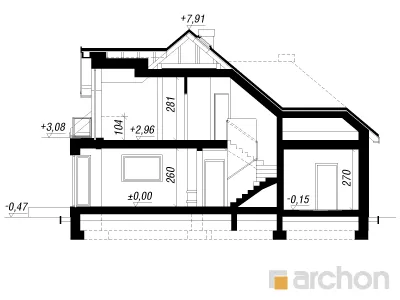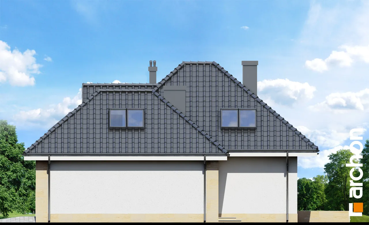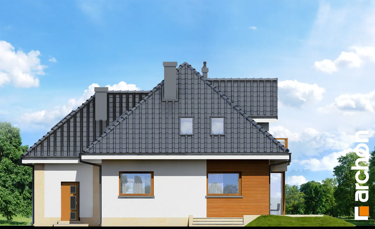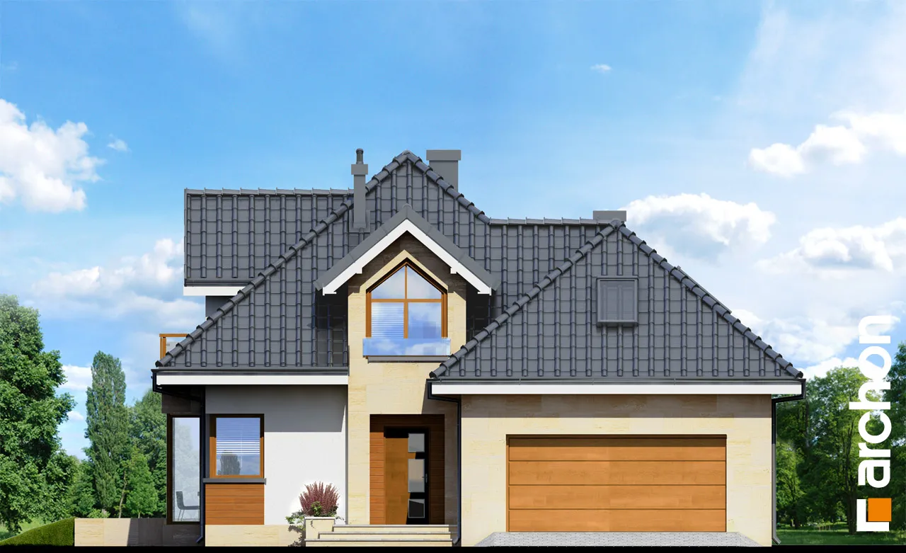 Красивый, современный дом с гаражом и мансардой. На первом этаже находится просторная гостиная с застекленным эркером, центрально расположенным камином и проходом на террасу, а также открытая кухня. На первом этаже также расположены дополнительная комната и подсобное помещение, за которым находится гараж на две машины и котельная. Отдельные комнаты в мансарде включают три комнаты с гардеробной и ванной комнатой с естественным освещением. На чердак можно попасть дополнительно из комнаты над входом. Удобный, функционально спланированный дом. Входная зона, подчеркнутая мансардным окном, выделена облицованной камнем стеной. Выразительное обрамление входа и повторение фактуры в формально важных местах придают зданию индивидуальный характер.