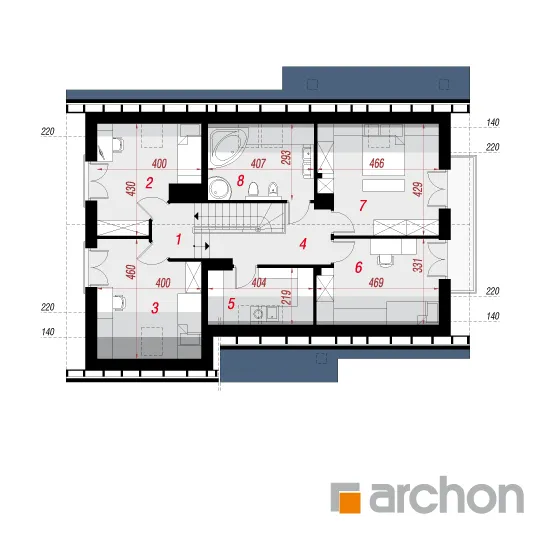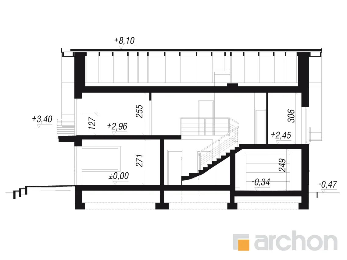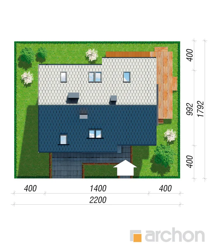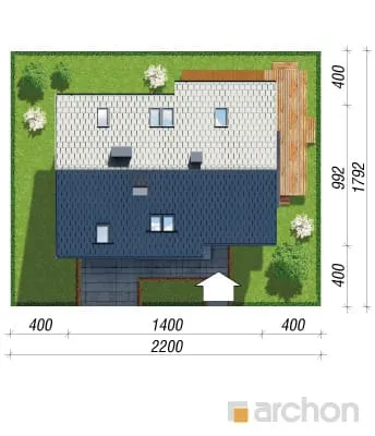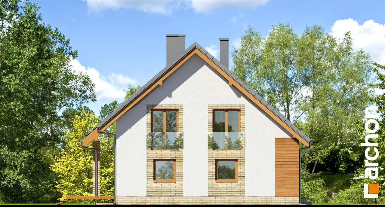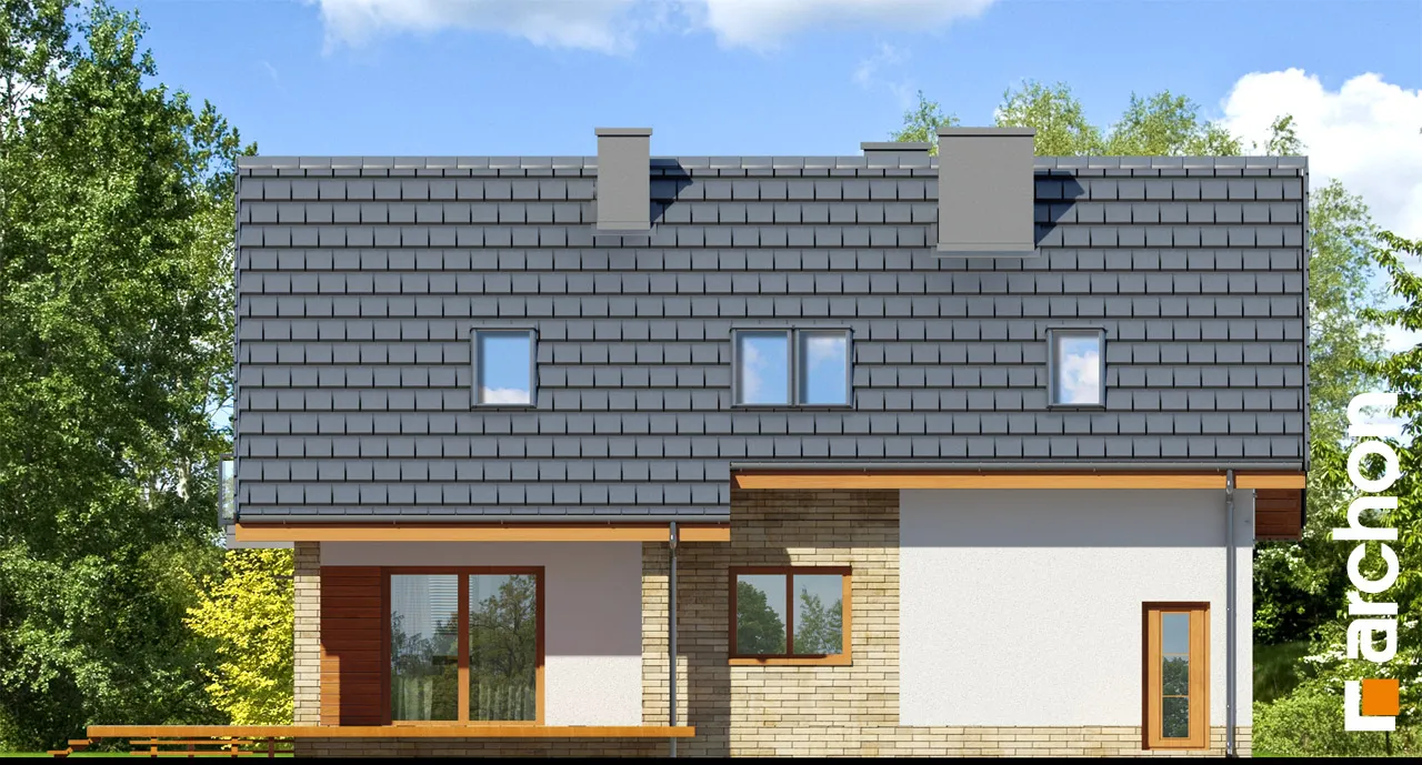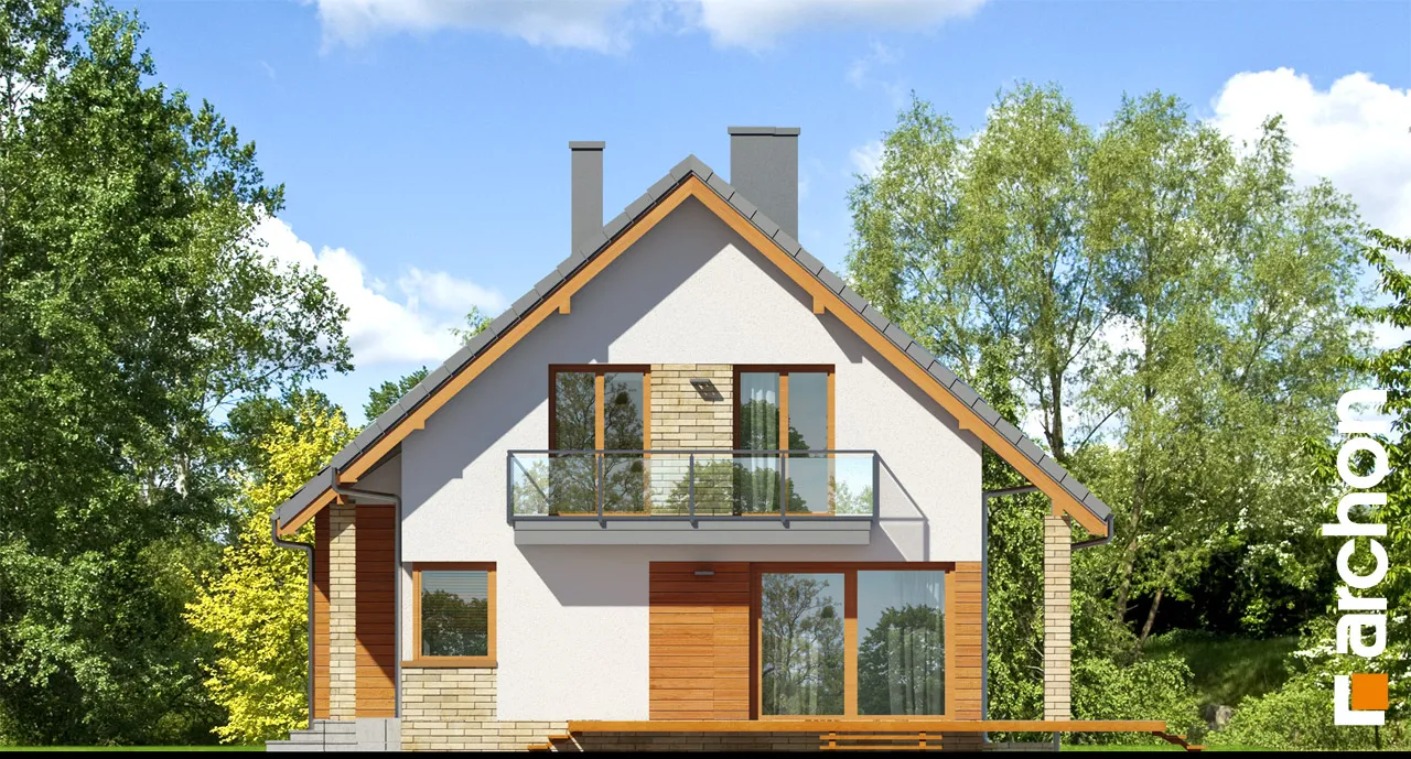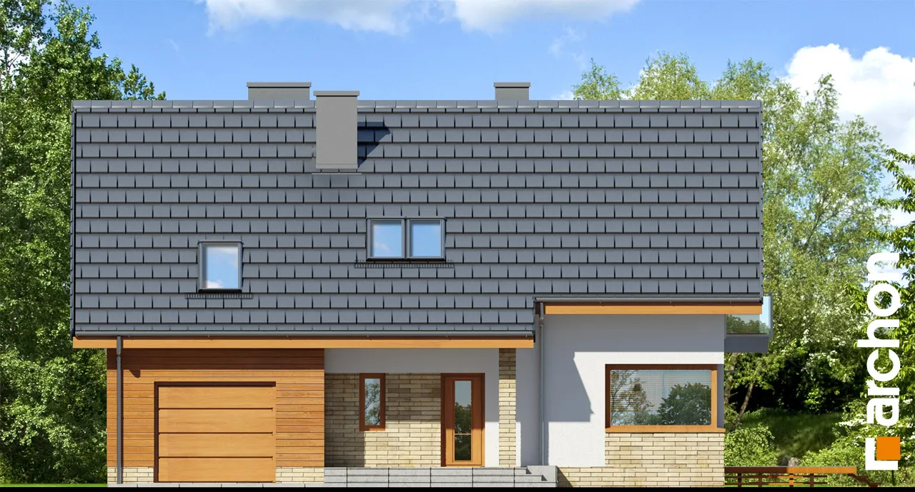 Элегантный дом с простым корпусом, привлекающий внимание изысканной отделкой фасада и кровли террасы и входа. Достоянием жилой зоны является представительная, эффектно освещенная гостиная. Здесь есть место для просторной гостиной с домашним кинотеатром и камином, а также для светлой столовой. Большие балконные двери ведут на террасу, которая, благодаря частичному навесу, является естественным продолжением зоны отдыха дома. Функциональная барная стойка соединяет столовую с кухней, программу которой дополняет практичная кладовая. Подсобная зона включает гараж и котельную на твердом топливе с отдельным выходом. Двойная лестница ведет в мансарду, где находятся четыре уютные, хорошо освещенные комнаты, прачечная и удобная ванная комната.