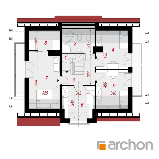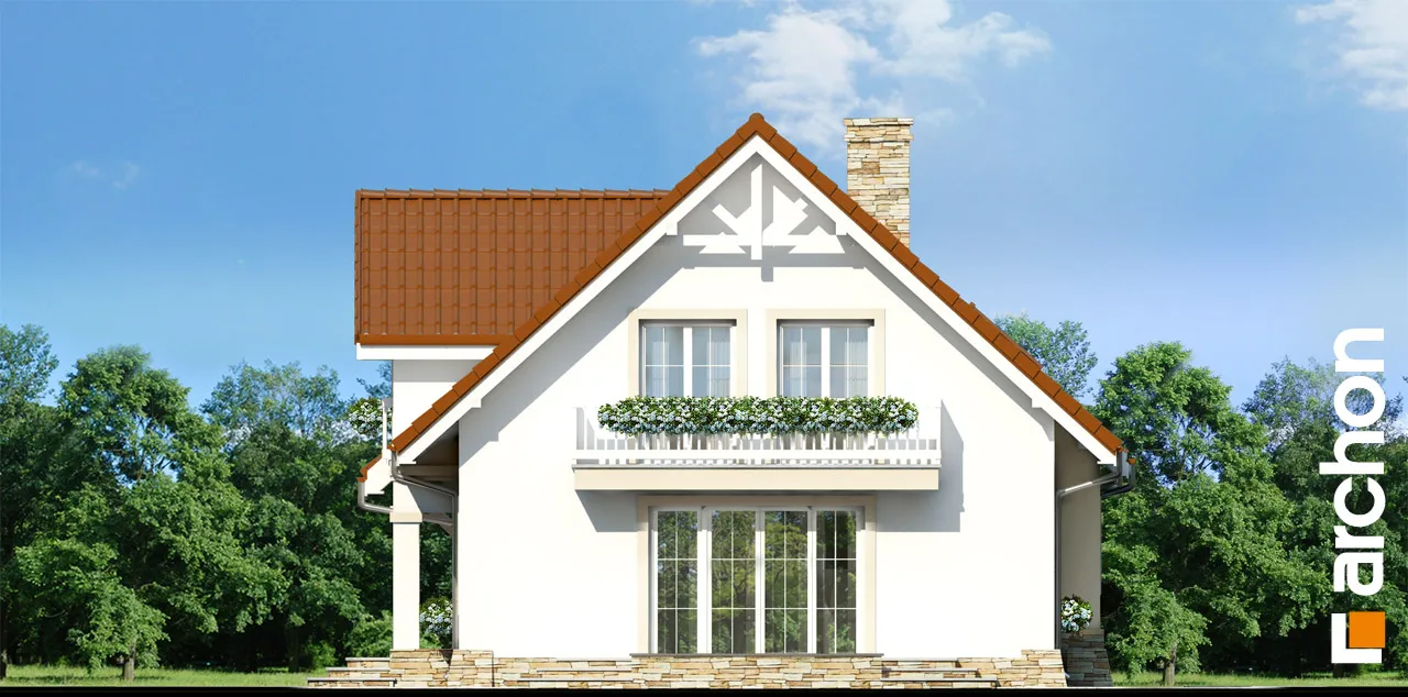 Экономичный проект дома с простым корпусом, покрытым двускатной крышей. Передняя часть здания отличается центрально расположенным главным входом, который практически перекрыт эркером, поддерживаемым колоннами. Клинкерная облицовка приглушенных тонов хорошо сочетается с белой штукатуркой, а полосы вокруг окон и деревянные балюстрады подчеркивают классический стиль отделки. Терраса, спланированная на боковой стороне дома, частично закрыта балконом над ней. Благодаря расположению гостиной дом идеально вписывается в участки с входом с юга. Проект также отличается современным вариантом внешнего дизайна. Прихожая с местом для встроенного шкафа вводит нас в презентативную жилую зону. В просторной гостиной можно свободно разделить несколько отдельных зон отдыха. Здесь вы найдете угловой диван у домашнего кинотеатра, скамью с креслами у камина и большой семейный стол, который можно разложить для праздников или других торжеств. Панорамное остекление естественно освещает интерьер и плавно соединяет его с просторной террасой, где можно организовать летнюю обеденную зону или кофейный уголок. Открытая кухня с оптимальным количеством рабочих поверхностей и функциональной зоной для завтрака дополнена вместительной кладовой. Подсобное помещение доступно из тамбура и состоит из гаража с одним парковочным местом и котельной, совмещенной с прачечной. В мансарде была спроектирована ночная зона, где разместились четыре хорошо расположенные спальни и ванная комната с угловой ванной и душем. Благодаря использованию высоких балконных дверей все комнаты очень хорошо освещены, а в спальне родителей есть своя гардеробная. Представленный проект дома относится к категории: проекты небольших домов, проекты домов с входом с юга и с жилой мансардой.
