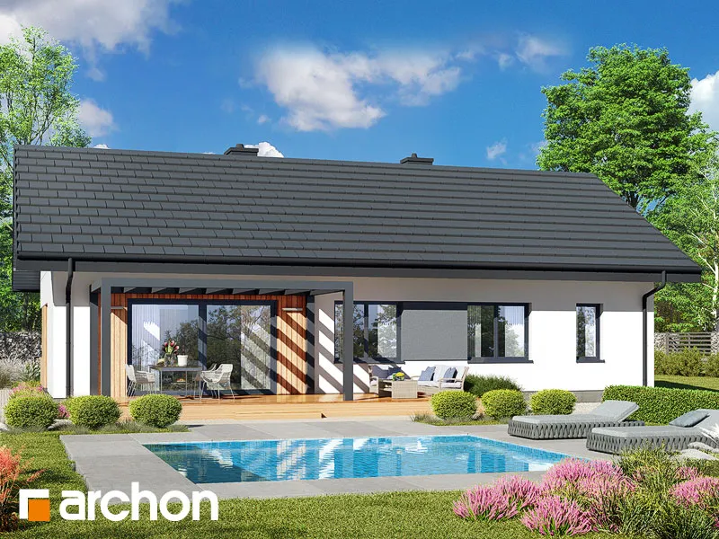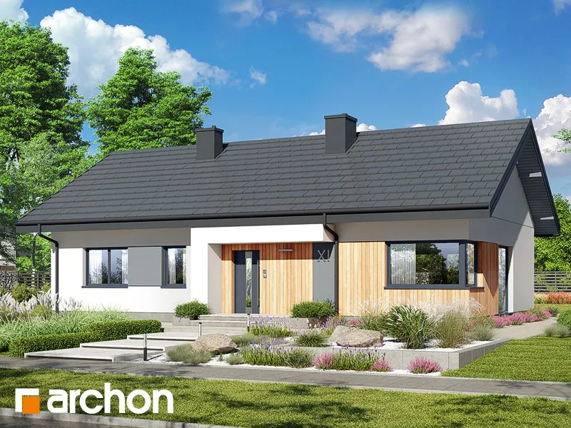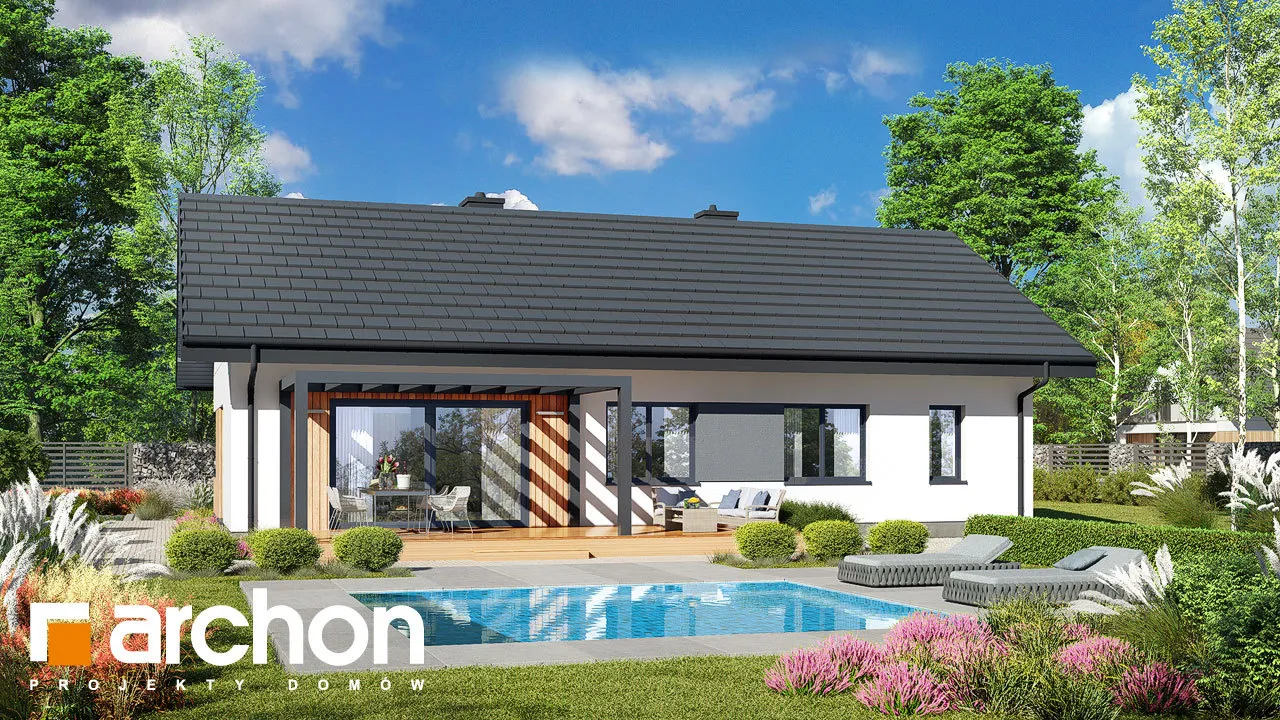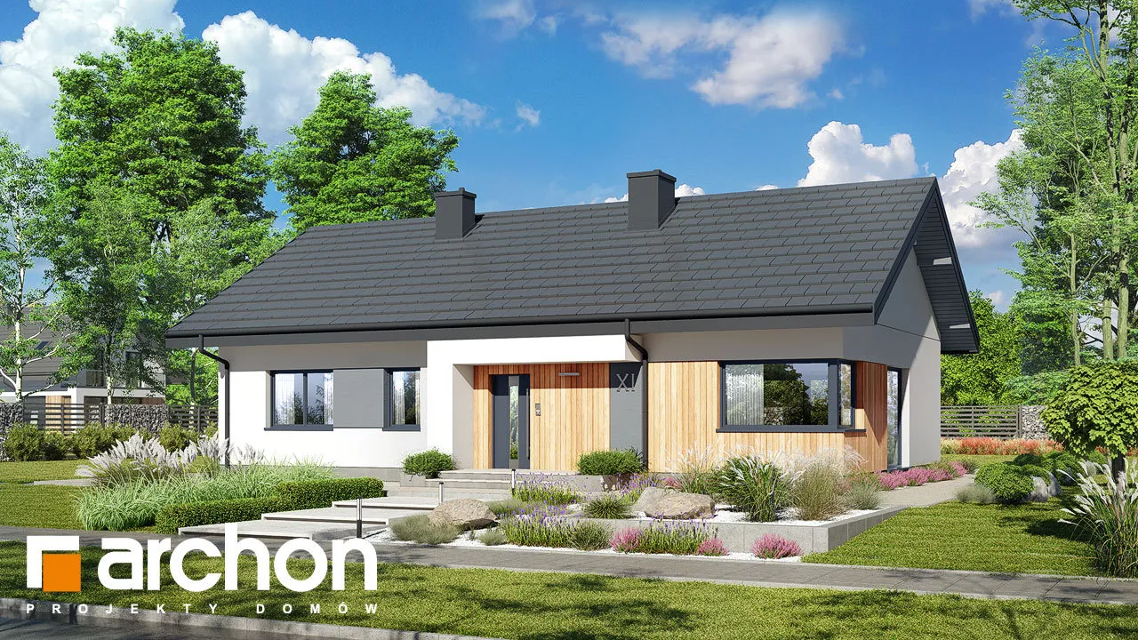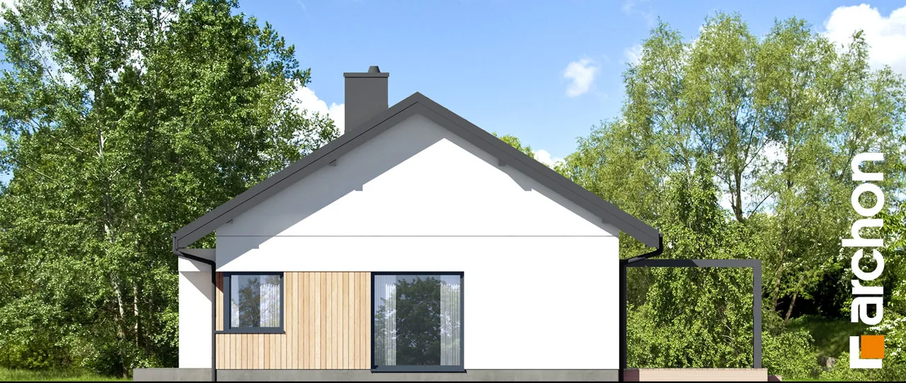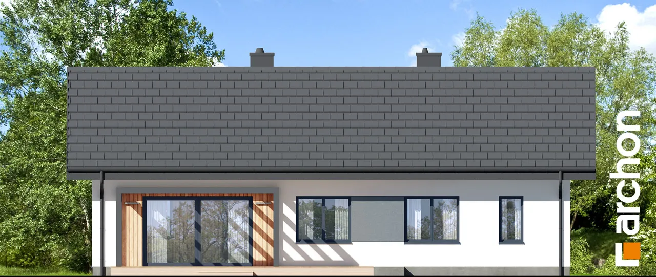 Представленный проект современного одноэтажного дома - еще одно предложение от семейства "Дома в лещиновнике". Это здание с простым корпусом с двускатной крышей и продуманной планировкой помещений, которое предлагает жильцам чрезвычайно функциональный интерьер с четко определенными зонами использования. Современный характер дома подчеркивается большим остеклением и красивым фасадом, который представляет собой композицию из белой и графитовой штукатурки, натуральной деревянной облицовки и деревянных конструкций и плитки графитового оттенка. Главный вход защищен плоским навесом, который служит интересным украшением этой зоны. В прихожей предусмотрено место для двух шкафов, а еще один можно спланировать дальше по коридору. Открытое пространство жилой зоны заполнено гостиной с обеденной зоной и кухней. В гостиной предусмотрено место для большого углового дивана и встроенного шкафа для хранения семейных сувениров или книг. Семейный стол можно накрыть у большого окна на боковой стороне дома. Раздвижное стеклянное окно соединяет гостиную с террасой, защищенной современной перголой, где можно организовать летнюю столовую и зону отдыха. В холодные дни интерьер дома приобретет уютную атмосферу благодаря камину, расположенному в его центре. К кухне примыкает кладовая с угловым окном и функциональными столешницами, а большой остров обеспечивает дополнительное пространство для приготовления и приема пищи. На частной территории расположены три хорошо обставленные спальни и удобная полностью оборудованная ванная комната. Спальня родителей с отдельной гардеробной и одна из детских комнат спроектированы со стороны сада, а другая детская комната находится на противоположной стороне коридора. Во всех комнатах предусмотрено место для кроватей, письменных столов, шкафов и книжных шкафов. В хозяйственной программе дома также предусмотрена газовая котельная, совмещенная с удобной прачечной, сушильной и гладильной комнатой. Доступ из холла, ванная комната с душем расположена рядом с гостиной. "Дом в лещиновнике 10" - это проект из категории: проекты современных домов, проекты одноэтажных домов, проекты домов с двускатной крышей. Мы также рекомендуем другие варианты проектов из этого семейства домов.