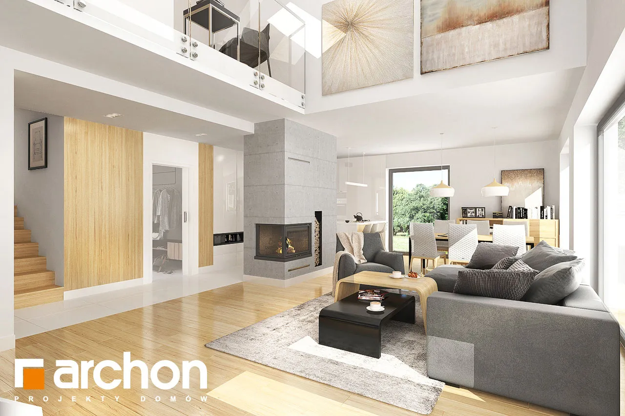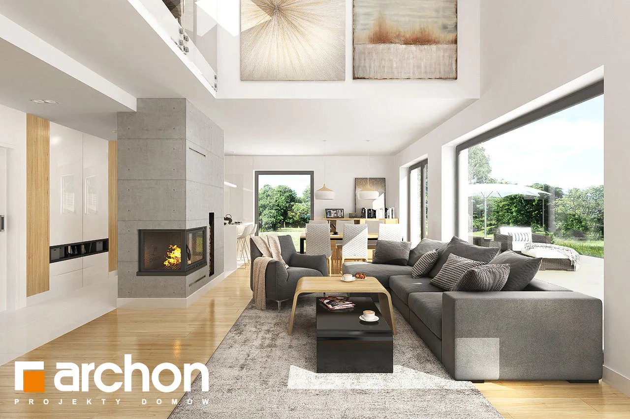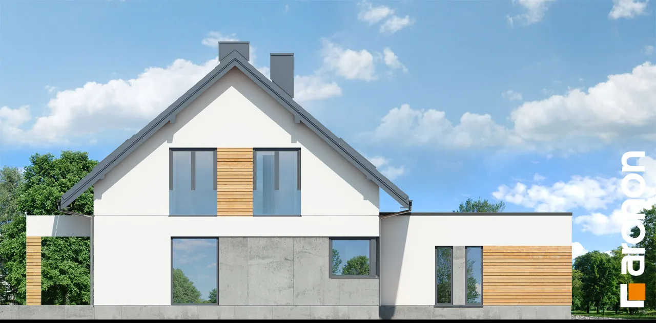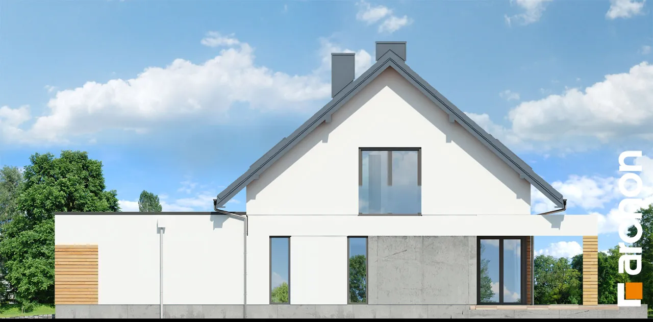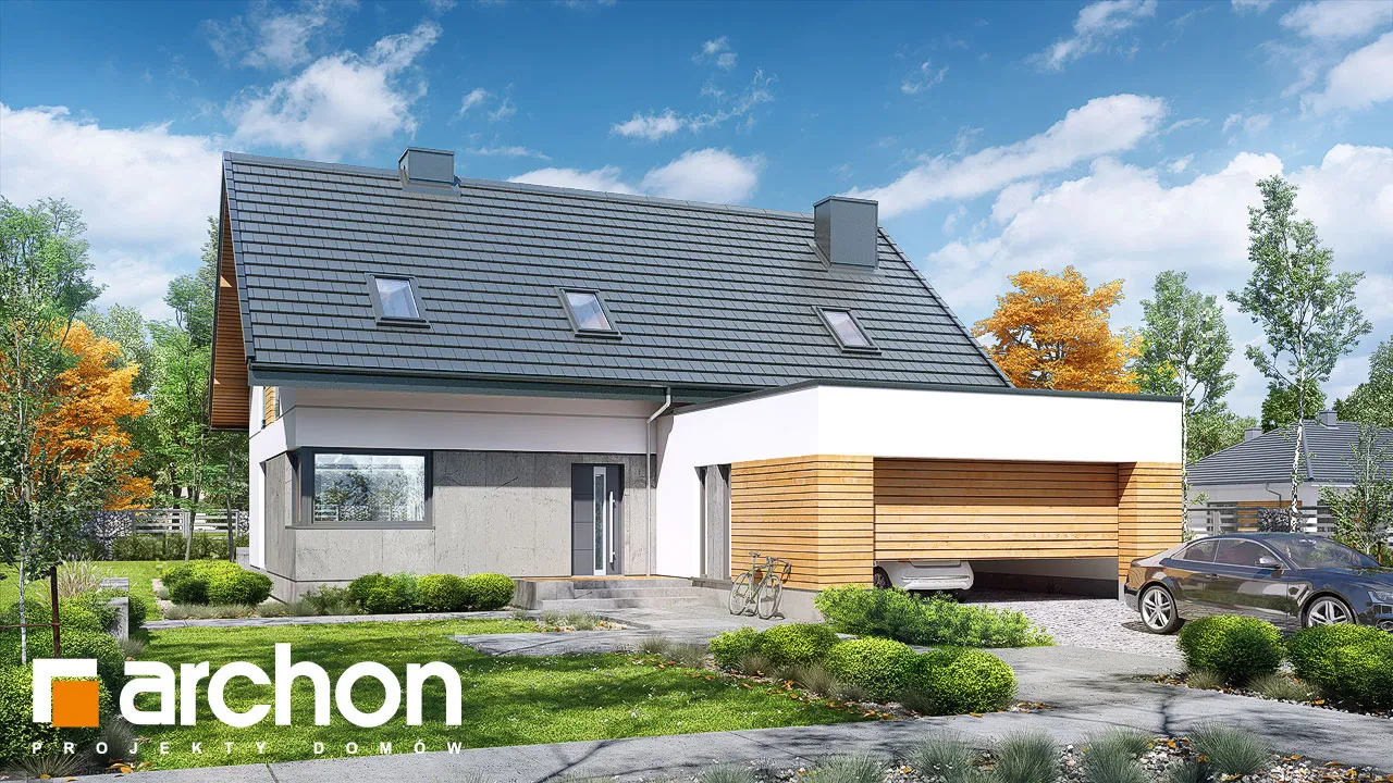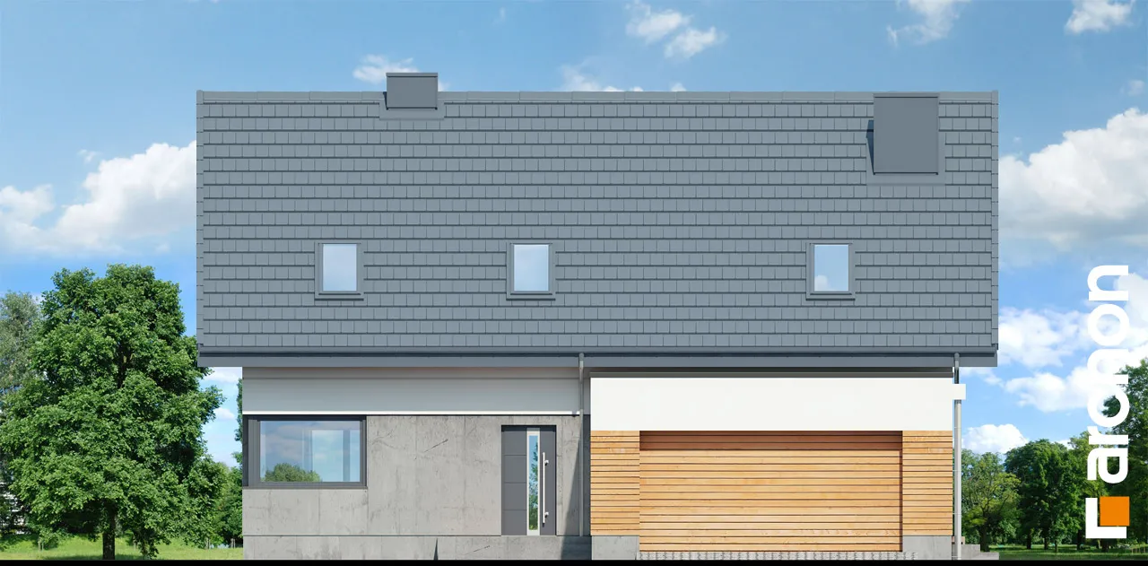 Привлекательный проект дома с жилой мансардой и четко выделенным и выдвигающимся вперед просторным гаражом на две машины. Современный дизайн экстерьера сочетает модную белую отделку с натуральными отделочными материалами, что придает зданию яркий внешний вид. На этом фоне прекрасно смотрятся столярные изделия стального цвета, идеально сочетающиеся с тоном плоской черепицы, покрывающей скатную крышу. Здание спроектировано с большим остеклением в садовой зоне, благодаря чему интерьер дома прекрасно освещен. Просторная терраса, доступная из разных частей первого этажа, дает жильцам возможность организовать привлекательную зону отдыха на свежем воздухе. В центральной части гостиной расположен камин, который привносит в интерьер атмосферу уюта и одновременно организует пространство, оптически закрывая зону кухни. В гостиной установлен удобный набор мебели для отдыха, который располагает семью к совместному проведению свободного времени. Над гостиной предусмотрен антресольный этаж, который подчеркивает эстетические качества дома, усиливая впечатление простора в интерьере. В обеденной зоне, помимо большого стола, есть место для серванта для хранения столовых сервизов и столовых приборов. Оптимальное количество рабочих поверхностей, высокие встроенные шкафы, барная стойка и кладовая делают кухню очень функциональной и удобной для ежедневного использования. Ванная комната была спроектирована рядом с дополнительной комнатой на первом этаже, создавая удобную гостевую зону. Подсобные помещения дома включают гараж на две машины и котельную, доступ к которой осуществляется через просторную прачечную с местом для сушки белья. Мансарда "Дом в сантине (Г2)" - это приватная зона для владельцев дома, где комфортный отдых обеспечивают три хорошо освещенные спальни. Детские комнаты с общим балконом четко отделены от зоны родителей, которая была спроектирована как апартаменты с гардеробной и большой ванной комнатой. Вторая ванная комната, общая для всех жильцов, доступна из прихожей, из которой открывается привлекательный вид на зону отдыха на первом этаже. Этот исключительный проект дома на одну семью относится к категориям: проекты современных домов, проекты домов с антресолью и проекты домов с гаражом на две машины.