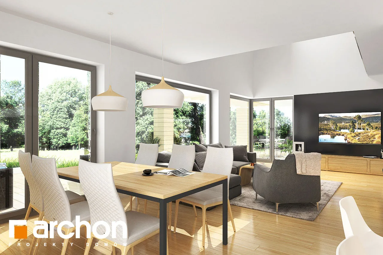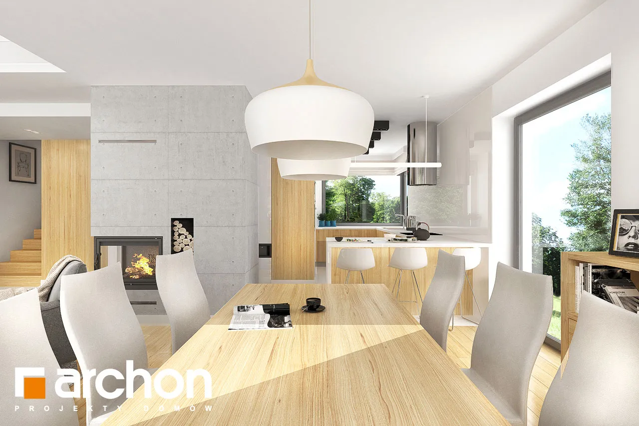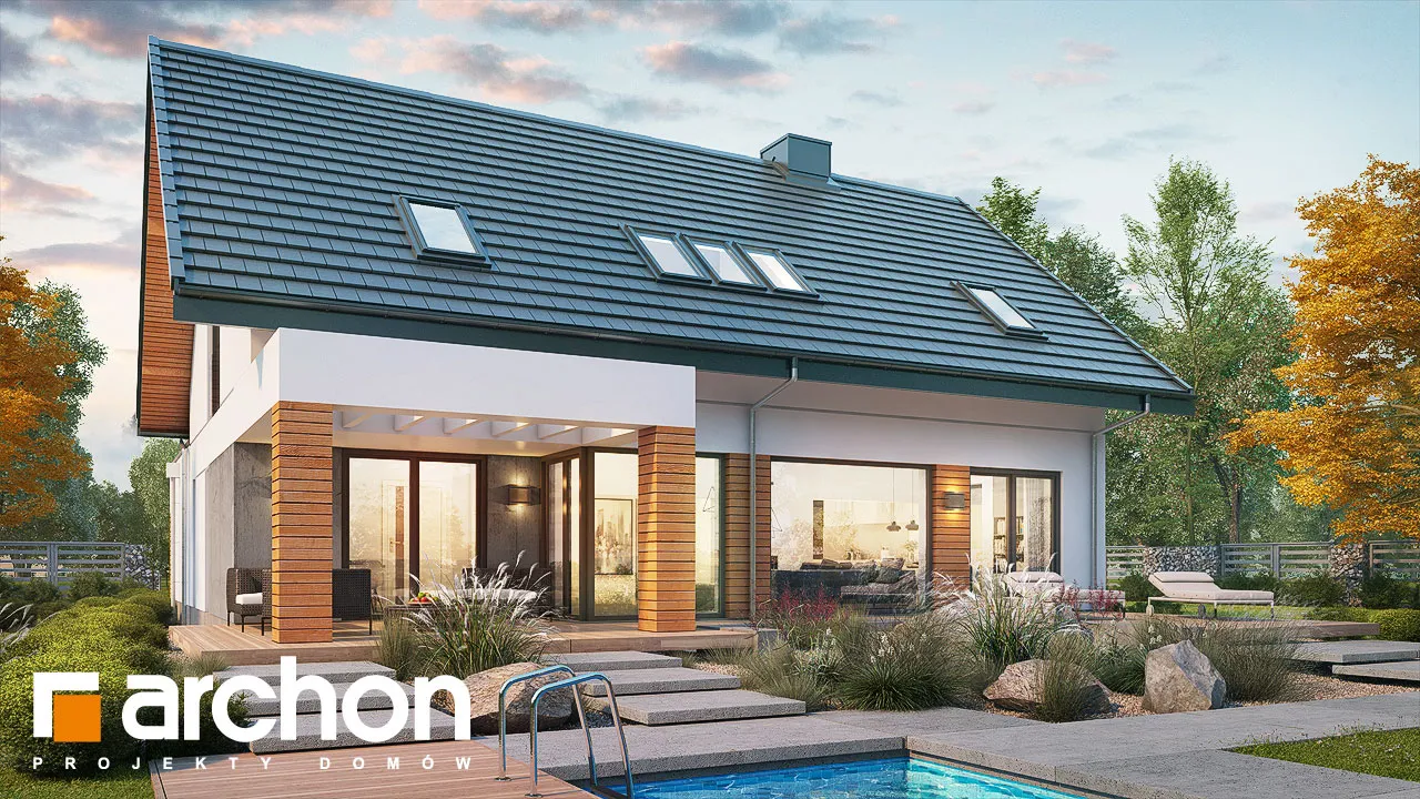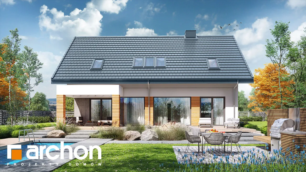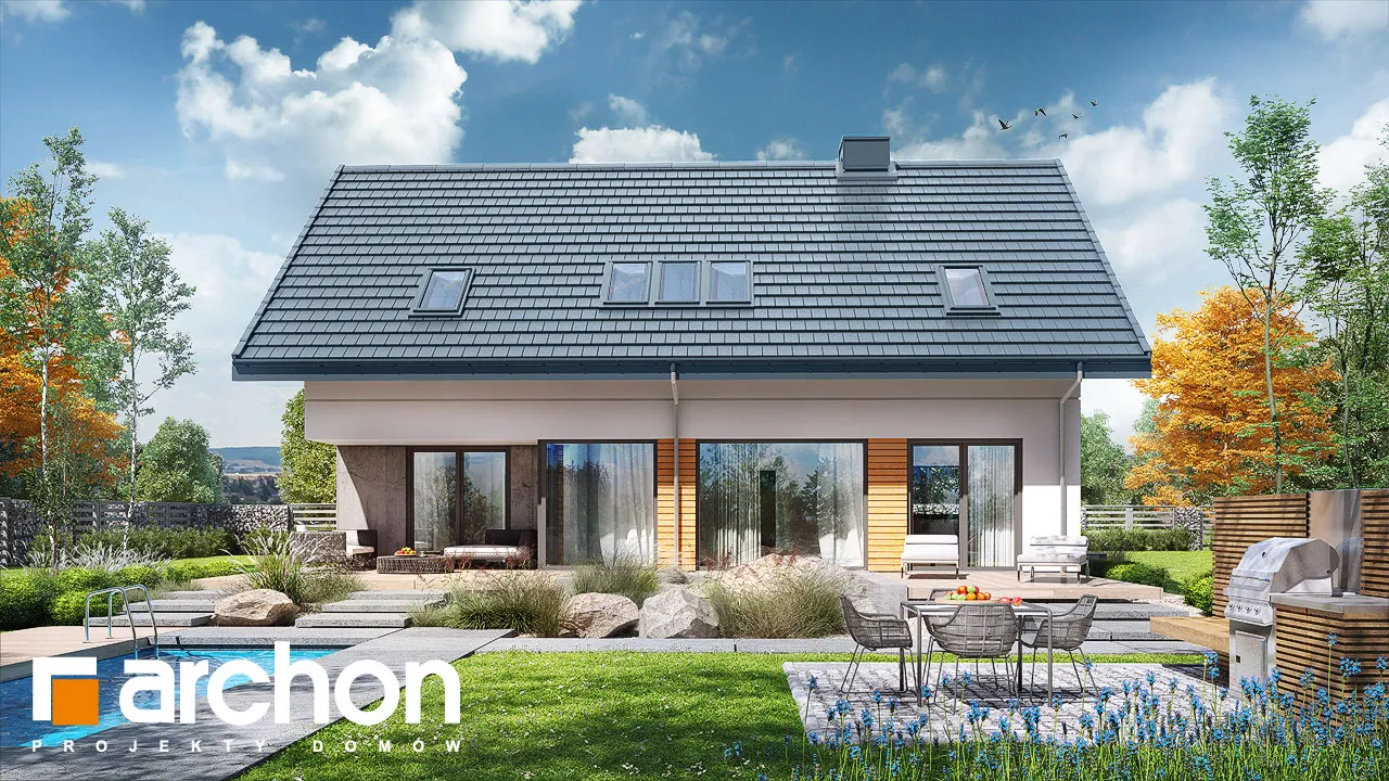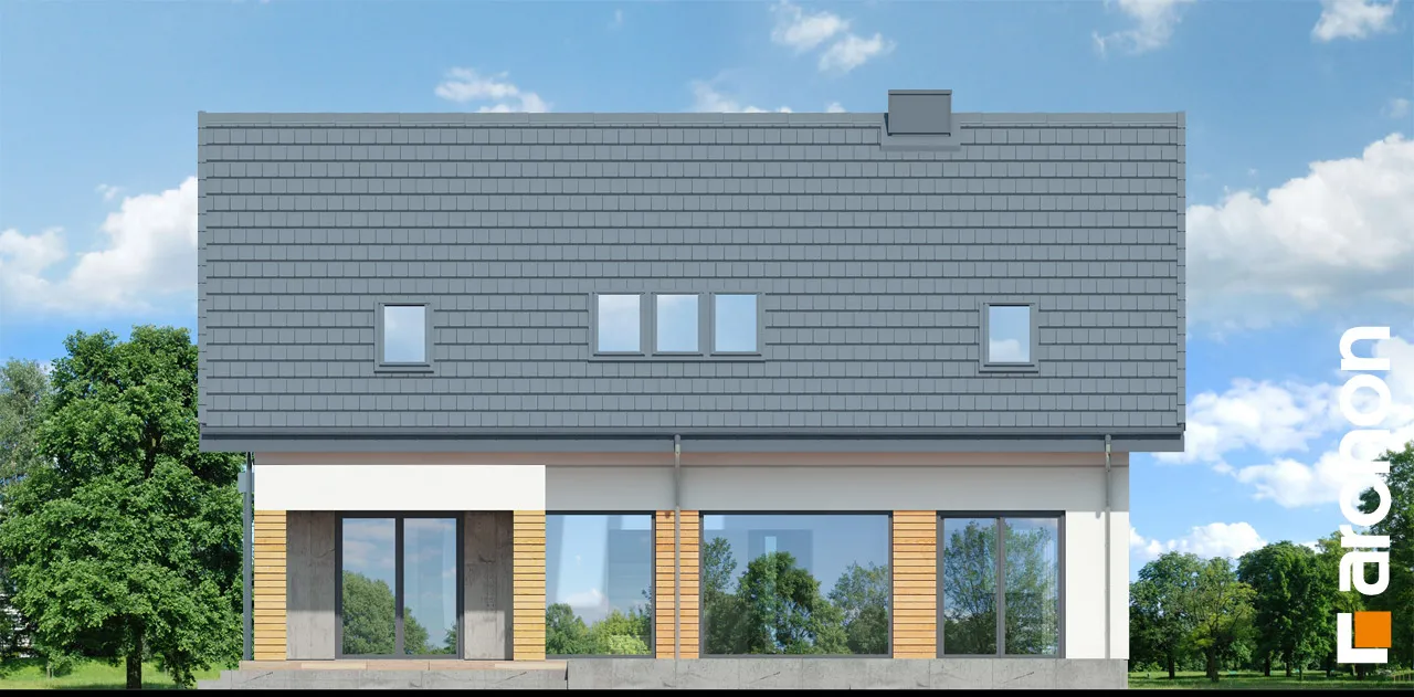 Привлекательный проект дома с жилой мансардой и четко выделенным и выдвигающимся вперед просторным гаражом на две машины. Современный дизайн экстерьера сочетает модную белую отделку с натуральными отделочными материалами, что придает зданию яркий внешний вид. На этом фоне прекрасно смотрятся столярные изделия стального цвета, идеально сочетающиеся с тоном плоской черепицы, покрывающей скатную крышу. Здание спроектировано с большим остеклением в садовой зоне, благодаря чему интерьер дома прекрасно освещен. Просторная терраса, доступная из разных частей первого этажа, дает жильцам возможность организовать привлекательную зону отдыха на свежем воздухе. В центральной части гостиной расположен камин, который привносит в интерьер атмосферу уюта и одновременно организует пространство, оптически закрывая зону кухни. В гостиной установлен удобный набор мебели для отдыха, который располагает семью к совместному проведению свободного времени. Над гостиной предусмотрен антресольный этаж, который подчеркивает эстетические качества дома, усиливая впечатление простора в интерьере. В обеденной зоне, помимо большого стола, есть место для серванта для хранения столовых сервизов и столовых приборов. Оптимальное количество рабочих поверхностей, высокие встроенные шкафы, барная стойка и кладовая делают кухню очень функциональной и удобной для ежедневного использования. Ванная комната была спроектирована рядом с дополнительной комнатой на первом этаже, создавая удобную гостевую зону. Подсобные помещения дома включают гараж на две машины и котельную, доступ к которой осуществляется через просторную прачечную с местом для сушки белья. Мансарда "Дом в сантине (Г2)" - это приватная зона для владельцев дома, где комфортный отдых обеспечивают три хорошо освещенные спальни. Детские комнаты с общим балконом четко отделены от зоны родителей, которая была спроектирована как апартаменты с гардеробной и большой ванной комнатой. Вторая ванная комната, общая для всех жильцов, доступна из прихожей, из которой открывается привлекательный вид на зону отдыха на первом этаже. Этот исключительный проект дома на одну семью относится к категориям: проекты современных домов, проекты домов с антресолью и проекты домов с гаражом на две машины.