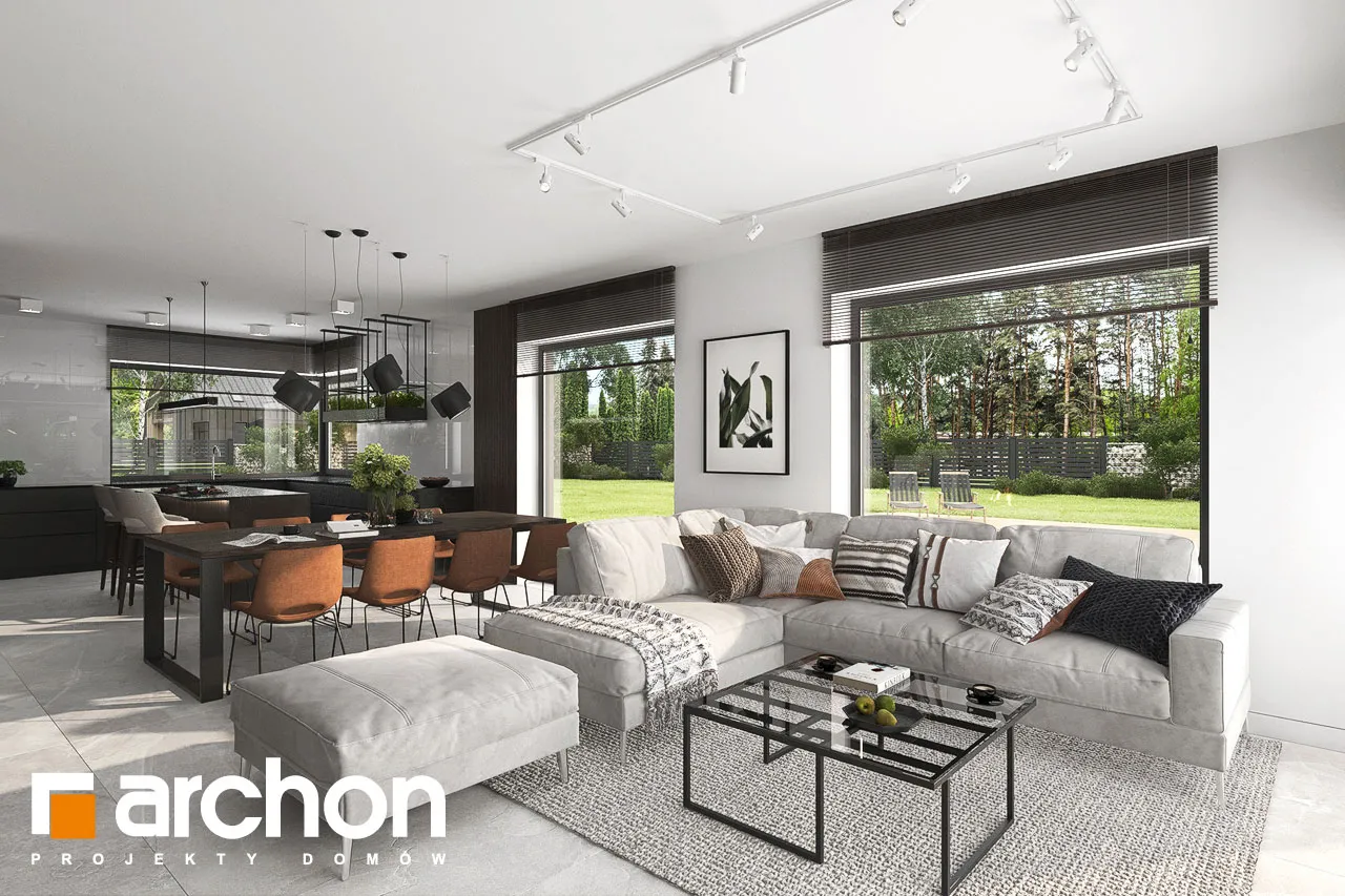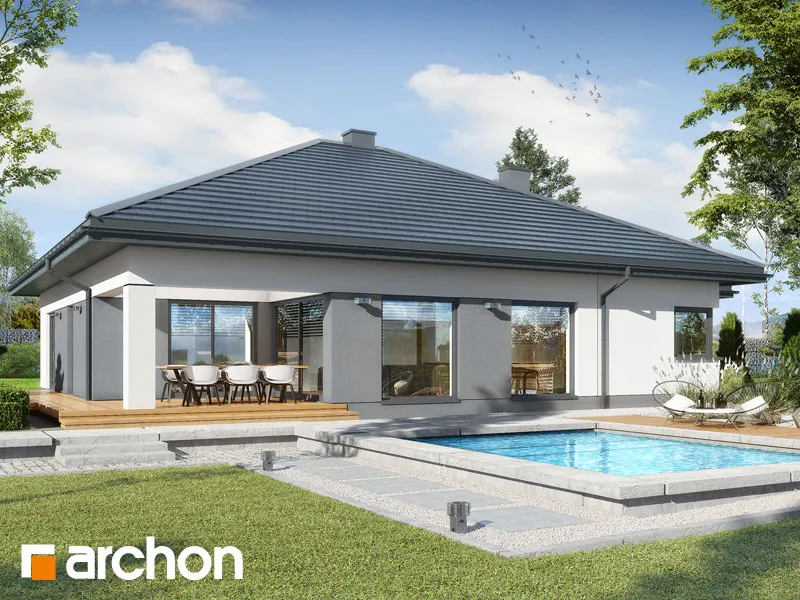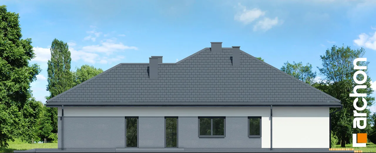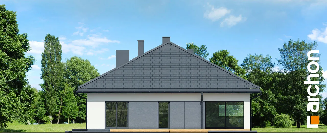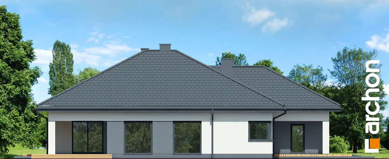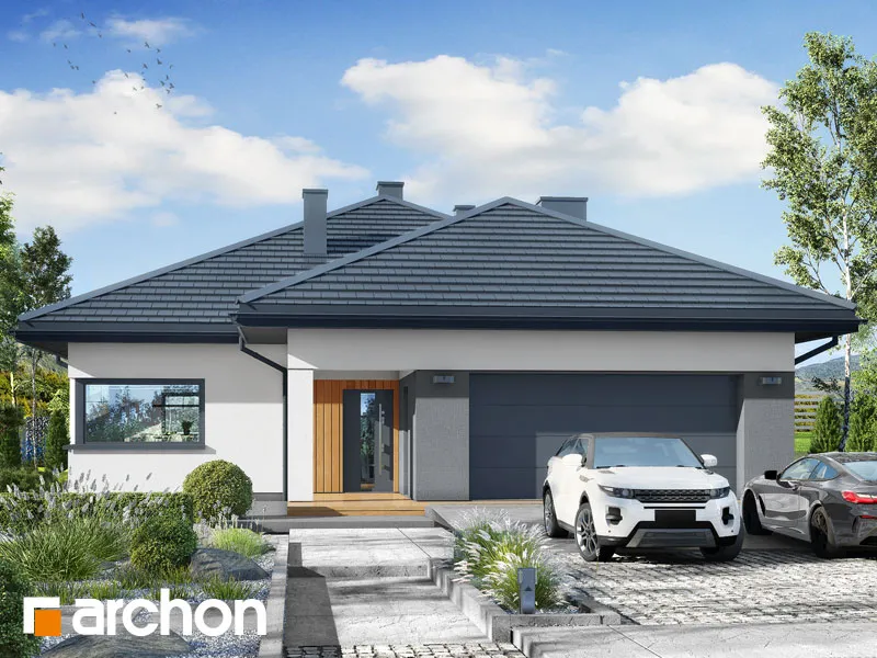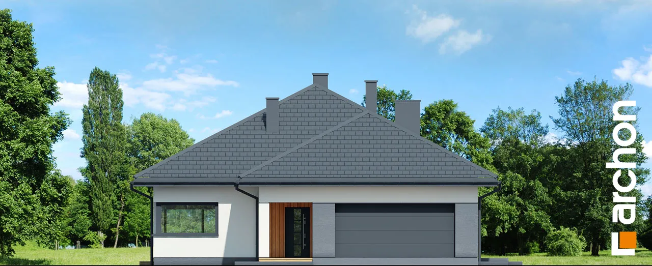 "Ренклоды" - это многочисленное и уникальное семейство проектов одноэтажных домов, в котором многие Инвесторы найдут для себя подходящее предложение. Корпус представленного дома отделан в современном стиле, светлая штукатурка придает ему визуальную легкость, а цветовой акцент вносят серый цвет и деревянная облицовка. Здание выглядит очень привлекательно, входная зона получила практичную кровлю, а также террасу. Впечатляющее остекление придает характер и эффективно открывает интерьеры для вида на сад, обеспечивая отличное освещение комнат. Функциональная планировка вводит четкое разделение на жилую и спальную зоны, что гарантирует комфортные условия для использования одноэтажного интерьера. Солнечная жилая зона включает в себя просторную гостиную с угловым диваном, столовую и кухню, в центре которой расположен остров с дополнительной столешницей и барной стойкой. Угловое окно обеспечивает необходимое количество естественного света, а кладовая, примыкающая к кухне, предлагает практичные места для хранения. На террасу можно попасть как из гостиной, так и из ночной зоны. Отдельные комнаты включают комфортабельную спальню для родителей, в которой есть индивидуальная гардеробная, и две детские комнаты. Между ними находится полностью оборудованная ванная комната. Пространство коридора в ночной зоне дома предлагает возможность использования практичного встроенного шкафа с многочисленными гардеробами, благодаря которому легко поддерживать идеальный порядок в доме. Функциональная планировка дополнительно включает в себя небольшую ванную комнату с душем и котельную, которая имеет независимый выход на улицу, а также пригодится в качестве прачечной. Гараж на две машины отделен от жилой зоны тамбуром. "Дом в ренклодах 27 (Г2)" - готовый проект дома из коллекции: проекты одноэтажных домов, проекты домов с гаражом на две машины, проекты современных домов.