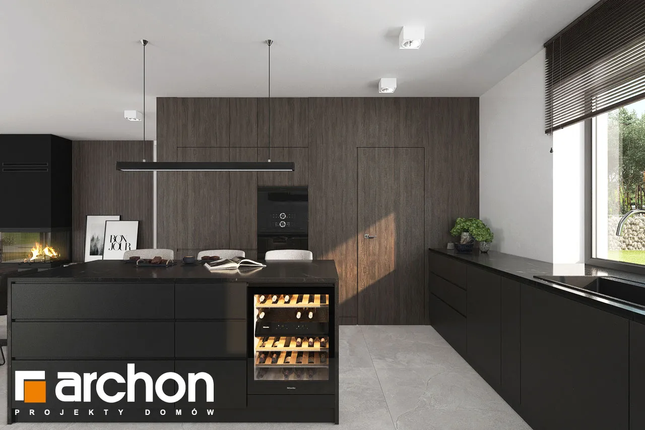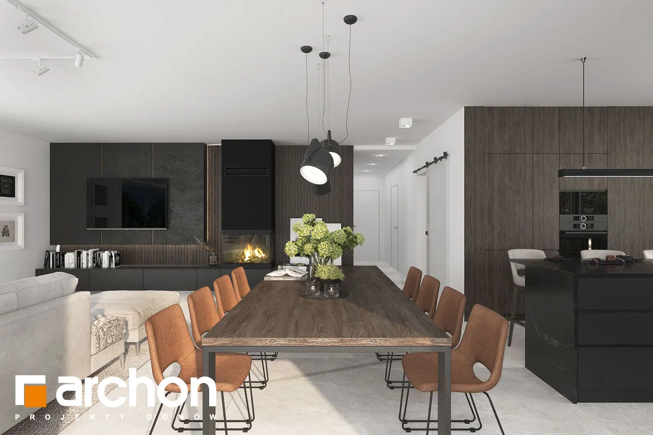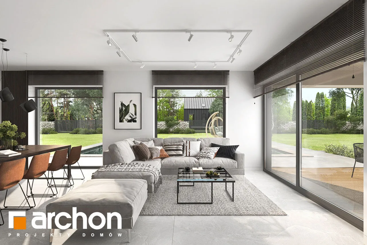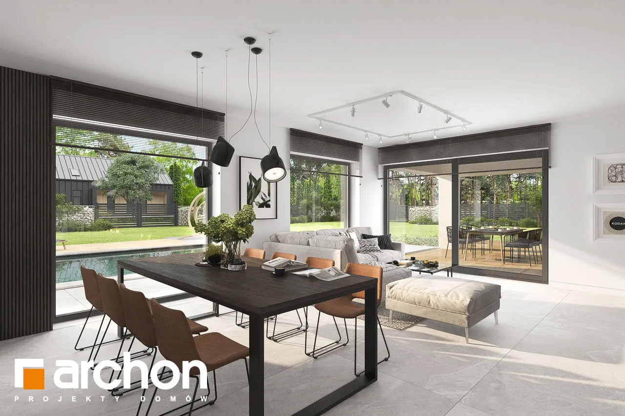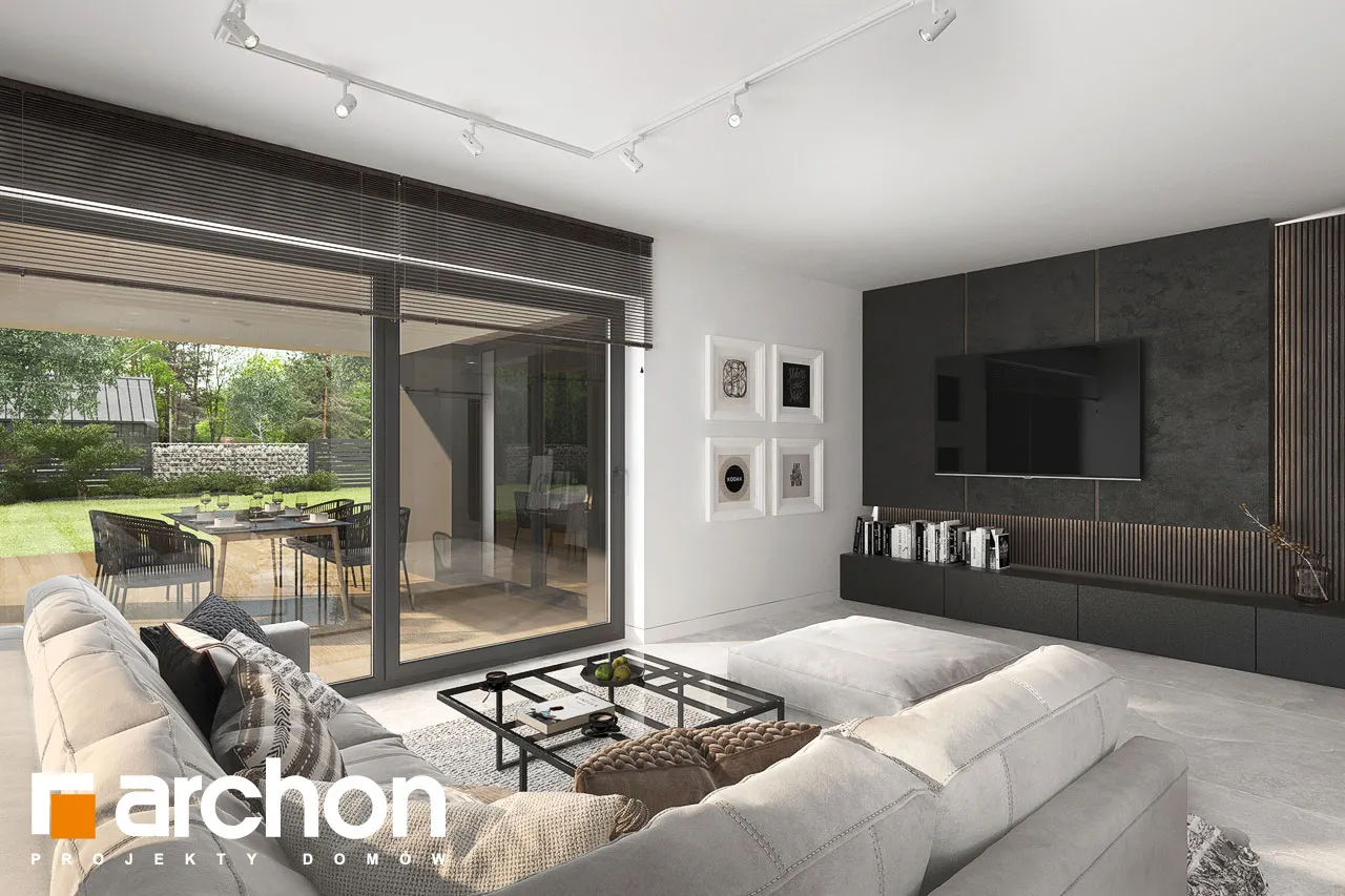 "Ренклоды" - это многочисленное и уникальное семейство проектов одноэтажных домов, в котором многие Инвесторы найдут для себя подходящее предложение. Корпус представленного дома отделан в современном стиле, светлая штукатурка придает ему визуальную легкость, а цветовой акцент вносят серый цвет и деревянная облицовка. Здание выглядит очень привлекательно, входная зона получила практичную кровлю, а также террасу. Впечатляющее остекление придает характер и эффективно открывает интерьеры для вида на сад, обеспечивая отличное освещение комнат. Функциональная планировка вводит четкое разделение на жилую и спальную зоны, что гарантирует комфортные условия для использования одноэтажного интерьера. Солнечная жилая зона включает в себя просторную гостиную с угловым диваном, столовую и кухню, в центре которой расположен остров с дополнительной столешницей и барной стойкой. Угловое окно обеспечивает необходимое количество естественного света, а кладовая, примыкающая к кухне, предлагает практичные места для хранения. На террасу можно попасть как из гостиной, так и из ночной зоны. Отдельные комнаты включают комфортабельную спальню для родителей, в которой есть индивидуальная гардеробная, и две детские комнаты. Между ними находится полностью оборудованная ванная комната. Пространство коридора в ночной зоне дома предлагает возможность использования практичного встроенного шкафа с многочисленными гардеробами, благодаря которому легко поддерживать идеальный порядок в доме. Функциональная планировка дополнительно включает в себя небольшую ванную комнату с душем и котельную, которая имеет независимый выход на улицу, а также пригодится в качестве прачечной. Гараж на две машины отделен от жилой зоны тамбуром. "Дом в ренклодах 27 (Г2)" - готовый проект дома из коллекции: проекты одноэтажных домов, проекты домов с гаражом на две машины, проекты современных домов.