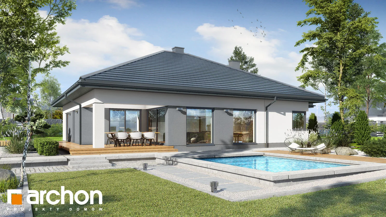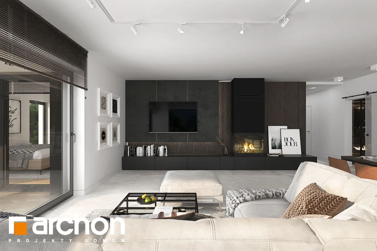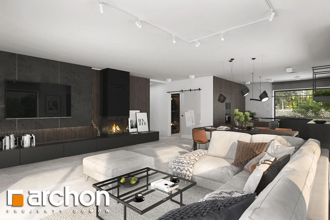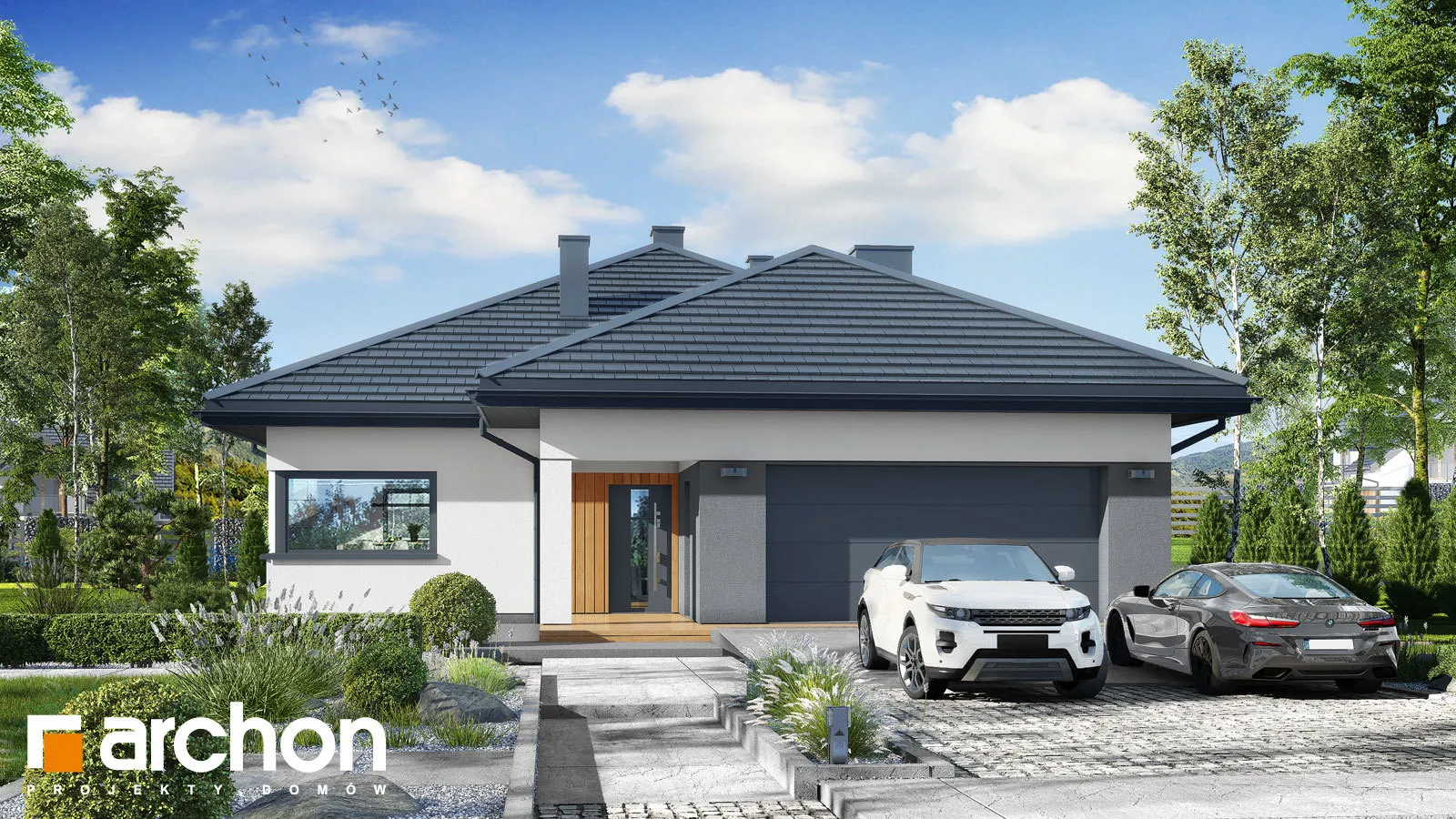 "Ренклоды" - это многочисленное и уникальное семейство проектов одноэтажных домов, в котором многие Инвесторы найдут для себя подходящее предложение. Корпус представленного дома отделан в современном стиле, светлая штукатурка придает ему визуальную легкость, а цветовой акцент вносят серый цвет и деревянная облицовка. Здание выглядит очень привлекательно, входная зона получила практичную кровлю, а также террасу. Впечатляющее остекление придает характер и эффективно открывает интерьеры для вида на сад, обеспечивая отличное освещение комнат. Функциональная планировка вводит четкое разделение на жилую и спальную зоны, что гарантирует комфортные условия для использования одноэтажного интерьера. Солнечная жилая зона включает в себя просторную гостиную с угловым диваном, столовую и кухню, в центре которой расположен остров с дополнительной столешницей и барной стойкой. Угловое окно обеспечивает необходимое количество естественного света, а кладовая, примыкающая к кухне, предлагает практичные места для хранения. На террасу можно попасть как из гостиной, так и из ночной зоны. Отдельные комнаты включают комфортабельную спальню для родителей, в которой есть индивидуальная гардеробная, и две детские комнаты. Между ними находится полностью оборудованная ванная комната. Пространство коридора в ночной зоне дома предлагает возможность использования практичного встроенного шкафа с многочисленными гардеробами, благодаря которому легко поддерживать идеальный порядок в доме. Функциональная планировка дополнительно включает в себя небольшую ванную комнату с душем и котельную, которая имеет независимый выход на улицу, а также пригодится в качестве прачечной. Гараж на две машины отделен от жилой зоны тамбуром. "Дом в ренклодах 27 (Г2)" - готовый проект дома из коллекции: проекты одноэтажных домов, проекты домов с гаражом на две машины, проекты современных домов.