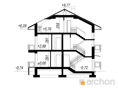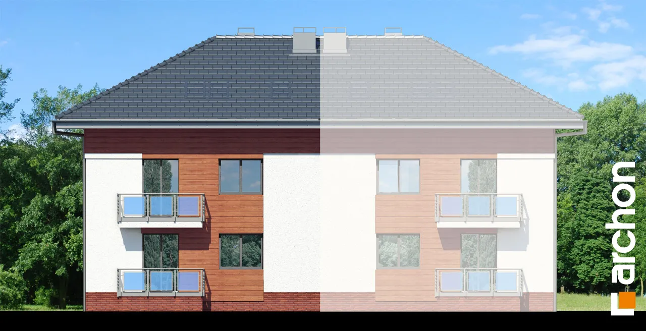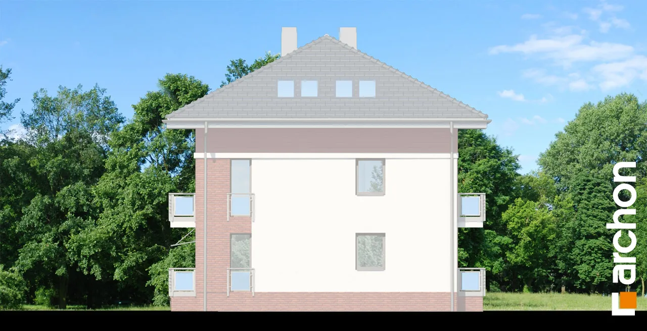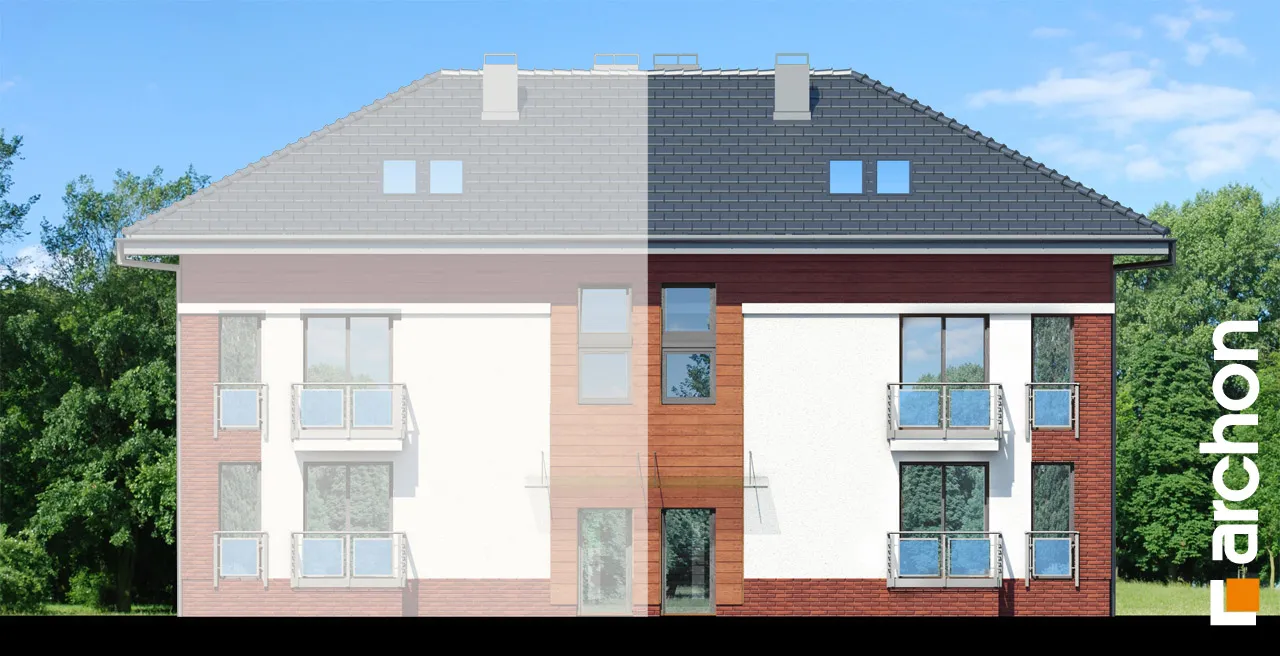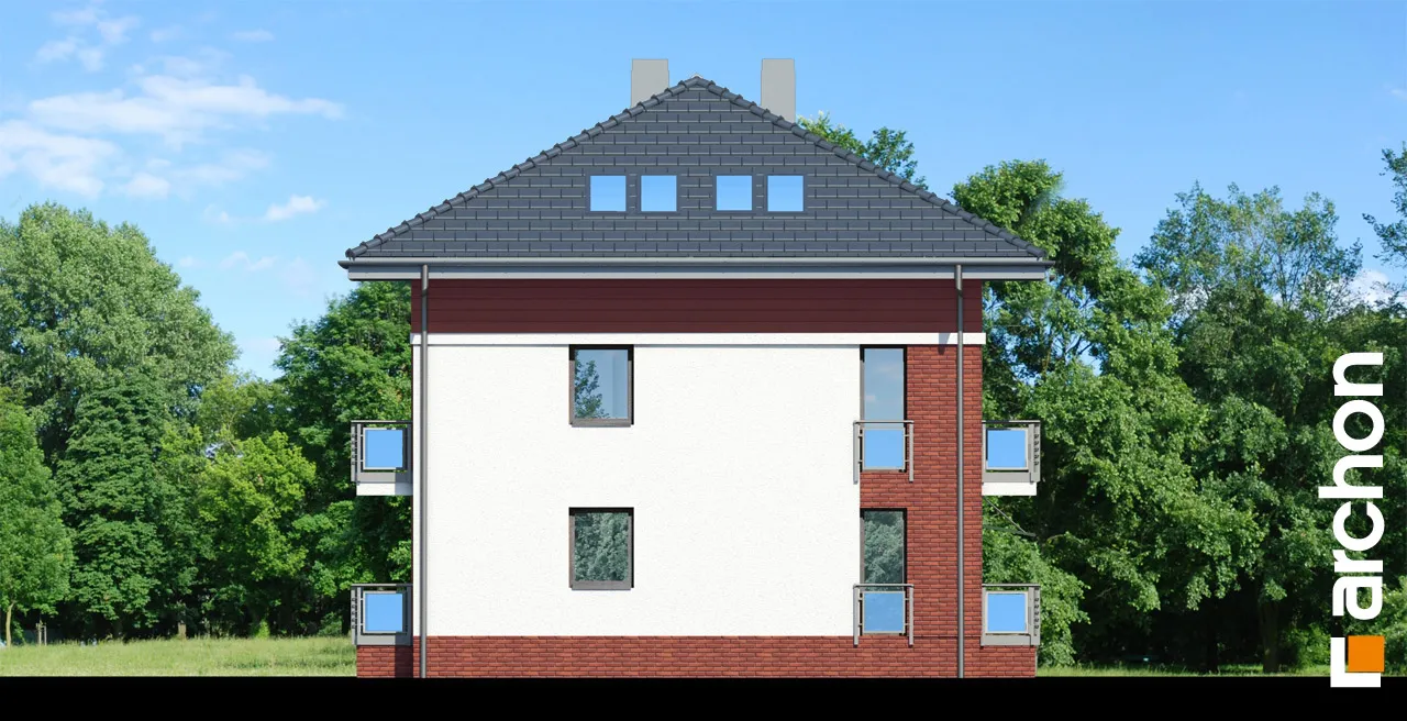 Функциональный проект дома для сблокированной застройки. Каждый сегмент включает в себя две независимые квартиры с доступом с общей лестницы. В меньшей квартире есть гостиная с кухонным уголком, две спальни и ванная комната. Большая квартира является двухуровневой и имеет две дополнительные спальни в мансарде и дополнительную ванную комнату. В обеих квартирах есть балконы, а мансарда освещается мансардными окнами. Привлекательный проект дома, который может быть реализован на участке с доступом с юга, полностью используя возможности участка, предназначенного для односемейного жилья.