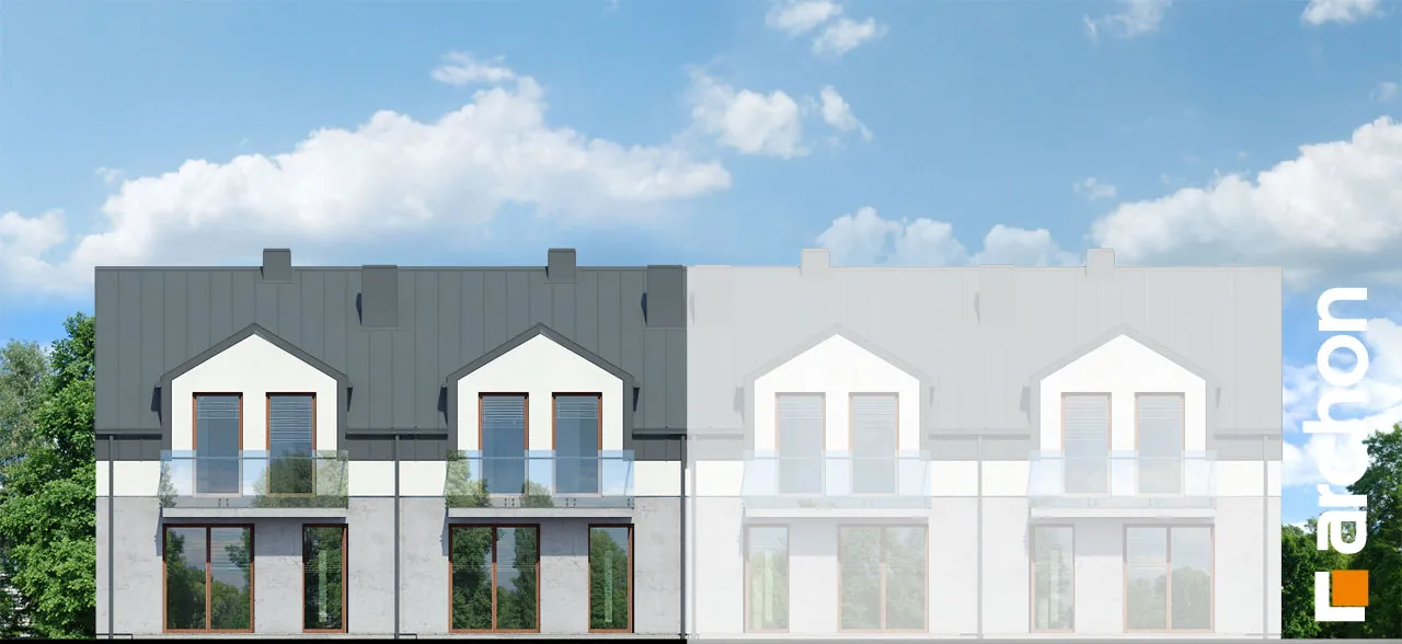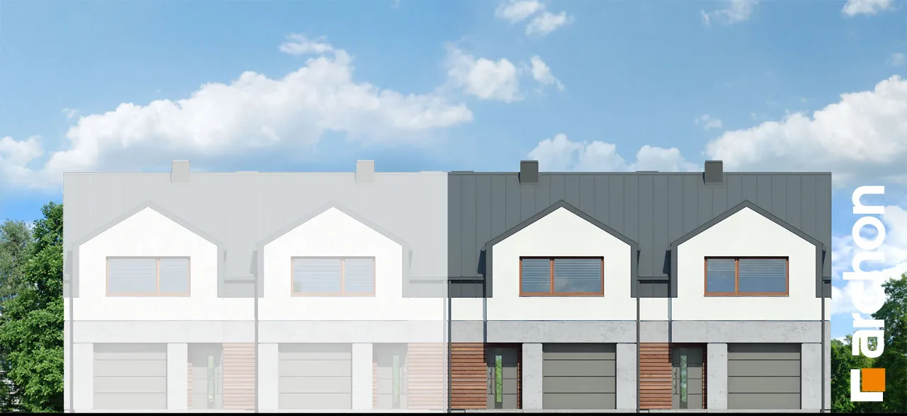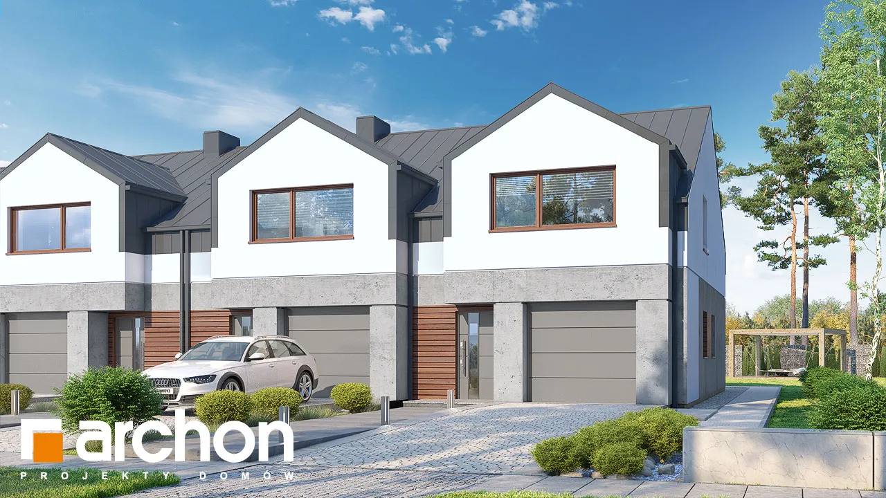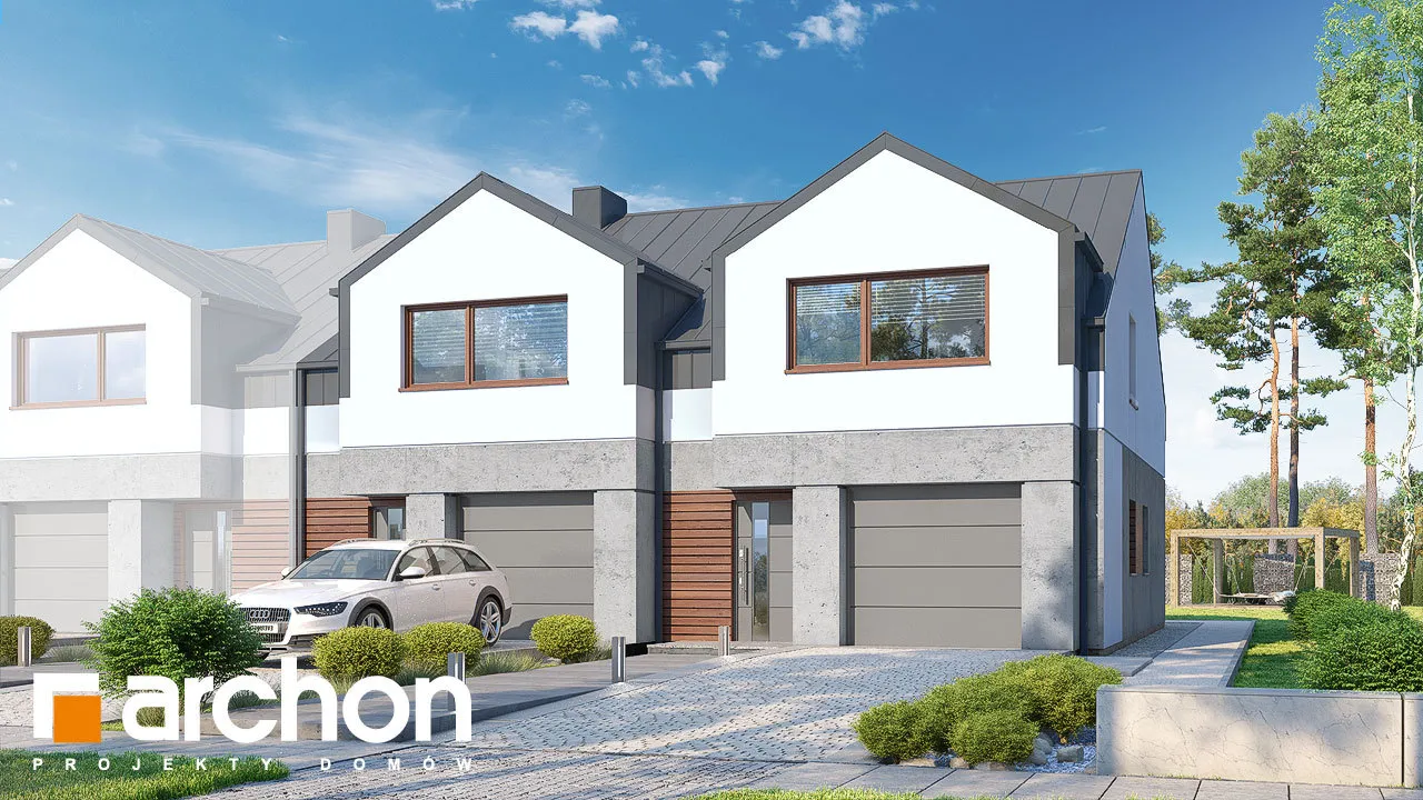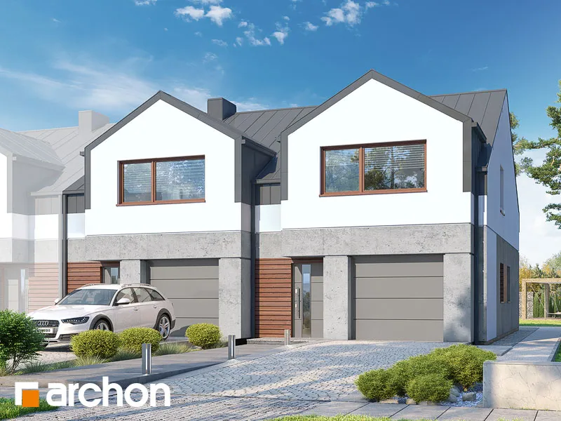 Проект современного двухквартирного дома, который расширяет популярное семейство "Домов под Гинко". Интересная композиция фасада, основанная на сочетании светлой штукатурки и фактурной бетонной облицовки, обеспечивает привлекательный внешний вид в соответствии с современными тенденциями. Здание венчает двускатная крыша, которую разнообразят большие мансардные окна, обеспечивающие больше пространства в мансарде. Каждый сегмент спроектирован с одним гаражом, который отделен от жилой части тамбуром. Функционально продуманный интерьер гарантирует комфортное использование для жильцов. Жилая зона на первом этаже спроектирована как открытое пространство с выходом на террасу. В доме есть уютная гостиная с камином, столовая с местом для хранения посуды и светлая и просторная кухня с вместительной рабочей поверхностью для приготовления пищи. Ванная комната с душем находится рядом с вестибюлем. Тихая ночная зона расположена в мансарде и представляет собой комфортное пространство для уединенного отдыха. Большая спальня родителей и две детские комнаты расположены по разные стороны коридора, удобная ванная комната находится на оси лестницы, а функциональную программу мансарды дополняет гардеробная, общая для всех членов семьи. Проект дома "Дом под гинко 23 (ГР2Б)" относится к категории: проекты двухквартирных домов, проекты современных домов, проекты домов для сблокированной застройки, проекты домов для застройщиков.