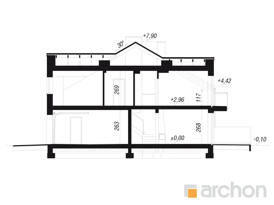 - Разрезы со всеми размерами (высоты этажей, кровли и др.)