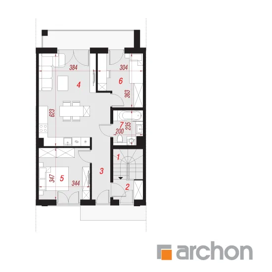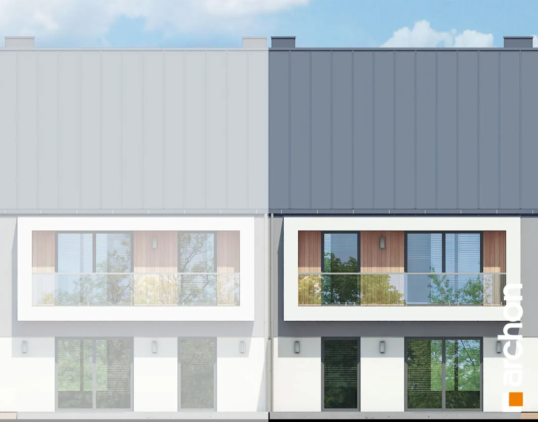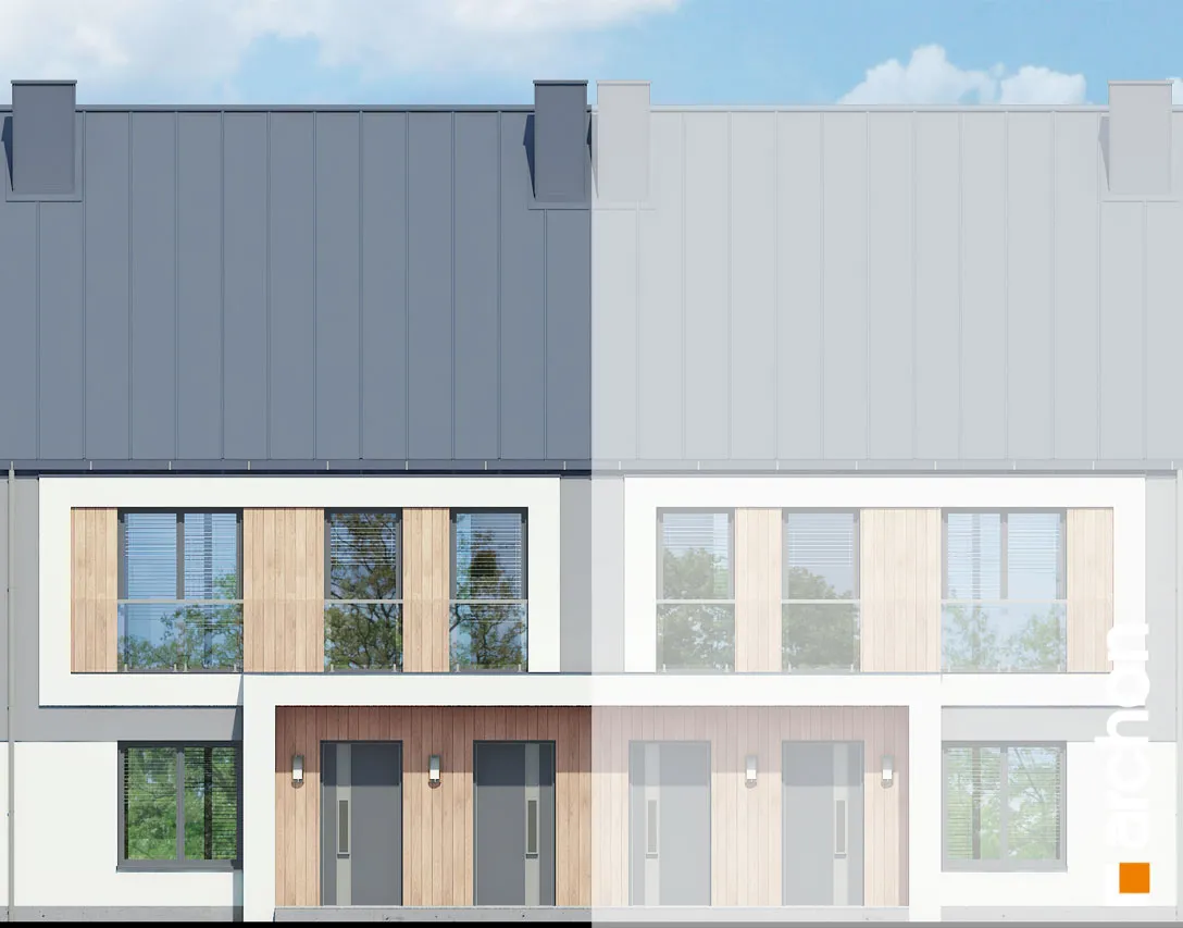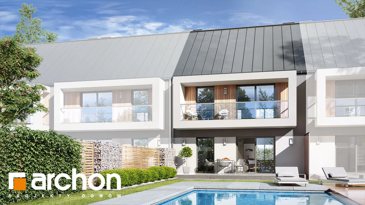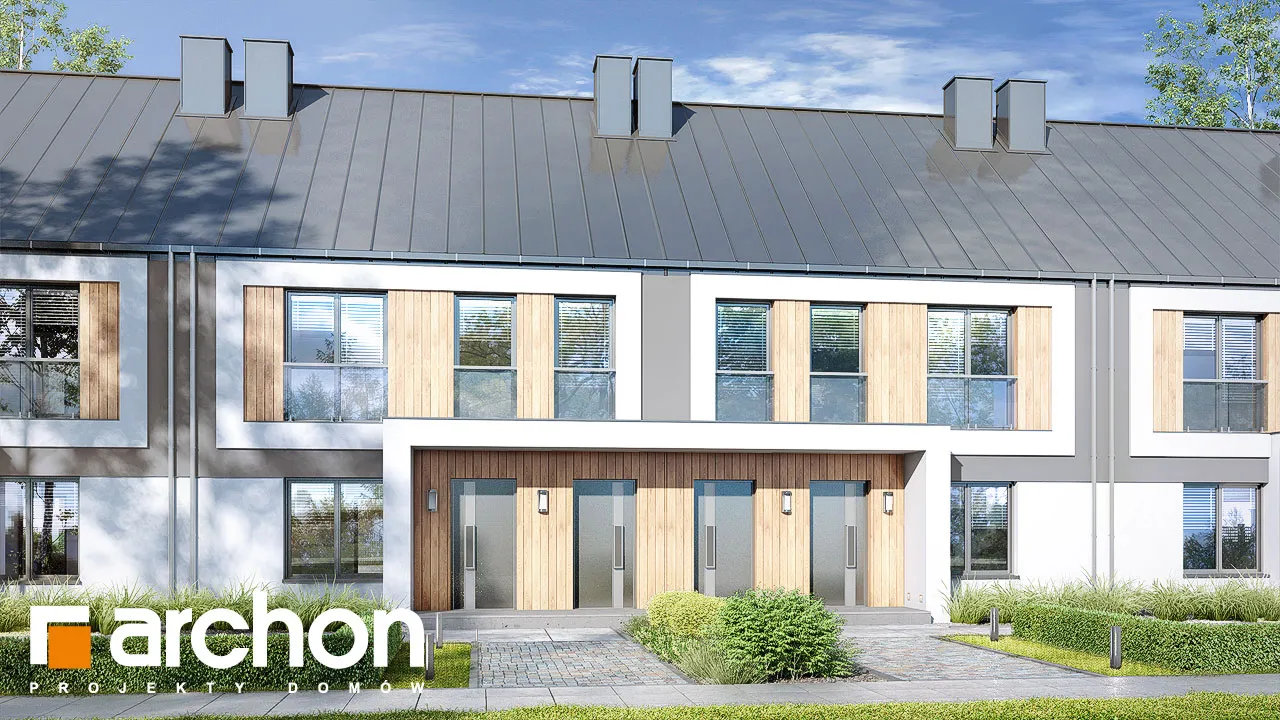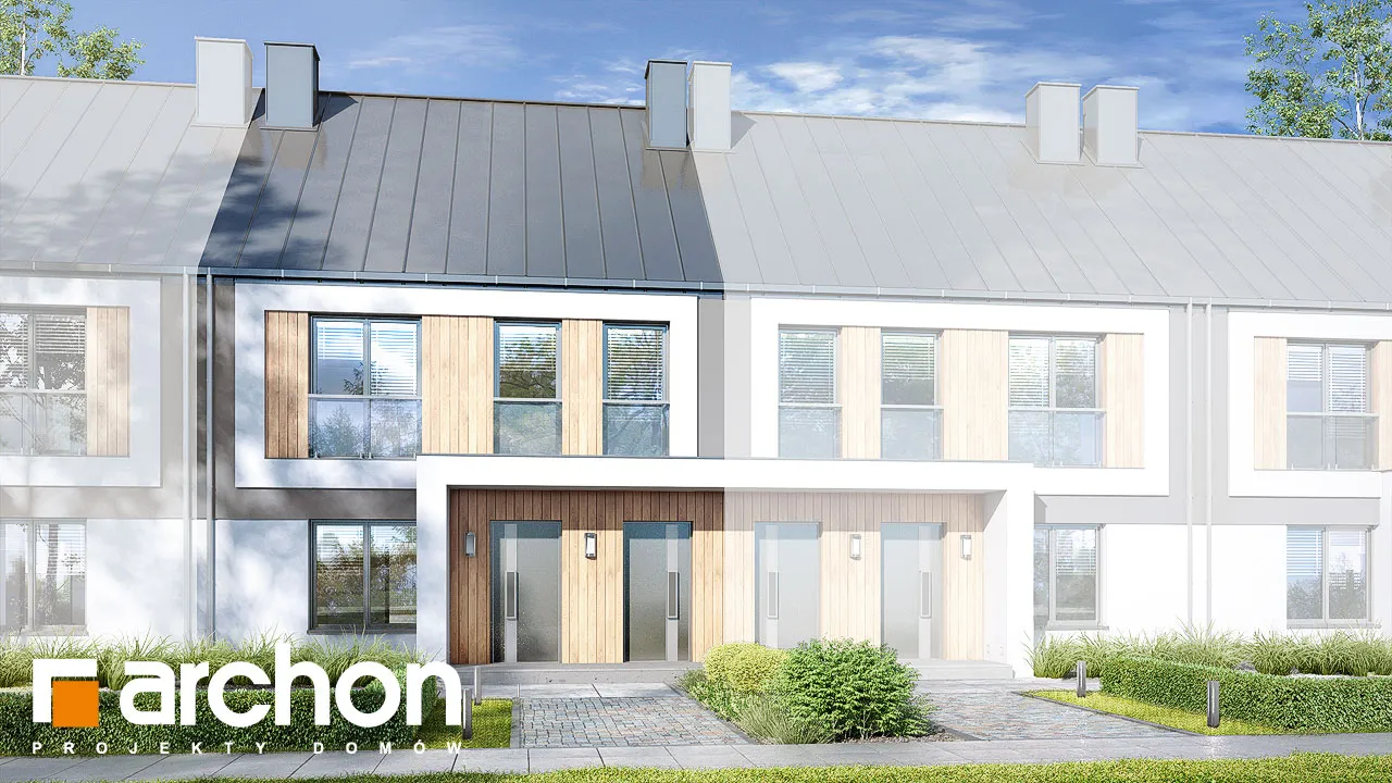 Интересный проект дома для рядовой застройки, рекомендованный для инвестиций. Современный дизайн и функционально продуманные интерьеры обеспечат популярность предложения среди покупателей. Привлекательный внешний вид здания обусловлен красивым оформлением фасада, ярким сочетанием двух цветов штукатурки и натуральных отделочных материалов. Характерной деталью являются балконы, выполненные в виде лоджий, гарантирующие жильцам больший комфорт во время отдыха на свежем воздухе. Балконы были защищены цельностеклянными балюстрадами. В сегменте спроектированы два блока - квартира на первом этаже меньше, ее площадь составляет 58,79 м2 , а квартира на мансарде - блок площадью 64,86 м2 . Жилая зона в каждом из них представляет собой гостиную, соединенную с мини-кухней , с обеденной зоной посередине. Отдельные помещения включают две спальни, в каждой из которых есть место для практичных шкафов. Благодаря оптимальной организации внутреннего пространства, на первом этаже можно дополнительно разместить небольшой шкаф в прихожей, а на мансарде - более просторную прихожую с местом для большого шкафа и вешалки. Зонами отдыха на открытом воздухе являются соответственно: террасы на первом этаже и уединенные балконы в мансарде. Этот привлекательный проект дома относится к следующим категориям: проекты домов для рядовой застройки, проекты современных домов, проекты домов для застройщиков