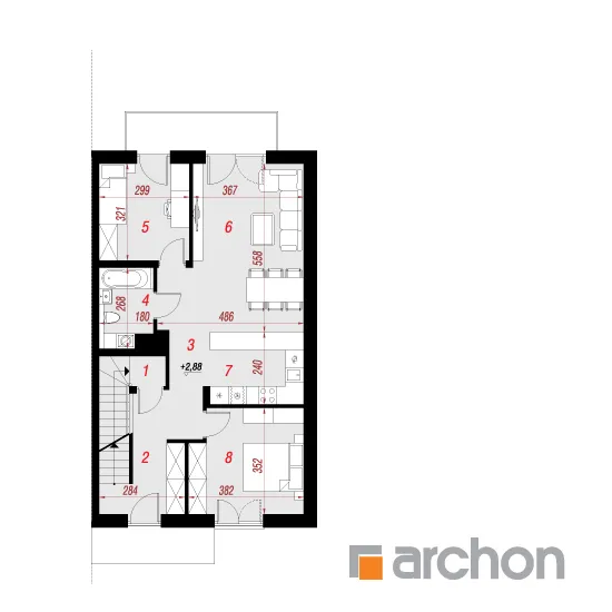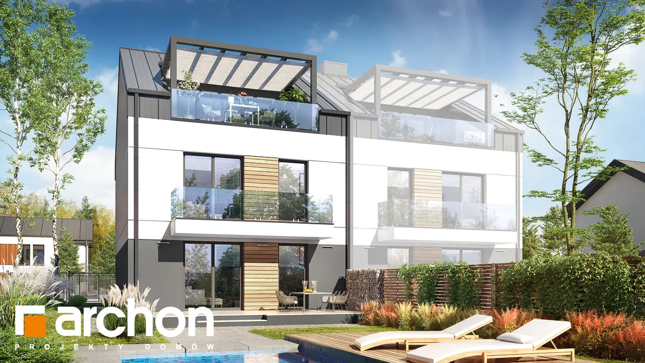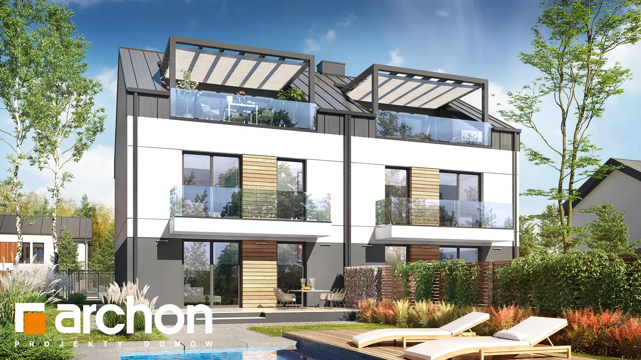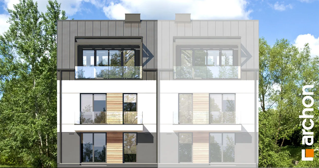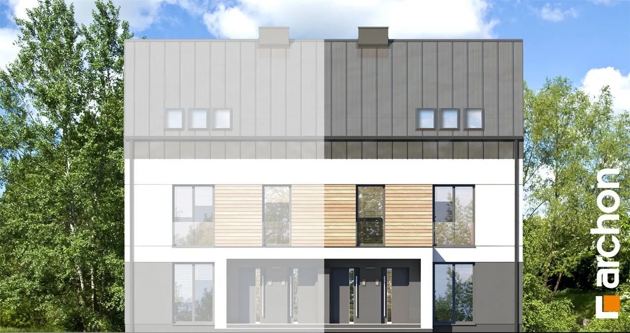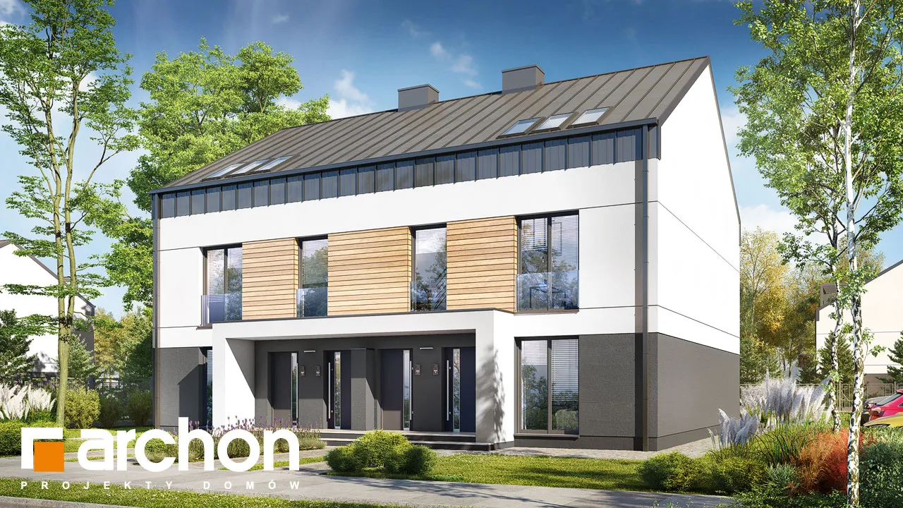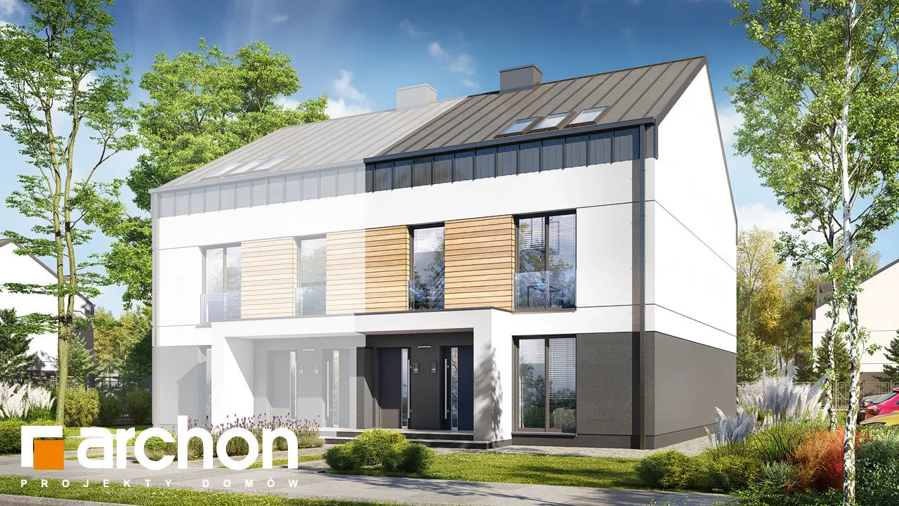 Привлекательный двухсемейный дом, вмещающий в себя комфортабельные квартиры с проверенной функциональной программой. Над вторым этажом запланирована дополнительная комната отдыха, из которой можно выйти на привлекательную террасу. Корпус здания привлекает внимание к интересной отделке фасада, а двускатная крыша без карнизов придает ему минималистский характер. Современные цельностеклянные балюстрады - впечатляющая деталь. Входная зона имеет практичное покрытие в виде плоской формы крыши. Сегмент содержит два жилых блока разной площади. Меньший из них расположен на первом этаже и имеет уютную гостиную, столовую и кухню, являющуюся частью жилой зоны. Отдельные комнаты включают большую спальню для родителей и просторную комнату для ребенка. Достаточное пространство для хранения вещей обеспечивают многочисленные шкафы, установленные в комнатах и в прихожей, а ванная комната с ванной завершает функциональную программу. Квартира на втором этаже имеет аналогичную планировку комнат, но дополнительно имеет просторный чердак, который может служить, например, как общая зона отдыха с выходом на террасу, затененную перголой. В мансарде жильцы могут также организовать зону для занятий. Этот интересный проект из семейства "Дом в халезиях" относится к категории: проекты современных домов, проекты двухквартирных домов, проекты домов для сблокированной застройки.