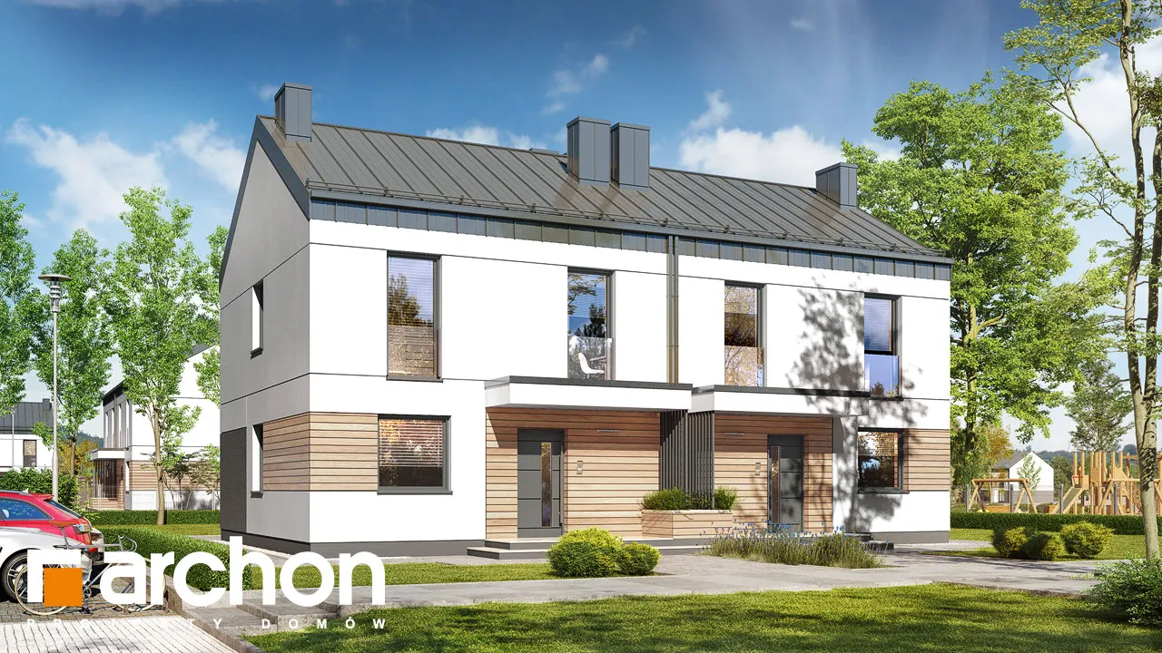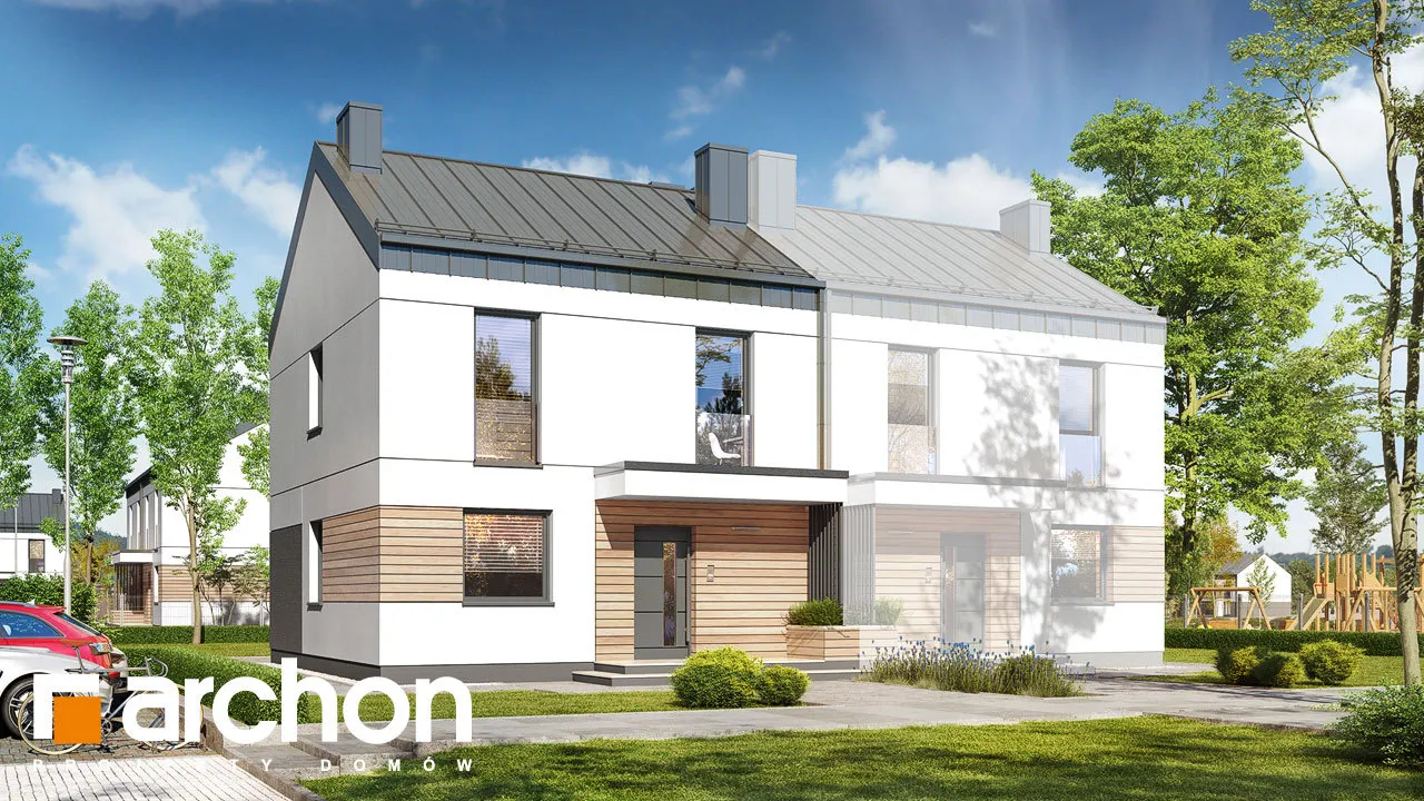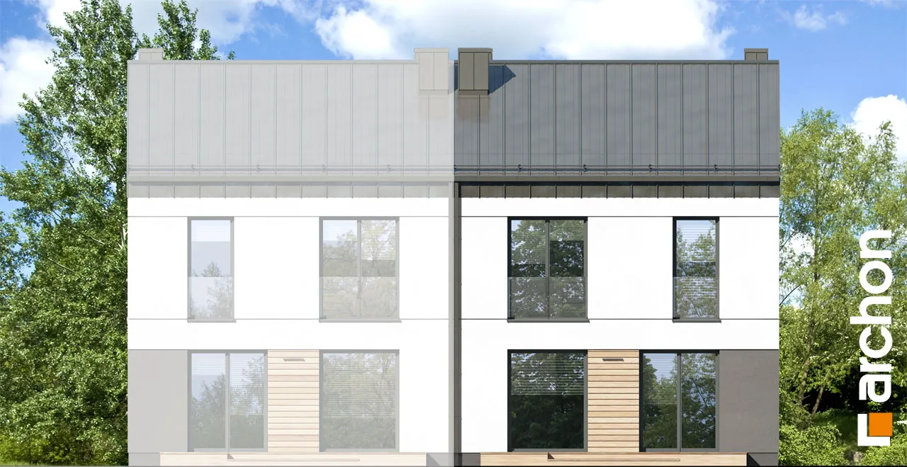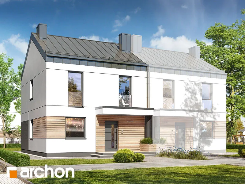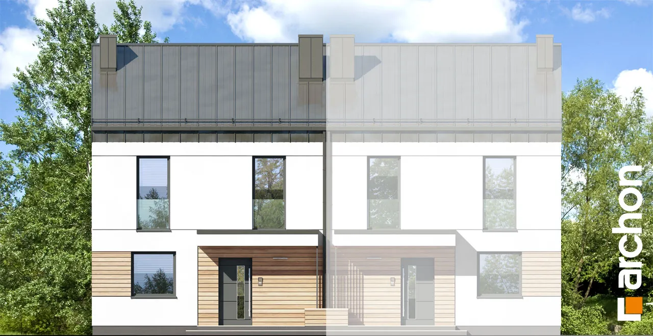 "Дом в аркадиях 4 (Б)" - это проект дома для сблокированной застройки. Простой корпус дома подчеркивается минималистичным и элегантным фасадом. Светлая штукатурка в сочетании с деревянной облицовкой, подчеркивающая главный вход и линию окон, обеспечивает привлекательный, современный внешний вид. Характерным элементом проекта является крыша без карнизов, покрытая металлическими листами, антрацитовый цвет которых красиво контрастирует со штукатуркой. Входная зона практично покрыта интересной плоской формой кровли. Первый этаж дома представляет собой комфортную жилую зону с большими остеклениями, которые естественным образом освещают пространство. Гостиная с удобным угловым диваном и камином, расположенным рядом с ТВ-зоной, плавно сливается со столовой. Столовая спроектирована с широким окном, позволяющим удобно выйти на террасу, что увеличивает пространство для отдыха в доме. Столовая примыкает к функциональной кухне, которая обеспечивает идеальные условия для работы благодаря большому количеству рабочих поверхностей и барной стойке. Функциональная программа первого этажа также включает комнату, которую можно использовать как офис с удобным письменным столом у окна. Ванная комната, расположенная по его оси, завершает дизайн первого этажа. Лестница ведет в мансарду. Высокая коленная стена, использованная в проекте мансарды, придает простор помещениям и облегчает их расположение. Ночная зона включает четыре прекрасно освещенные спальни с отдельной зоной для отдыха, работы и хранения вещей, а также естественно освещенную ванную комнату. "Дом в аркадиях 4 (Б)" принадлежит к коллекции: проекты домов в современном стиле, проекты одноэтажных домов, проекты домов для сблокированной застройки, проекты домов для застройщиков.