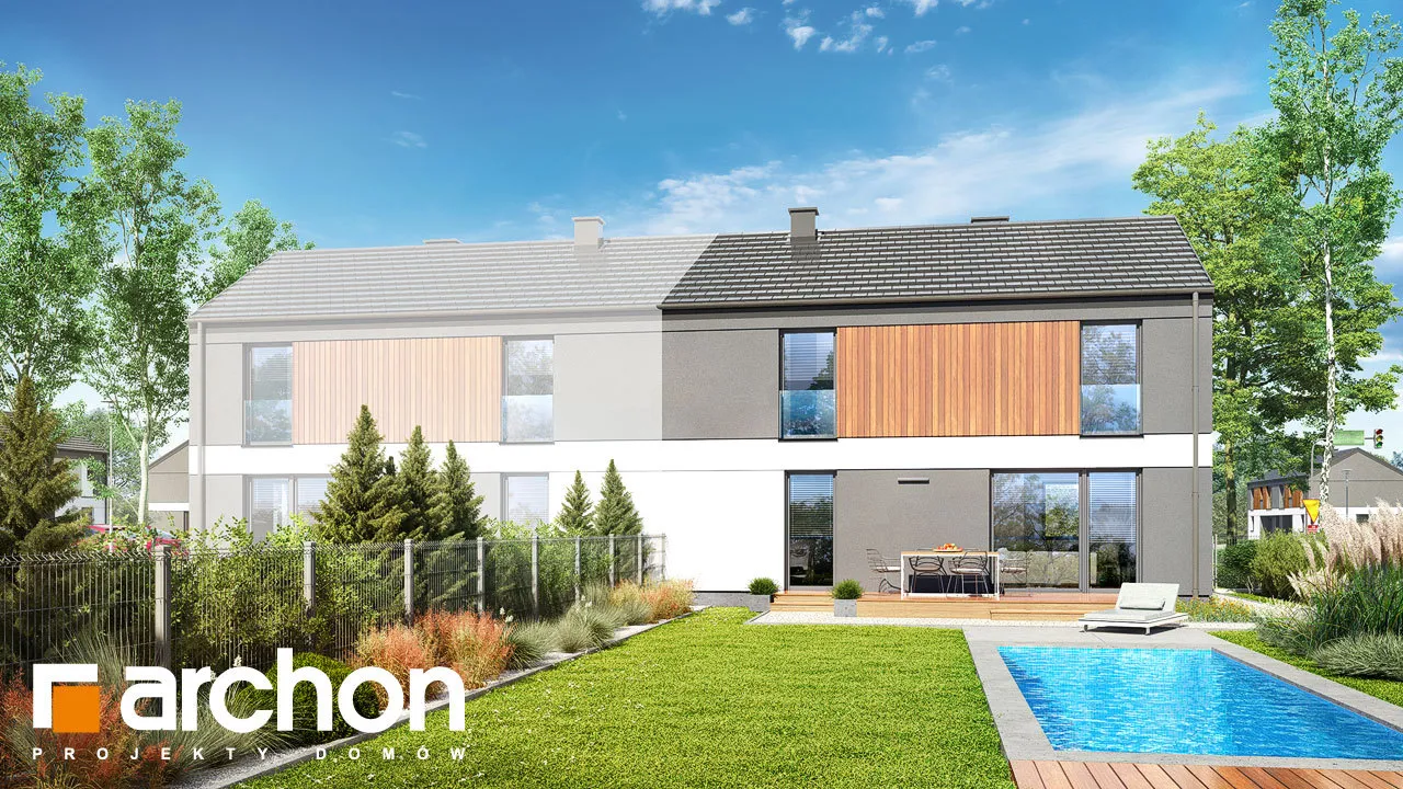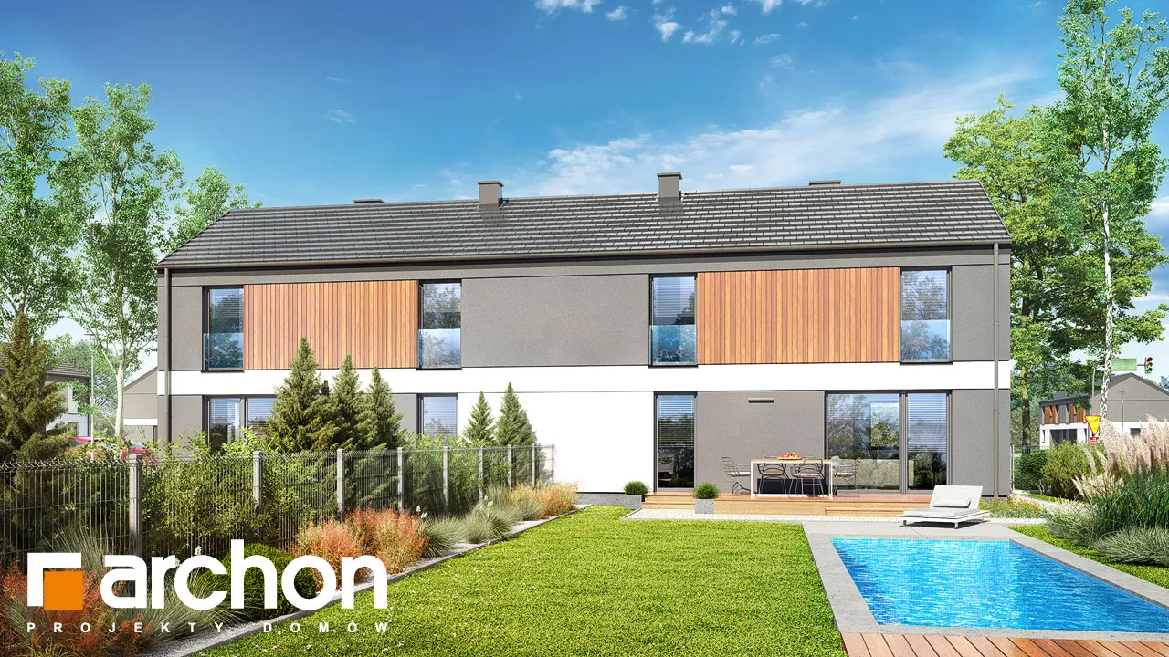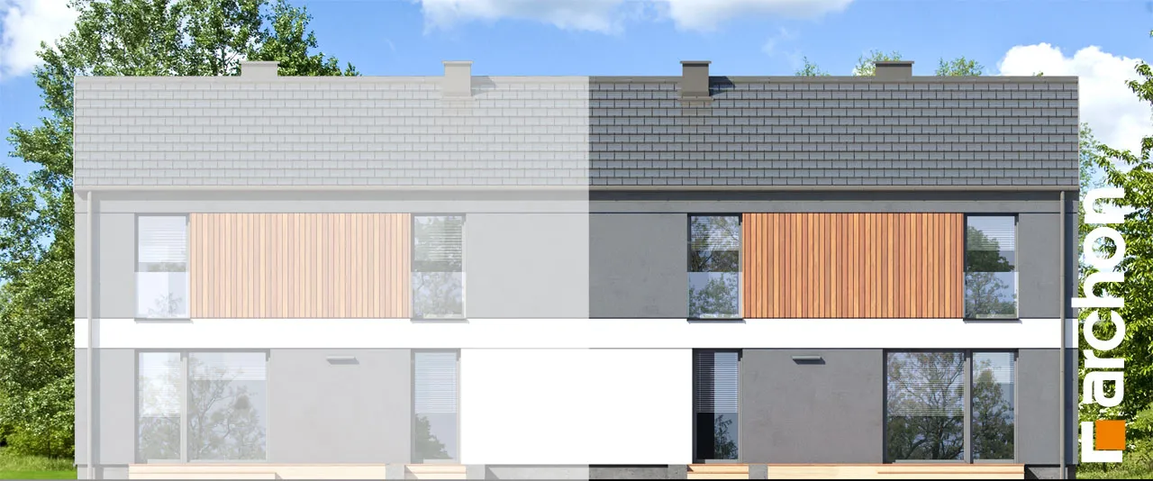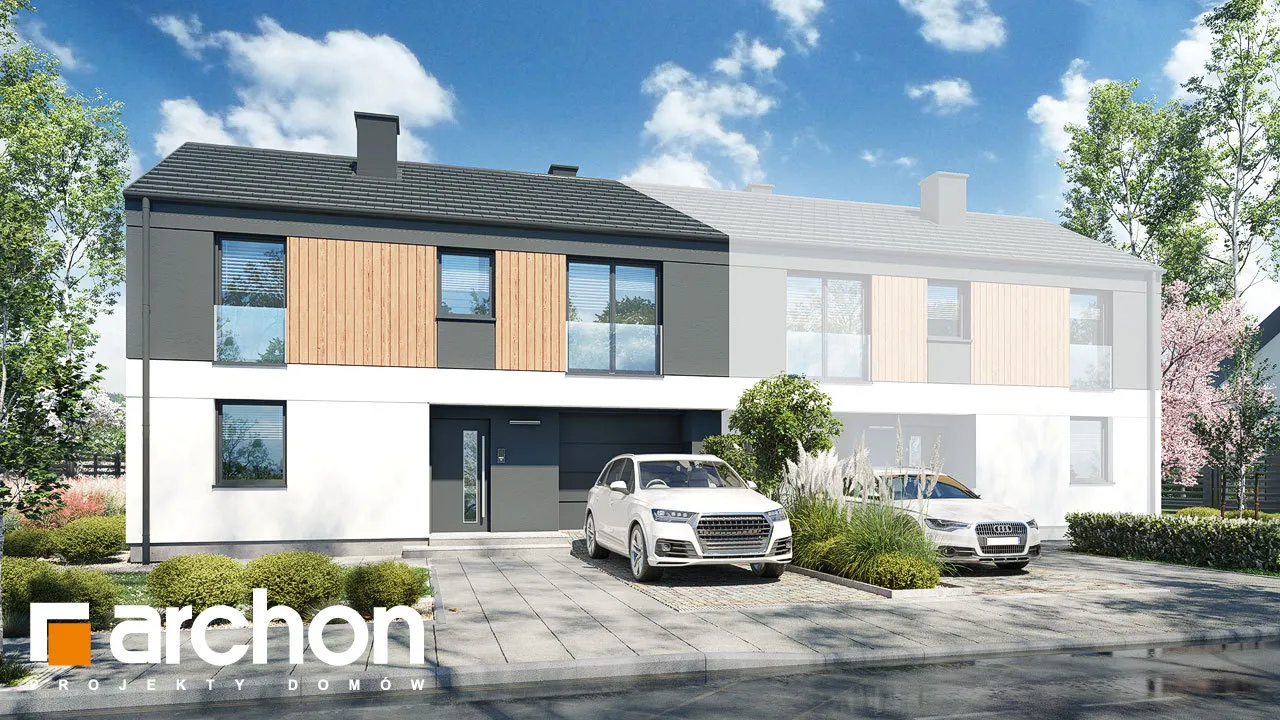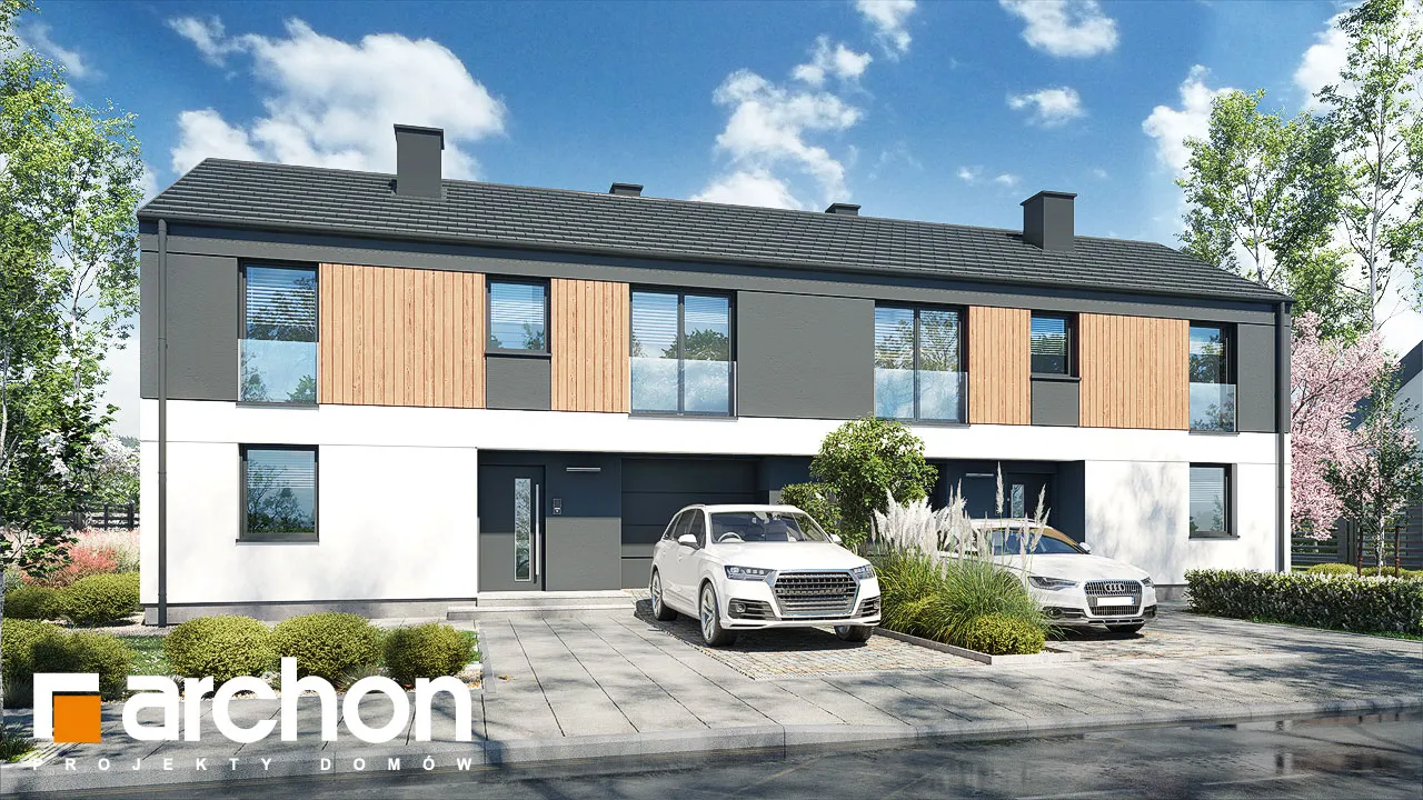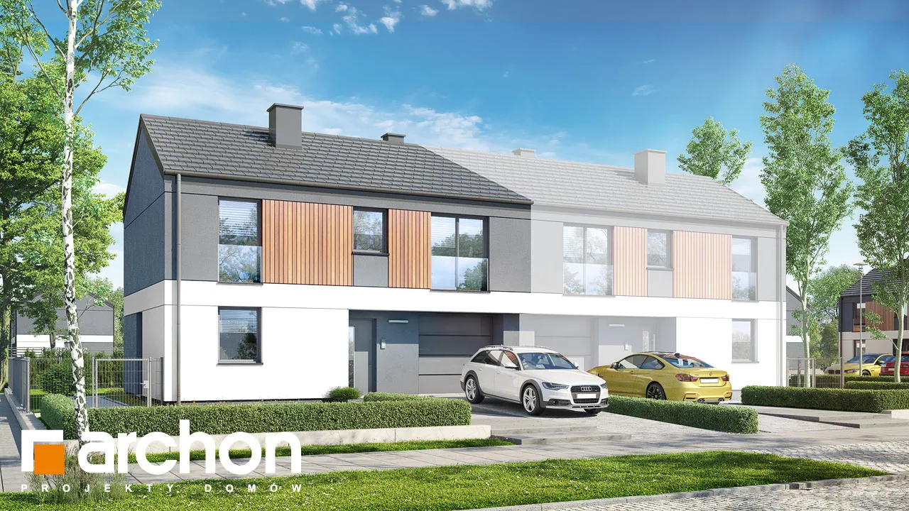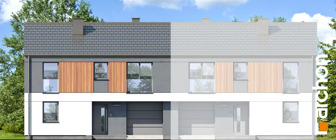 Проект современного дома для сблокированной застройки с гаражом на одну машину в каждом сегменте. Идеально подходящий для реализации на небольших участках, он имеет привлекательную функциональную программу, которая оптимально организует относительно небольшой интерьер. Простая форма корпуса здания идеально вписывается в современные архитектурные тенденции и способствует достижению высоких энергетических параметров дома. Благодаря соответствующей композиции отделки, подчеркнута обособленность первого этажа и мансарды. Бело-серая штукатурка эффектно сочетается с деревянной облицовкой, которая является привлекательным декоративным акцентом. Каждый сегмент представляет собой независимую квартиру с жилой зоной на первом этаже и приватной зоной в мансарде. Гостиная увеличена за счет террасы, а столовая примыкает к просторной кухне с прилегающей кладовой. Рядом с лестницей спроектирован туалет, а в гараже выделена практичная кладовая, доступная через тамбур. Ночная зона включает четыре комфортабельных номера, которые стали просторнее благодаря более высокой коленной стене. Ванная комната, расположенная по оси лестницы, завершает программу мансарды. "Дом в мураях (ГБ)" - это готовый проект дома из коллекции: проекты домов для застройщиков, проекты домов с жилой мансардой, проекты современных домов, проекты домов для сблокированной застройки.