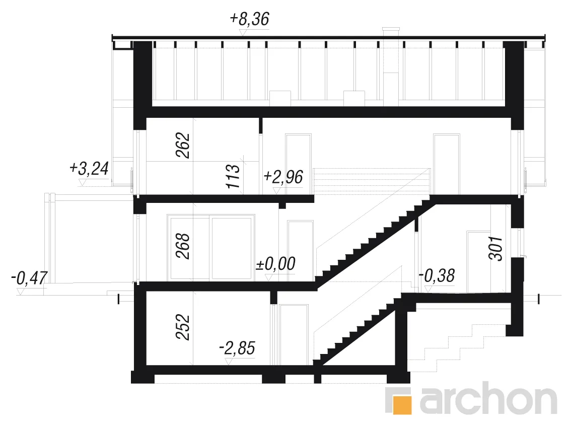 - Разрезы со всеми размерами (высоты этажей, кровли и др.)