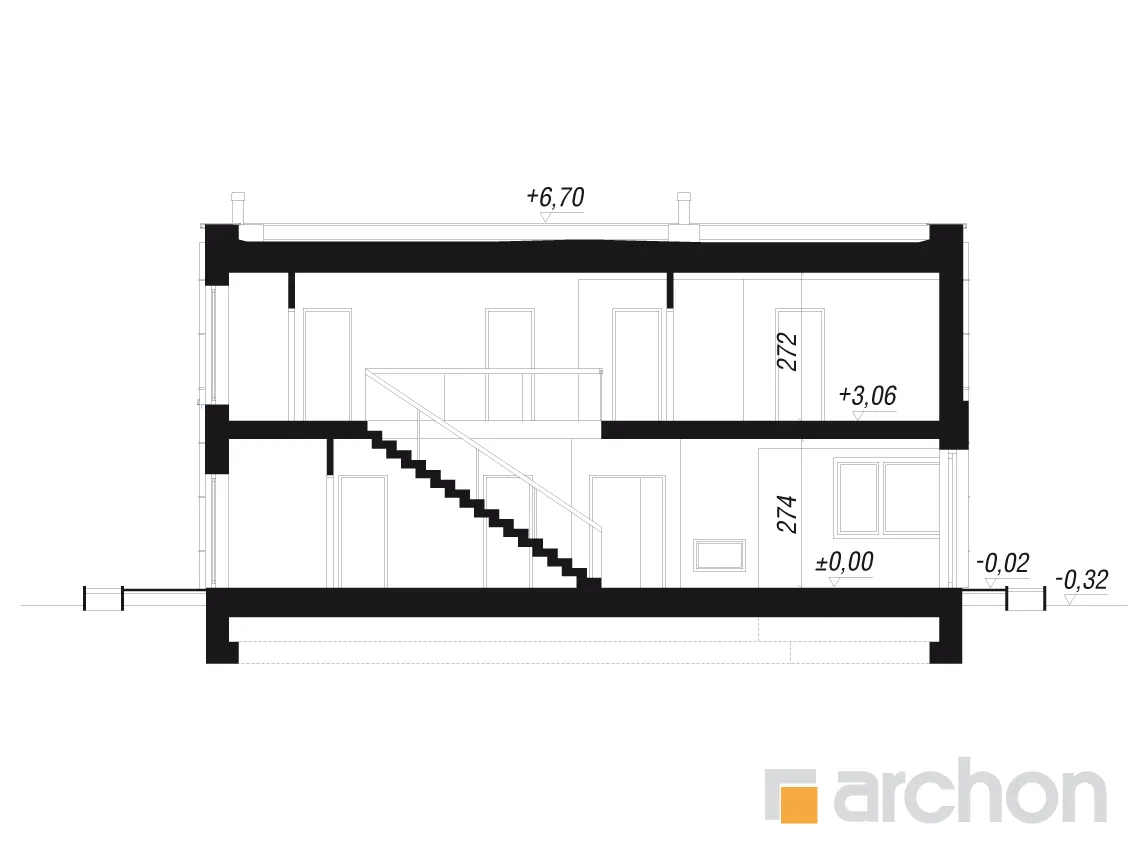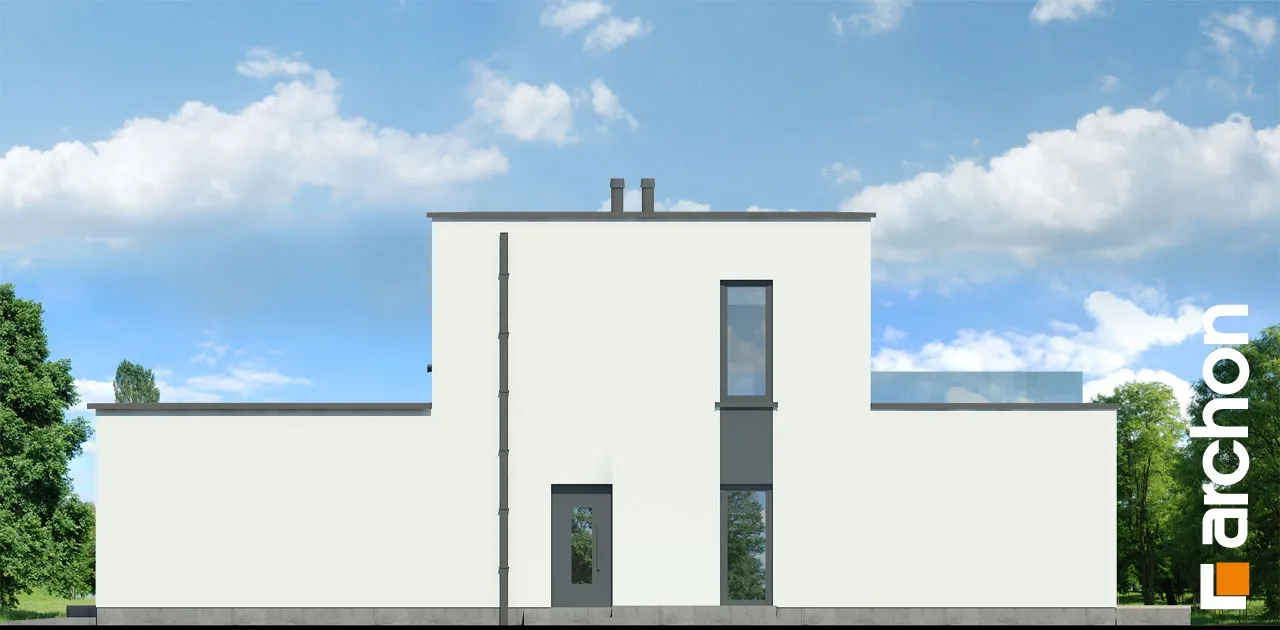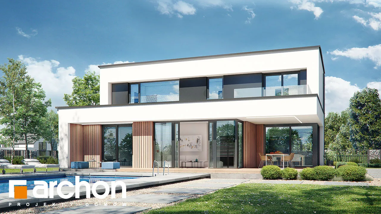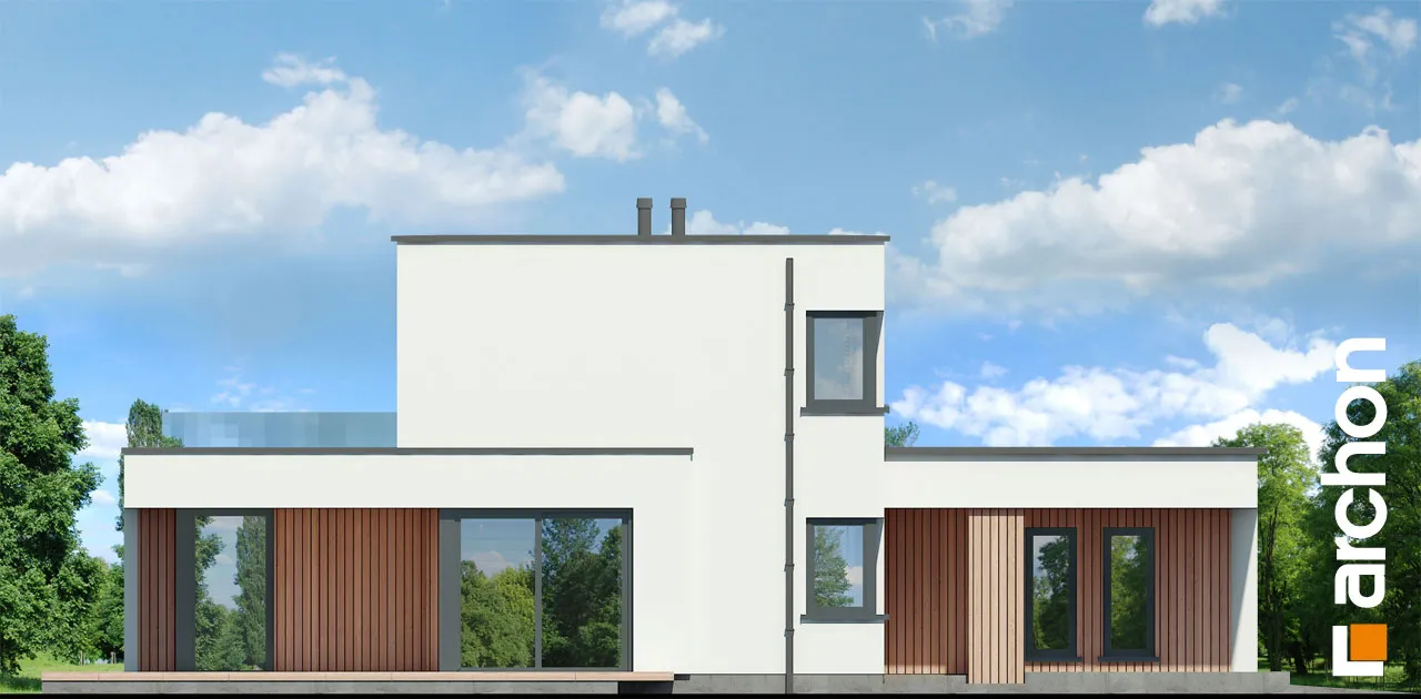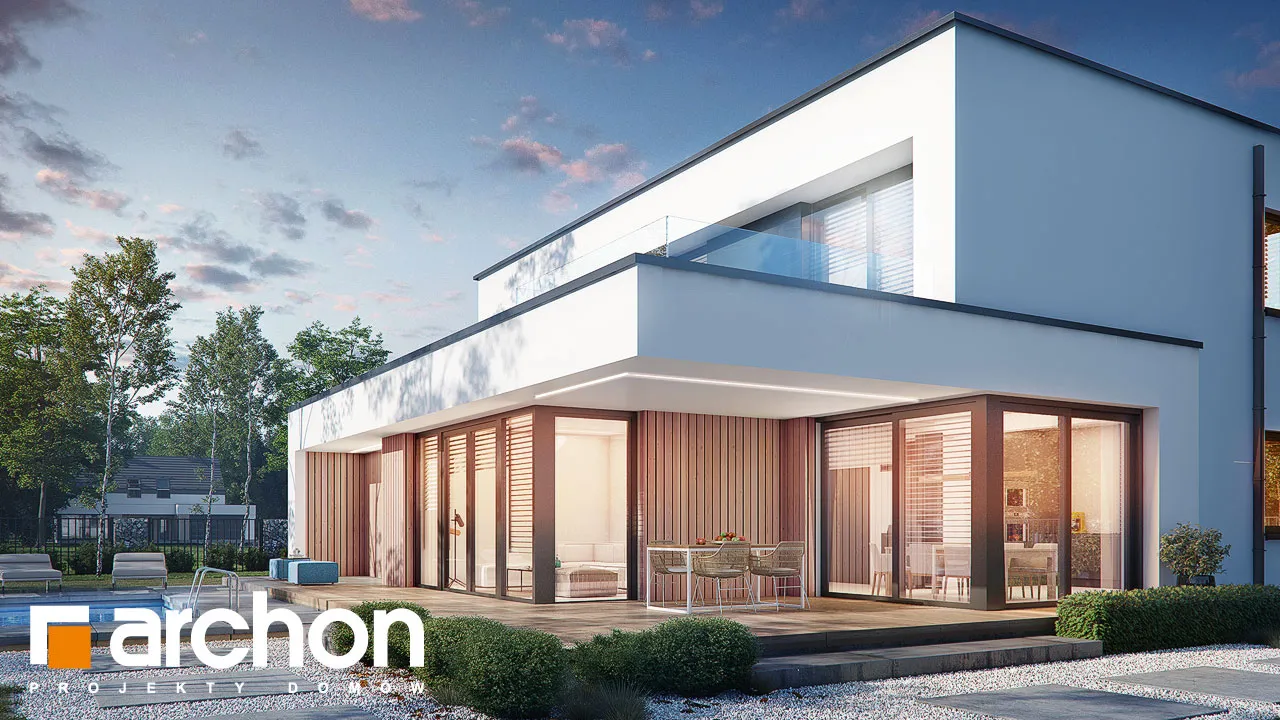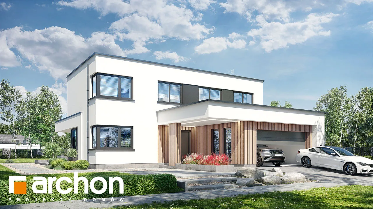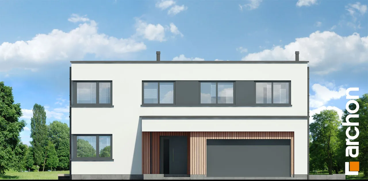 Современный, элегантный, удобный! Этот проект порадует любителей просторных интерьеров и современной архитектуры. Дом увенчан плоской крышей и соединен по своей массе с гаражом на две машины, четко выступающим из основной линии здания. Характер дома подчеркивается отделкой фасада, где деревянная облицовка сочетается со штукатуркой, создавая яркий природный акцент. Настоящим украшением дома является прекрасно составленная, обширная и доступная из разных частей терраса на первом этаже. Это, безусловно, станет любимым местом для отдыха на свежем воздухе. Благодаря многочисленному остеклению интерьер дома выглядит исключительно привлекательно, а раздвижная система открывания дверей террасы создает эффект плавной и гармоничной интеграции с садом. В открытой, просторной гостиной отдельные зоны были четко определены с точки зрения их функций. Гостиная представляет собой удобную зону отдыха с большим угловым диваном и панорамным видом на сад. Столовая расположена в угловой, застекленной части первого этажа, что придает ей представительный характер. В "Доме в диасциях" была спроектирована большая, оптимально организованная кухня с интегрированным по центру островом. Такое решение дает возможность организовать удобную зону приготовления пищи, а столешница прекрасно подойдет в качестве дополнительного места для приема пищи. Кухня предлагает много места для хранения, которое дополняется кладовой, спроектированной рядом с прихожей. На первом этаже есть также удобный кабинет, рядом с которым находится естественно освещенная и оборудованная душевой кабиной комната. Проектом дома предусмотрена большая газовая котельная, которая совмещена с функцией прачечной, а отдельный выход на улицу позволяет сушить белье на открытом воздухе. Практичным решением является шкаф-купе, оформленный прихожей и скрытый раздвижными дверями, благодаря которому мы можем легко поддерживать порядок во входной зоне. Из этого помещения жильцы могут быстро перейти в просторный гараж на две машины. Украшением интерьера является впечатляющая одновинтовая лестница, ведущая на второй этаж, в просторную ночную зону. Здесь в распоряжении родителей - комфортабельная комната с ванной и гардеробной, а также две уютные комнаты для детей. В программу ночной зоны также входит полностью оборудованная ванная комната и гардеробная, общая для всех членов семьи. Представленный "Дом в диасциях" - это интересный готовый проект из коллекции: проекты двухэтажных домов, проекты современных домов, проекты домов с плоской крышей, а также проекты домов с гаражом на две машины.