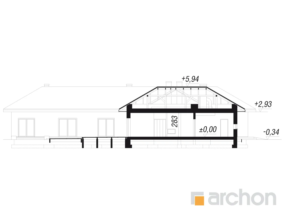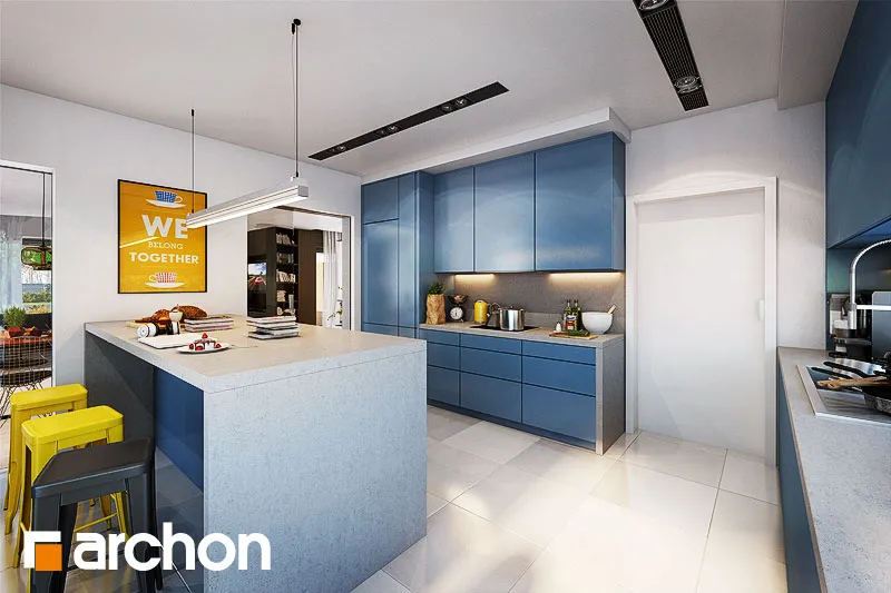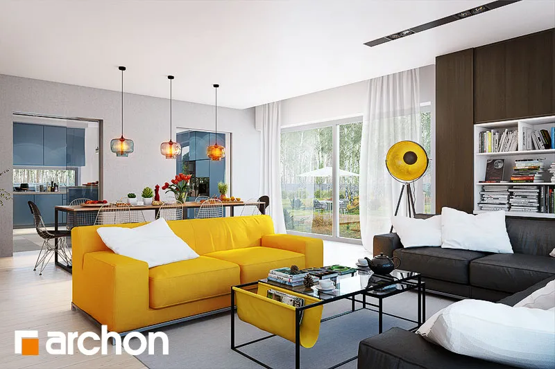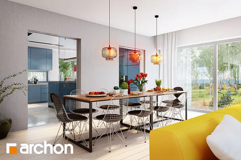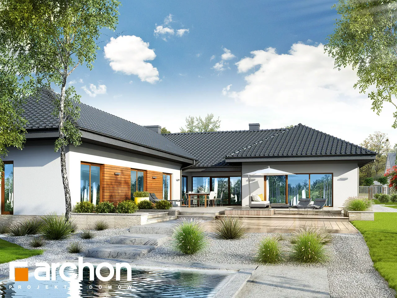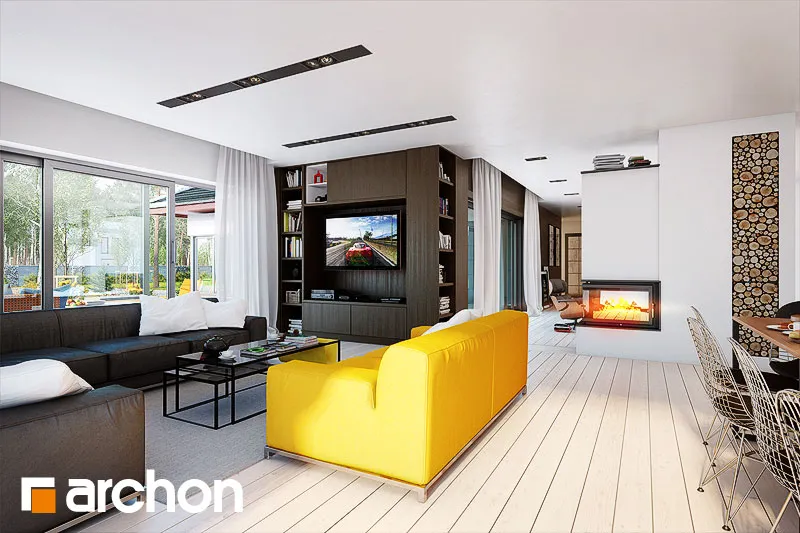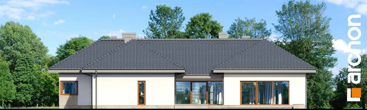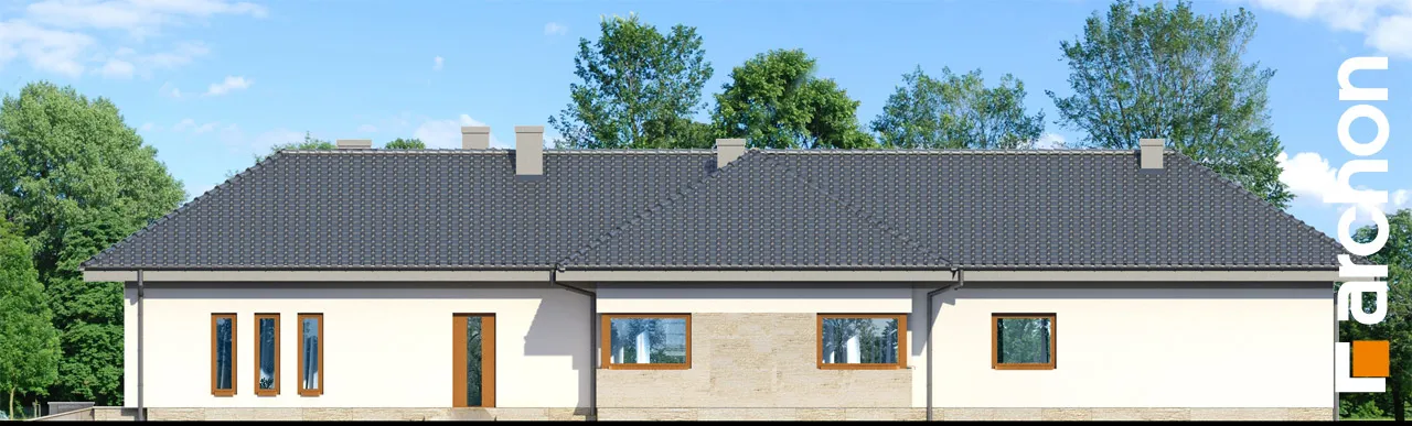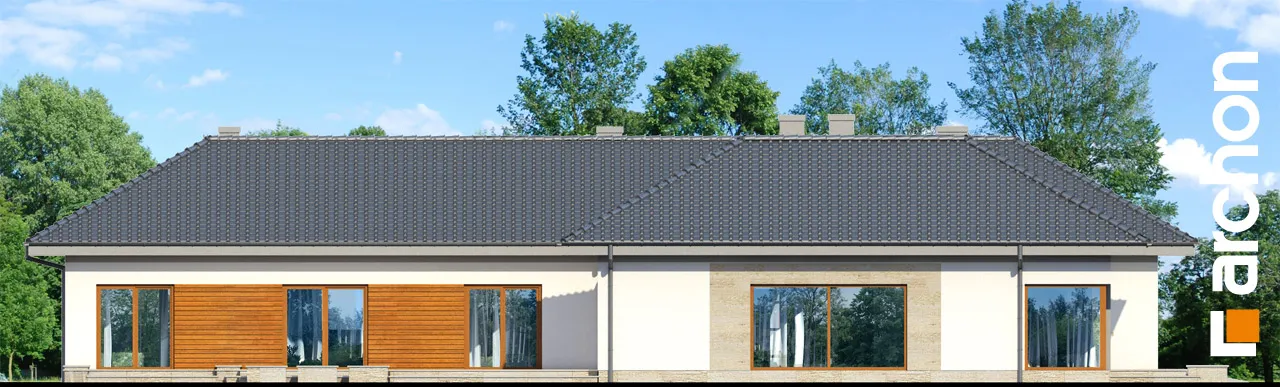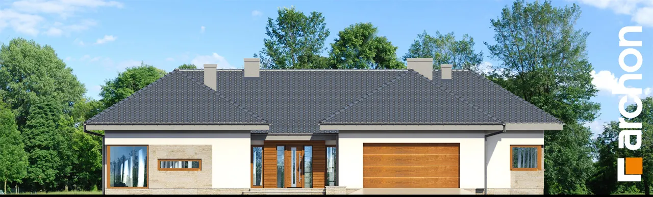 Современный, исключительно впечатляющий проект одноэтажного дома, который обязательно оправдает ожидания клиентов, ищущих элегантный и функциональный дом, светлый и широко открытый для сада. Стильная отделка фасада основана на естественном сочетании светлой штукатурки с деревянной облицовкой и деревянными деталями того же цвета. Просторная терраса-патио представляет собой привлекательную зону отдыха на открытом воздухе, где есть место для летней столовой, кофейного уголка и джакузи. Функциональная планировка дома основана на четком разделении зон использования, удобном и очень практичном. Открытая и представительная гостиная зона - это прекрасно освещенное пространство, приглашающее всех членов семьи и их гостей отдохнуть вместе. Из вестибюля мы попадаем прямо в каминный зал с удобными креслами и панорамным проходом на террасу. В просторной гостиной находится элегантный гостиный гарнитур перед домашним кинотеатром и большой семейный стол, идеально подходящий для совместного празднования праздников или встреч с друзьями. Широкий проем на террасу обеспечивает великолепный вид на сад и одновременно увеличивает зону отдыха гостиной. Большая кухня может быть отгорожена раздвижными дверями, а ее программу дополняет практичная кладовая. Изюминкой является возможность установки высоких встроенных шкафов, функционального полуострова с зоной для завтрака и зоной приготовления пищи, а также стола, размещенного в застекленном углу. В ночную зону дома можно попасть из отдельного коридора. Здесь спроектированы три светлые и хорошо расположенные спальни, кабинет и удобная ванная комната, освещенная угловым окном, с местом для ванны, душа и двух умывальников. Спальня родителей была спланирована с собственной гардеробной, ванной комнатой и выходом на террасу. Тамбур ведет к гаражу с двумя парковочными местами и котельной на твердом топливе с отдельным выходом. Программа хозяйственной части дополнена кладовой и прачечной. Представленный проект дома относится к популярным категориям: проекты одноэтажных домов, современных домов и домов с дополнительным кабинетом на первом этаже.