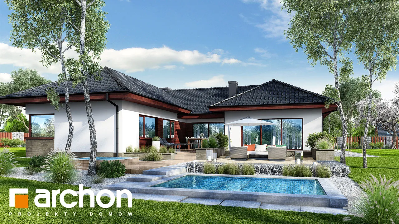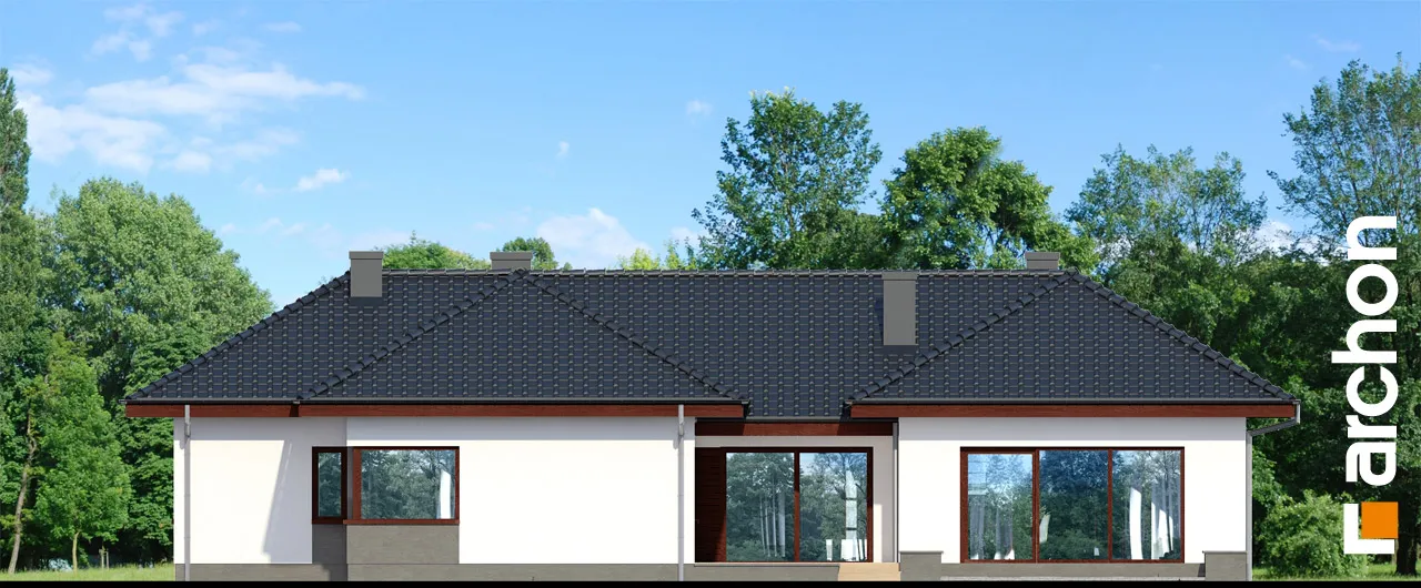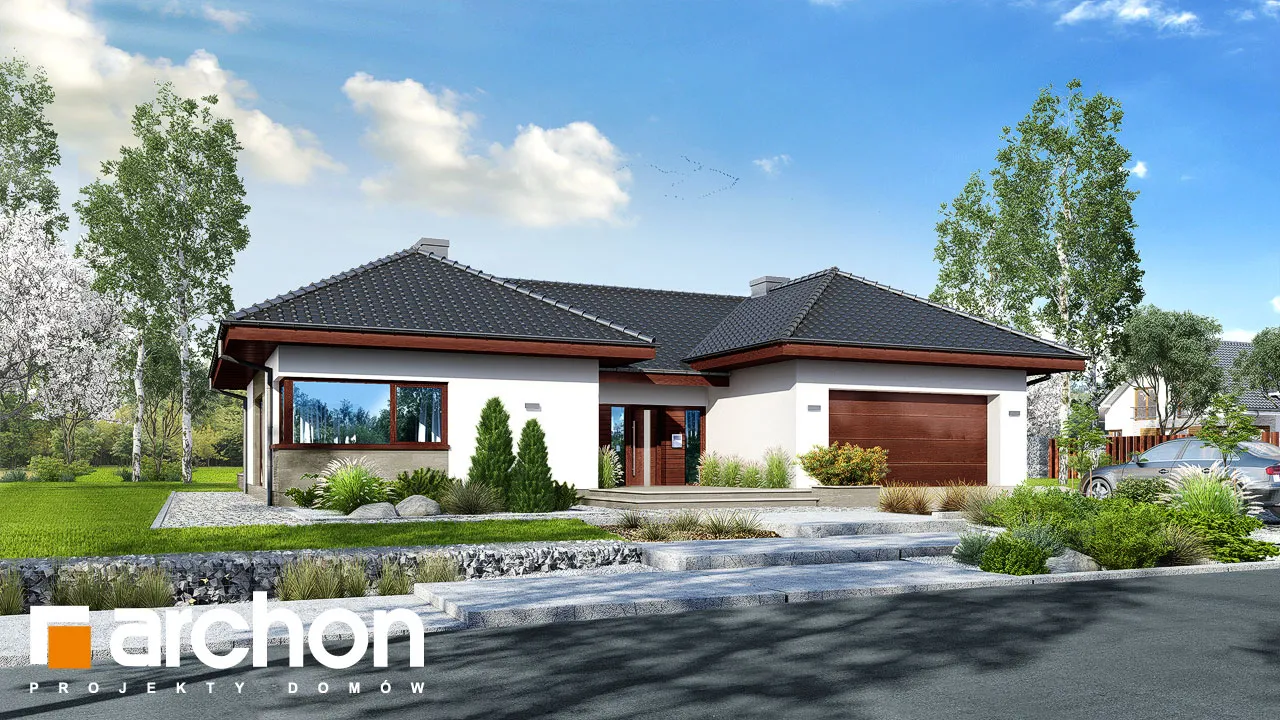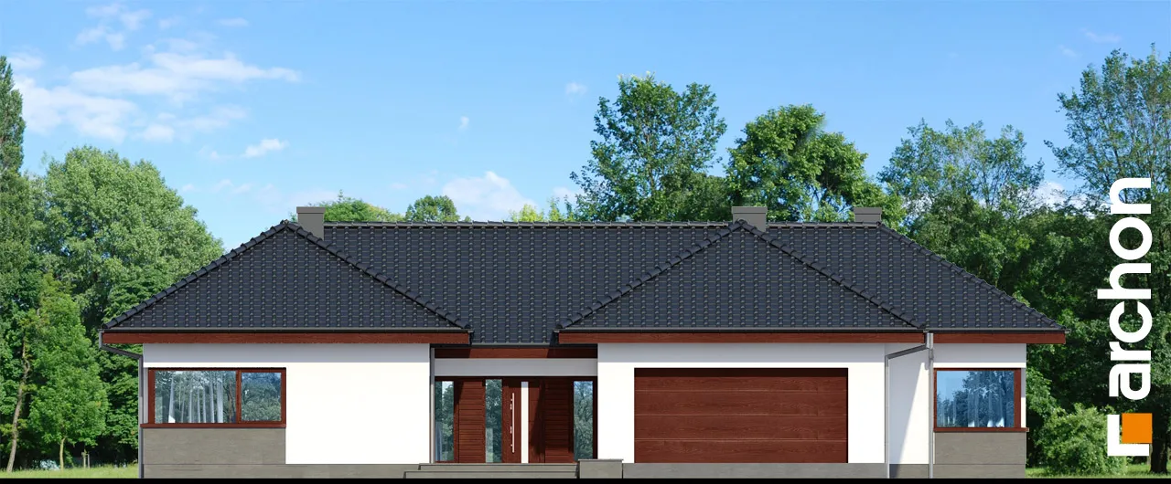 Проект одноэтажного дома с гаражом на две машины, который оправдает ожидания Инвесторов, ищущих просторные и комфортабельные дома. Стильная отделка фасада представляет собой сочетание светлой штукатурки и натуральной облицовки, которые вместе с черепицей цвета антрацита подчеркивают характер дома. Впечатляющее большое остекление делает интерьеры более привлекательными, а фасады - светлыми. Интересная композиция корпуса здания, который образован двумя крыльями, соединенными через середину, позволила очень четко разделить жилую и ночную части. На передней стороне здания была создана замкнутая, уединенная входная зона, а со стороны сада - привлекательная зона отдыха на открытом воздухе в виде патио. Вестибюль ведет в каминный зал, который выходит на террасу. Камин со стеклянной вставкой с трех сторон виден также из гостиной и с террасы. В меньшем крыле находится просторная жилая зона с широкой застекленной гостиной, открытой на террасу, и представительной столовой. Кухня имеет возможность быть отгороженной в соответствии с потребностями членов семьи. В нем предусмотрен полуостров с зоной для завтрака, широкие столешницы и много места для хранения. Она прекрасно освещена угловым окном, а функциональную программу дополняет кладовая. Туалет расположен рядом с вестибюлем. В большом крыле спроектирована удобная спальная зона. Здесь есть две детские спальни, большая спальня родителей с собственной гардеробной, кабинет и ванная комната. Из коридора, ведущего в частную зону, можно попасть в прачечную. Из тамбура можно пройти в гараж с двумя парковочными местами и далее в котельную. Проект предусматривает большое количество дополнительных мест для хранения в виде встроенных и навесных шкафов. Представленный проект дома относится к категории: проекты одноэтажных домов и проекты домов с котельной на твердом топливе.