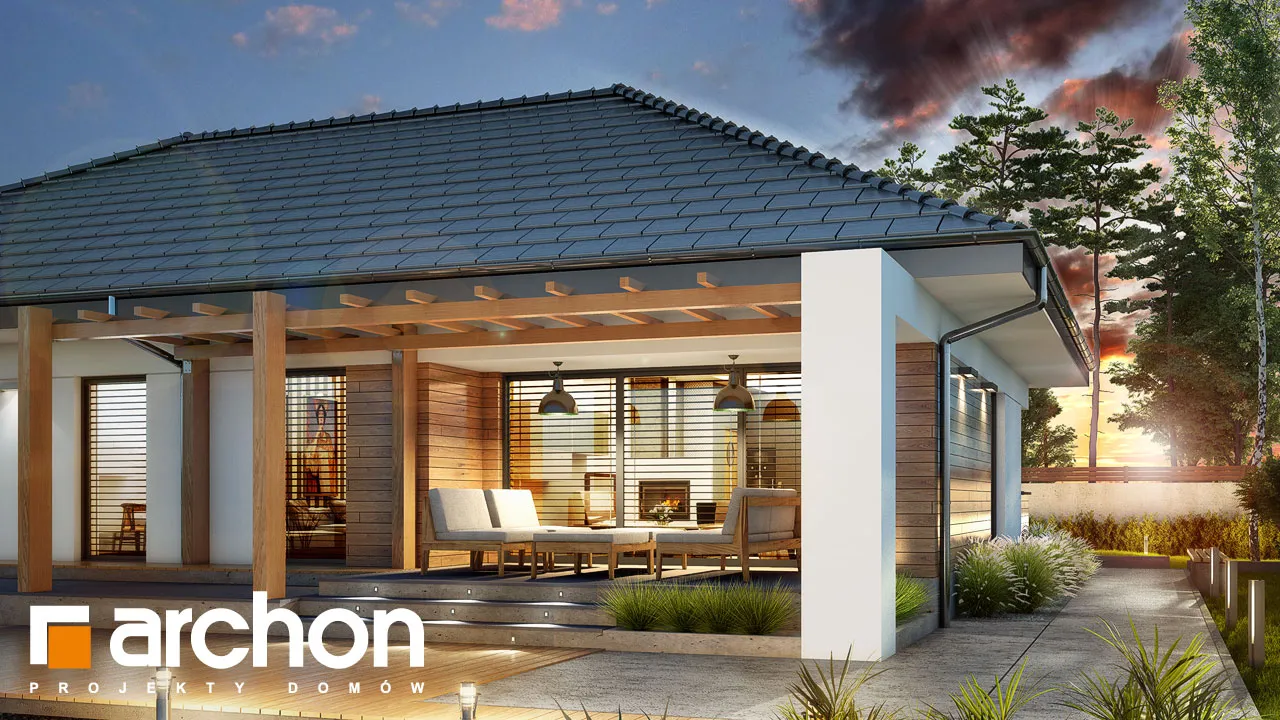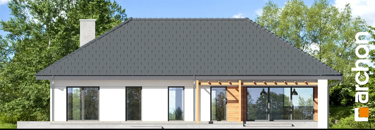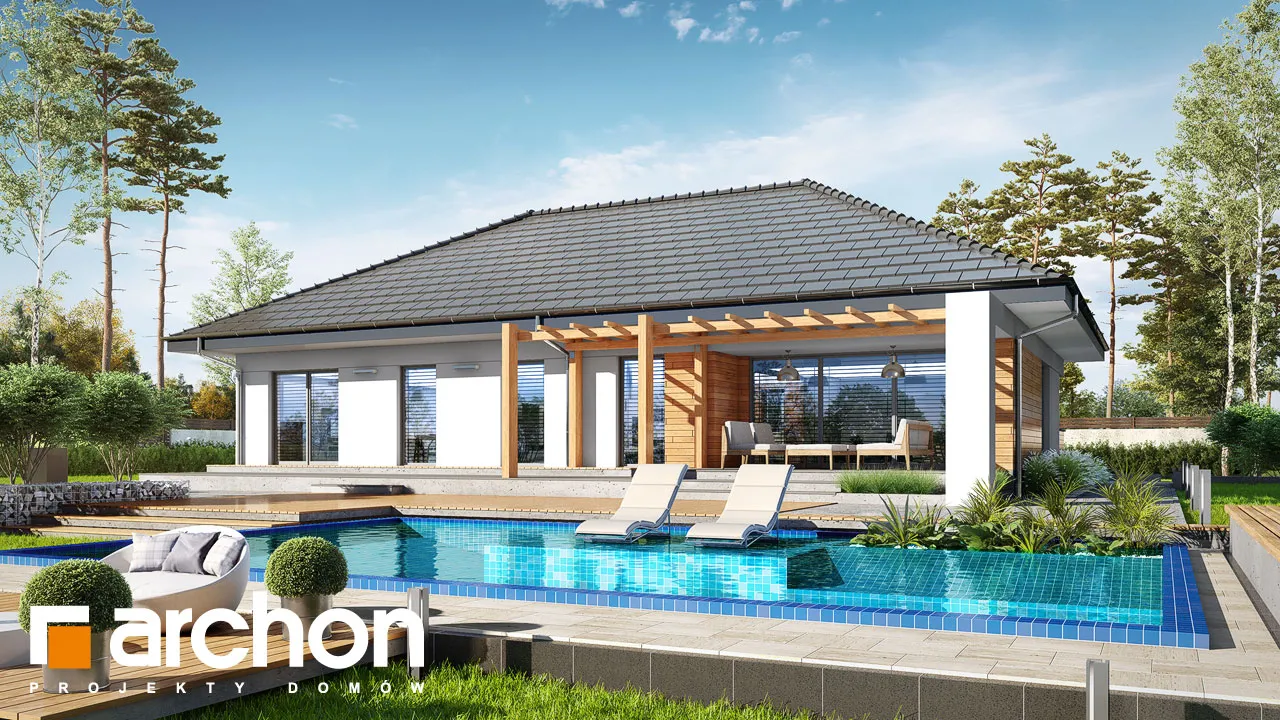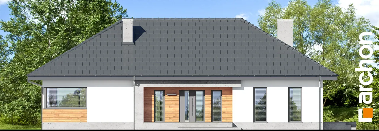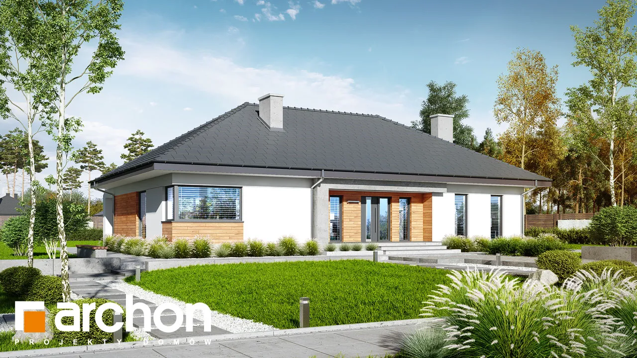 Этот проект одноэтажного дома обеспечит жильцам высокий уровень удобства в пределах одного этажа. Простой корпус дома выглядит впечатляюще в предложенном варианте расположения высоток, штукатурка с натуральной облицовкой обеспечивают современный и элегантный внешний вид. Практичный навес над входом создает аркаду. Дизайн дома предусматривает просторный, естественно освещенный вестибюль, где нашлось место для вместительных шкафов, вешалки для верхней одежды и сидений для удобного надевания обуви. Гостиная зона - это комфортное пространство, где семья проводит время вместе. Широкое остекление с раздвижной системой открывания плавно соединяет гостиную с частично крытой террасой и садом. Здесь жители могут организовать летнюю обеденную зону и расставить шезлонги в саду, чтобы насладиться отдыхом под солнечными лучами. Открытая кухня с расположенным по центру островом, которая идеально подходит для современных интерьеров, очень привлекательна и организована как зона приготовления пищи, предоставляя жильцам возможность комфортно готовить еду вместе. Со стороны столовой предусмотрены шкафы для столовой посуды. Преимуществом кухни в проекте "Дом в медовой траве" является просторная рабочая поверхность, большое угловое окно, обеспечивающее оптимальное освещение, и прилегающая кладовая, дополняющая пространство для хранения. Расположенная во второй части дома, частная зона вмещает четыре просторные спальни. Каждая из них имеет прямой выход в сад. Сосредоточившись на комфорте жильцов, представленный дизайн дома предусматривает две светлые ванные комнаты и прачечную, где также есть возможность свободно гладить одежду. Представленный проект "Дом в медовой траве" относится к коллекции: проекты одноэтажных домов, он также расширяет популярную категорию: проекты современных домов.