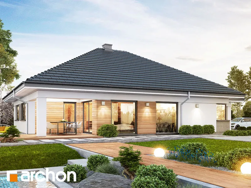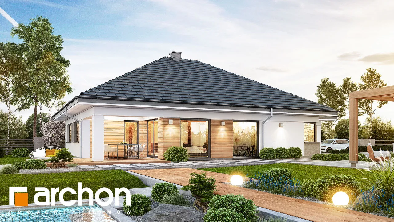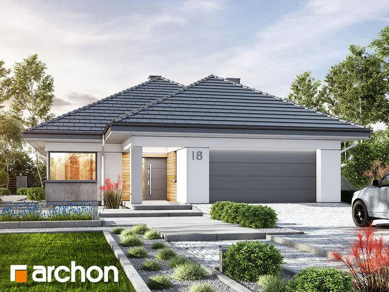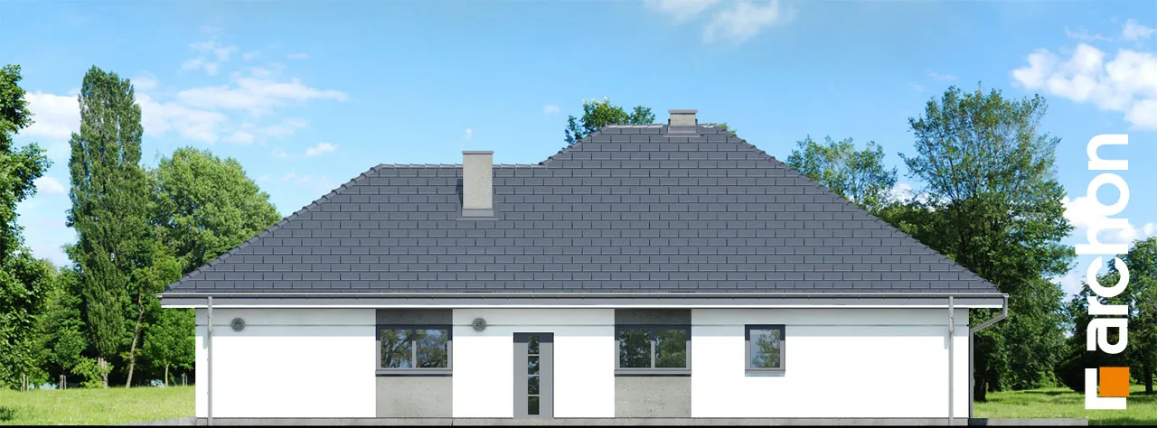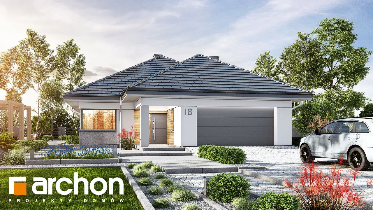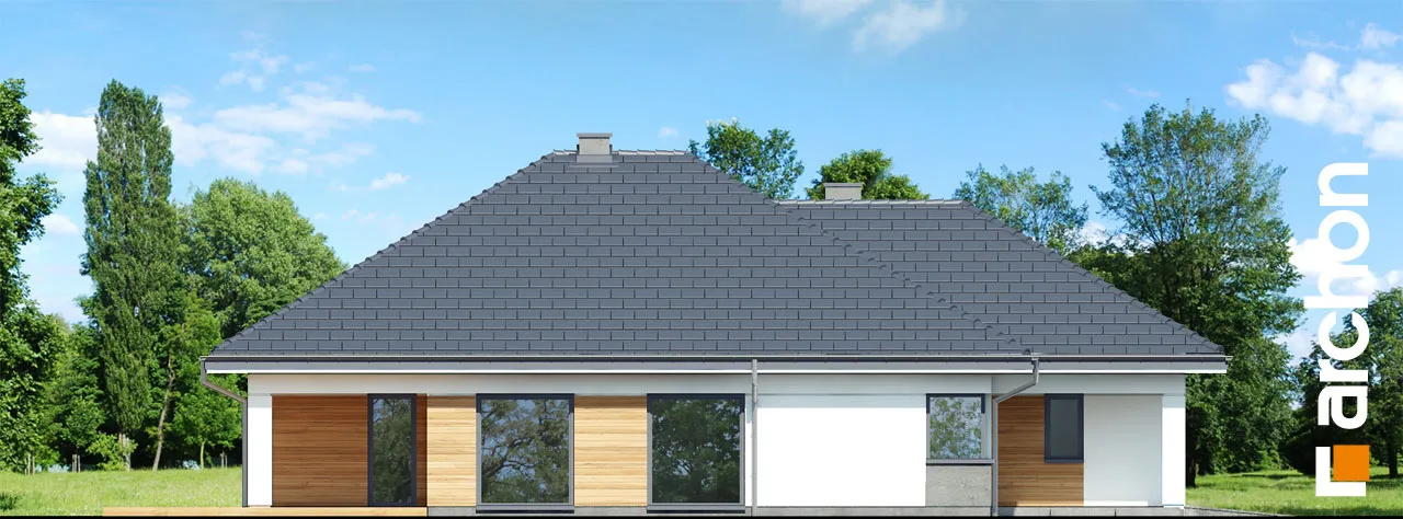 Современный проект одноэтажного дома, расширяющий популярное семейство "Домов в Ренклодах", имеющий в своей документации проект механической вентиляции, которая позволит снизить затраты на отопление дома. Спроектированная вентиляционная установка (рекуператор) обеспечивает эффективный обмен и циркуляцию воздуха в здании, тем самым обеспечивая комфорт использования. Стильная внешняя отделка соответствует современным архитектурным тенденциям - она сочетает светлую штукатурку с деревянной облицовкой и архитектурной бетонной конструкцией. Благодаря расширению гаража перед линией фасада, над главным входом был создан практичный навес. Панорамное остекление естественно освещает интерьеры и открывает их для окружающего дом сада. Угловая терраса была частично размещена в аркаде, став дополнительной зоной отдыха на открытом воздухе, с местом для летних обедов или уединенным кофейным уголком. Преимуществом проекта является функциональная планировка интерьеров и множество возможностей их обустройства. Просторная и удобная гостиная зона приглашает жильцов к совместному семейному отдыху. Открытая на террасу, гостиная имеет угловой диван с пуфами, а приятную атмосферу обеспечивает атмосферный камин. Столовая с большим столом расположена у панорамного окна, из которого открывается вид на зелень сада. Преимущество открытой кухни - оптимальное количество рабочих поверхностей, возможность использования высокой встроенной мебели и практичной барной стойки. Частная ночная зона спроектирована в глубине дома, где расположены спальня родителей с выходом на террасу, две детские комнаты и общая ванная комната с ванной и душевой кабиной. Программа дополнена дополнительной ванной комнатой с душем, кладовой, примыкающей к кухне, и котельной с отдельным выходом в сад, которая также служит прачечной. Широкий гараж на две машины доступен из тамбура. Этот привлекательный дом относится к коллекции: проекты современных домов, проекты небольших домов, проекты одноэтажных домов и проекты домов с механической вентиляцией.
