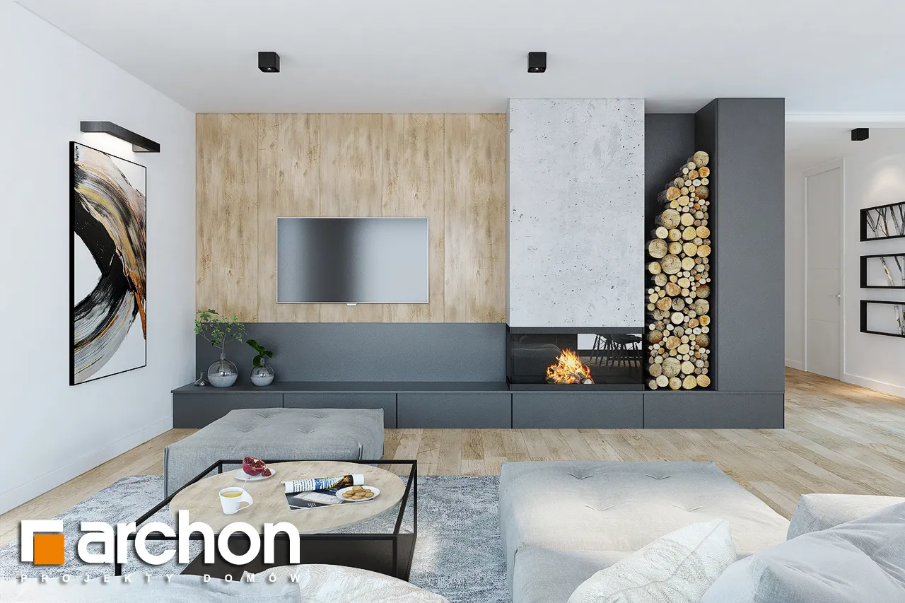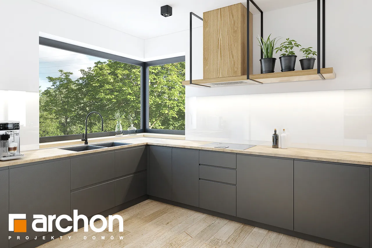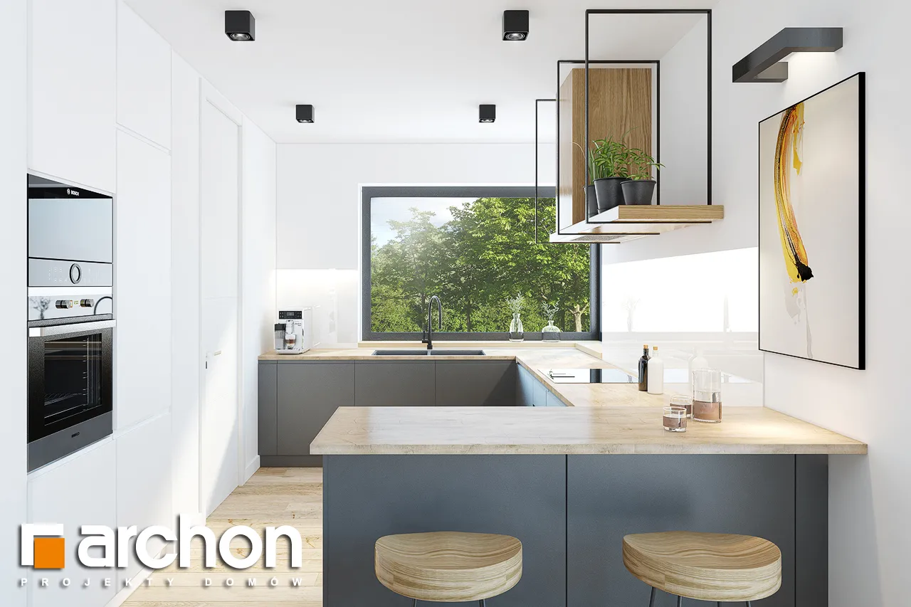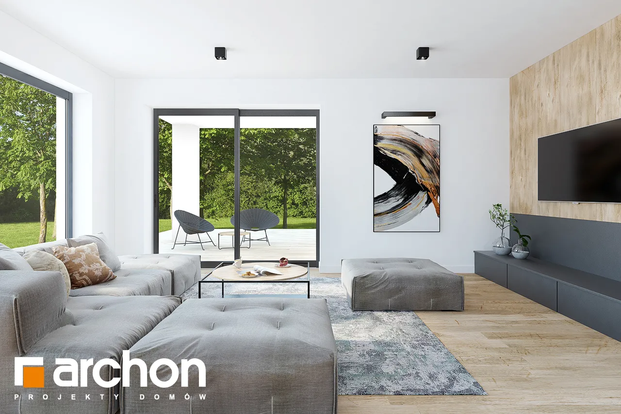 Современный проект одноэтажного дома, расширяющий популярное семейство "Домов в Ренклодах", имеющий в своей документации проект механической вентиляции, которая позволит снизить затраты на отопление дома. Спроектированная вентиляционная установка (рекуператор) обеспечивает эффективный обмен и циркуляцию воздуха в здании, тем самым обеспечивая комфорт использования. Стильная внешняя отделка соответствует современным архитектурным тенденциям - она сочетает светлую штукатурку с деревянной облицовкой и архитектурной бетонной конструкцией. Благодаря расширению гаража перед линией фасада, над главным входом был создан практичный навес. Панорамное остекление естественно освещает интерьеры и открывает их для окружающего дом сада. Угловая терраса была частично размещена в аркаде, став дополнительной зоной отдыха на открытом воздухе, с местом для летних обедов или уединенным кофейным уголком. Преимуществом проекта является функциональная планировка интерьеров и множество возможностей их обустройства. Просторная и удобная гостиная зона приглашает жильцов к совместному семейному отдыху. Открытая на террасу, гостиная имеет угловой диван с пуфами, а приятную атмосферу обеспечивает атмосферный камин. Столовая с большим столом расположена у панорамного окна, из которого открывается вид на зелень сада. Преимущество открытой кухни - оптимальное количество рабочих поверхностей, возможность использования высокой встроенной мебели и практичной барной стойки. Частная ночная зона спроектирована в глубине дома, где расположены спальня родителей с выходом на террасу, две детские комнаты и общая ванная комната с ванной и душевой кабиной. Программа дополнена дополнительной ванной комнатой с душем, кладовой, примыкающей к кухне, и котельной с отдельным выходом в сад, которая также служит прачечной. Широкий гараж на две машины доступен из тамбура. Этот привлекательный дом относится к коллекции: проекты современных домов, проекты небольших домов, проекты одноэтажных домов и проекты домов с механической вентиляцией.