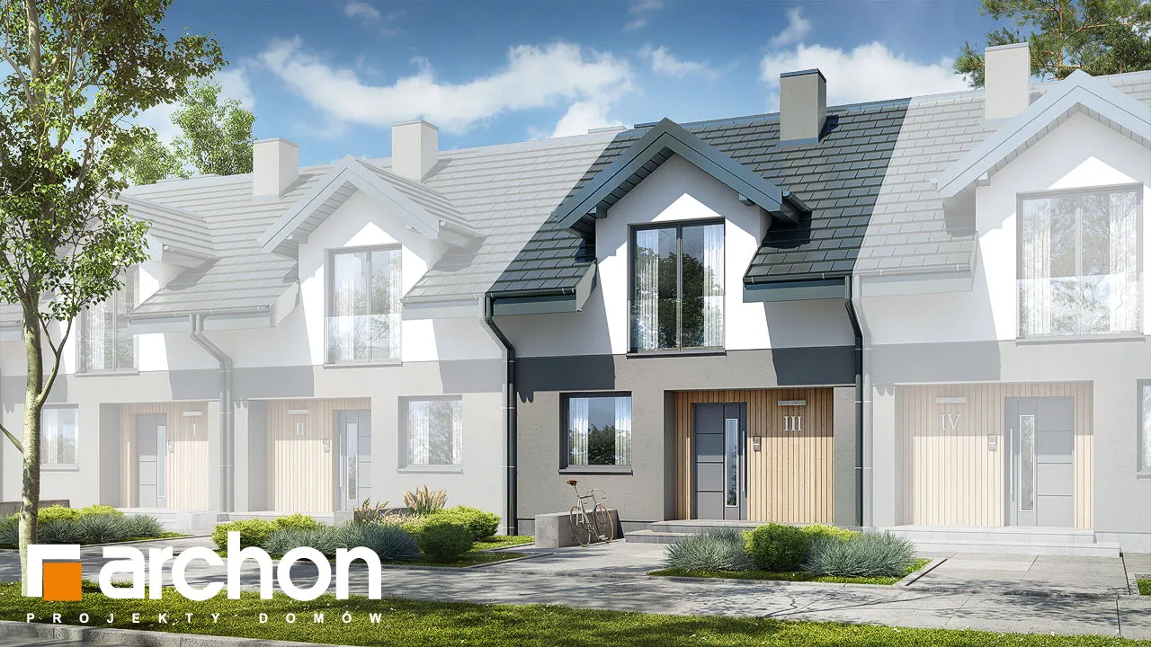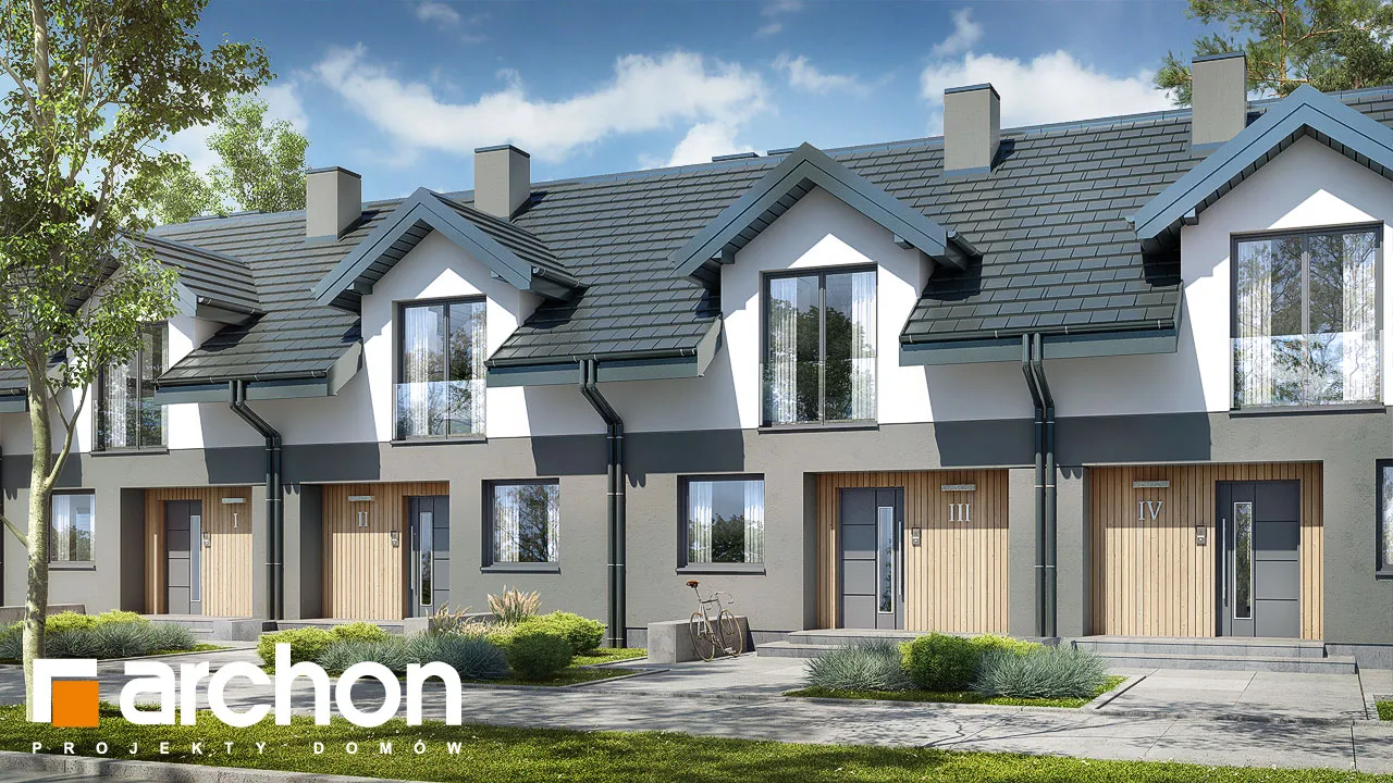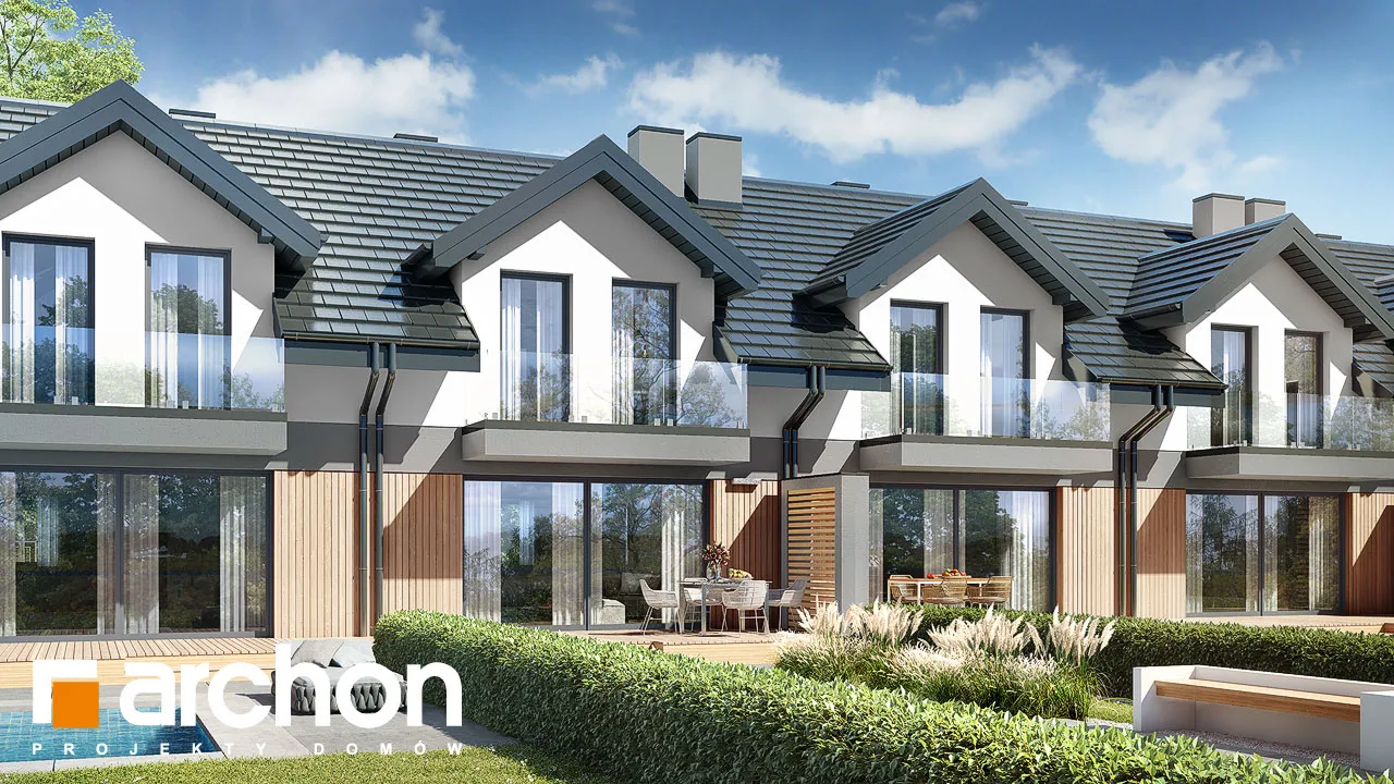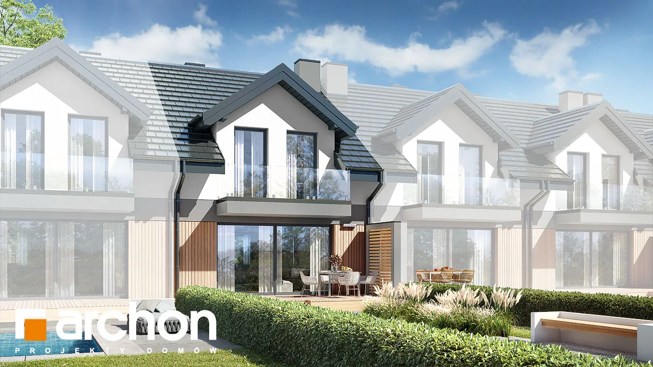 Интересный проект дома для рядовой застройки, в котором каждый сегмент представляет собой отдельную квартиру с функциональной программой. Привлекательный внешний вид здания обеспечивается сочетанием материалов облицовки. Первый этаж и мансарда выделены интересным образом с помощью различных цветов штукатурки, а деревянная облицовка используется в качестве акцентов. Функциональная арка закрывает главный вход в сегмент. Цельностеклянные балюстрады - современная деталь. Мансарда имеет мансардные окна, которые добавляют простор ночной зоне и увеличивают площадь комнат. Широкое остекление прекрасно открывает жилую зону для вида на сад, раздвижная система расширяет возможности дизайна интерьера и подчеркивает современный характер планировки. Спроектированная по схеме "U", кухня имеет удобную рабочую поверхность в сочетании с барной стойкой и соответствующим образом расположенными функциями. На первом этаже спроектирована дополнительная комната - идеальная спальня для ночевки гостей или кабинет для работы. Рядом с ним расположена ванная комната с душем. Под лестницей, ведущей в мансарду, организовано место для газовой котельной. Комфортные условия для уединенного отдыха предлагают жильцам три спальни, наполненные естественным светом. Рядом со спальней родителей спроектирован вместительный гардероб, а в детских комнатах предусмотрено место для шкафов. В детских комнатах есть выход на общий балкон. В центральной части мансарды расположена общая для всех ванная комната. Представленный проект относится к категории: проекты домов для рядовой застройки, проекты домов с жилой мансардой, проекты домов для застройщиков.