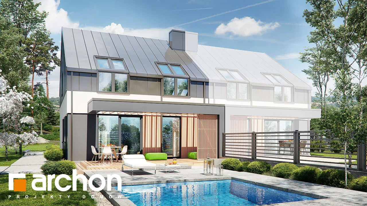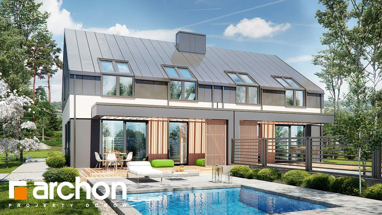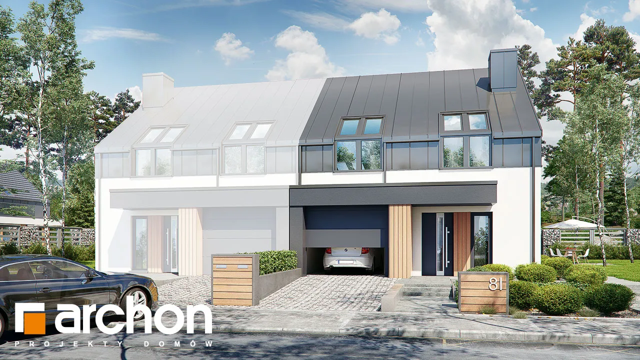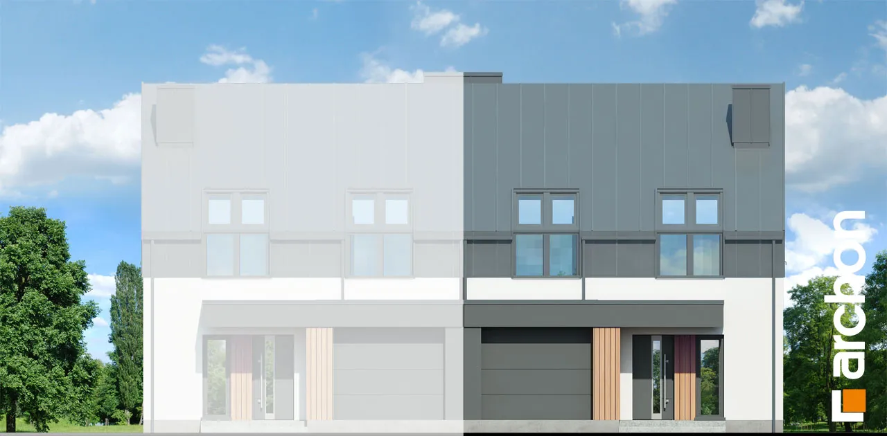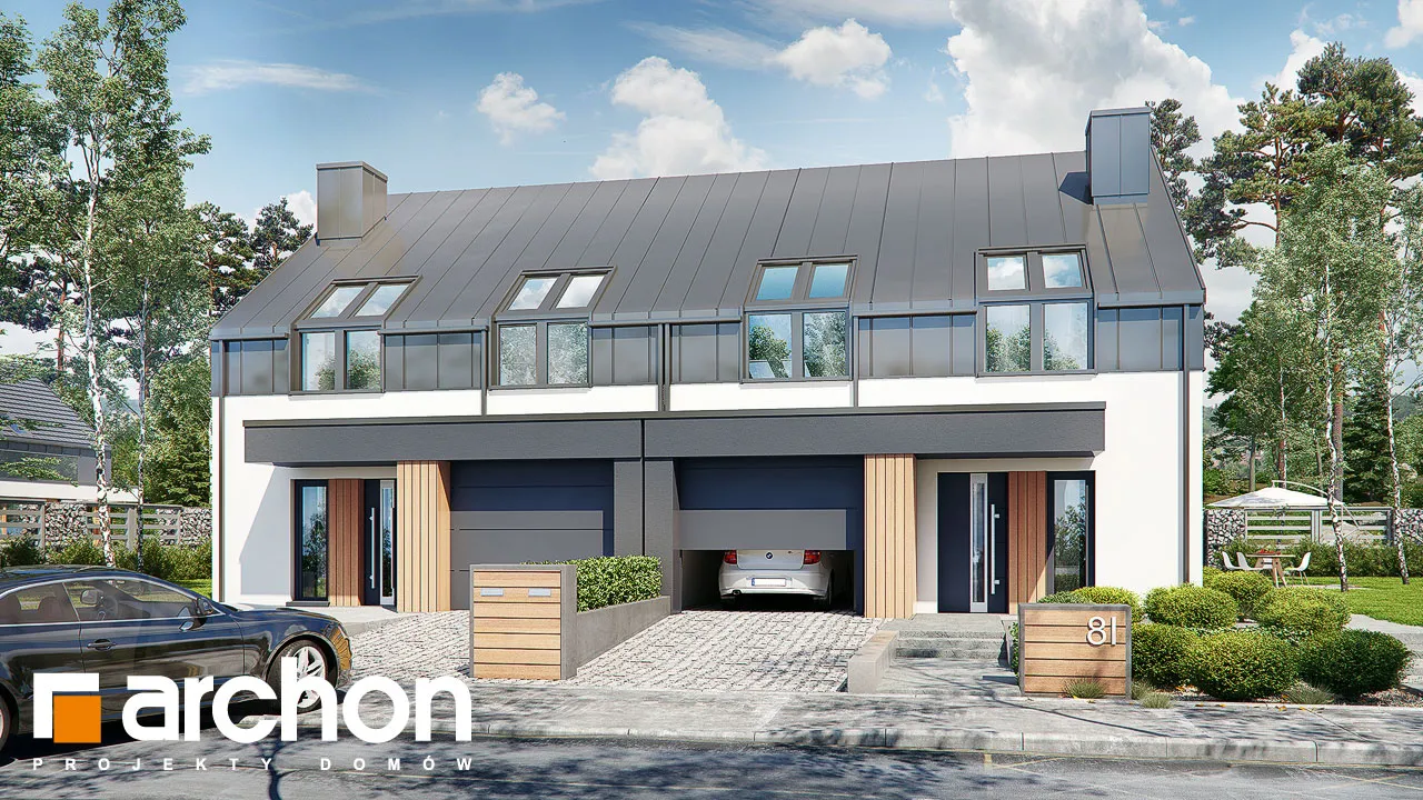 Проект дома с жилой мансардой и гаражом на одну машину, предназначен для сблокированной застройки, рекомендуется как для частной застройки, так и для застройщиков. Современный облик здания подчеркивается интересной композицией фасадов. Двускатная крыша покрыта модным металлическим листом, которым также частично отделаны мансардные этажи. Антрацитовый цвет металлического листа идеально сочетается с оттенком деревянной отделки. Гараж, выступающий перед основной линией передней стены, покрыт плоской крышей, которая также закрывает главный вход в здание. Спроектированная со стороны сада терраса-зона отдыха предлагает жителям комфортный отдых на свежем воздухе. Жилое пространство первого этажа прекрасно освещено, широкое остекление привлекательно открывает интерьер в сад. Кухня расположена в форме буквы "U", здесь предусмотрен просторный полуостров, который визуально обозначает границу кухни. В тамбуре и в прихожей можно установить вместительные шкафы-купе, которые обеспечат удобное хранение одежды и инвентаря. Ванная комната с душем завершает программу первого этажа, гараж и котельная для твердого топлива доступны из тамбура. В ночной зоне были спроектированы четыре комнаты, предлагающие жильцам комфортное пространство для уединенного отдыха и учебы, а также светлую ванную комнату. "Дом в нарциссах 2 (Б)" расширяет коллекцию: проекты домов для сблокированной застройки, проекты домов для застройщиков, проекты небольших домов.