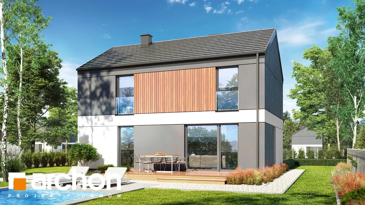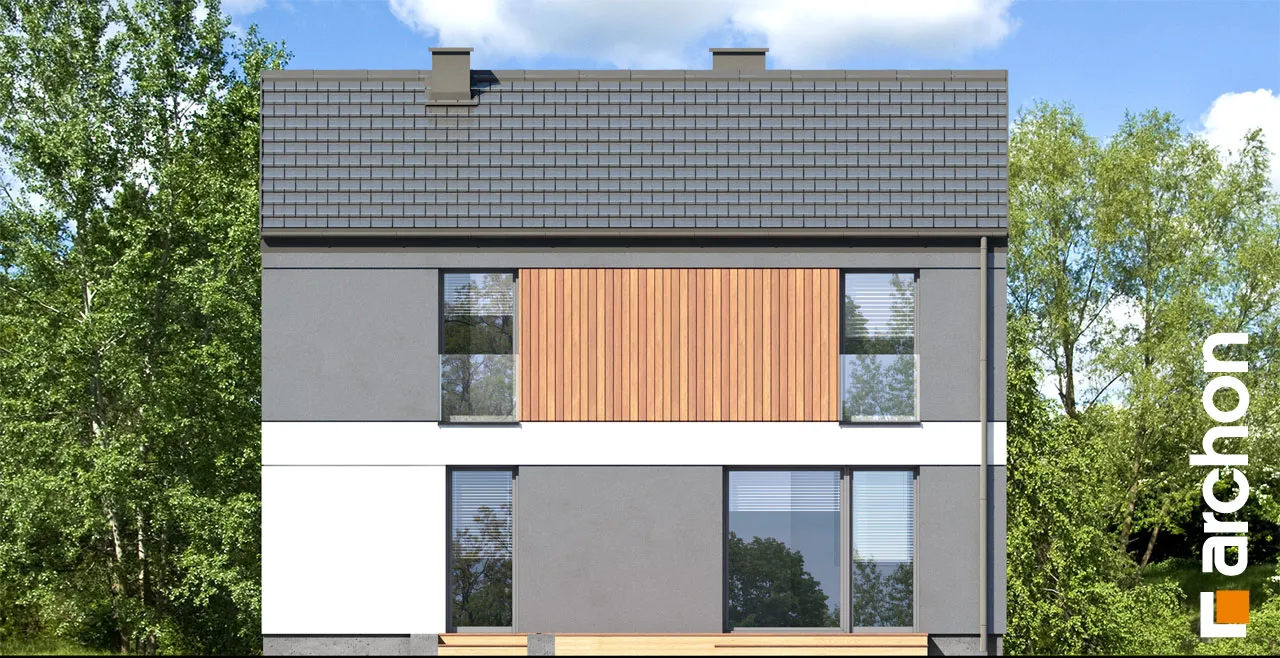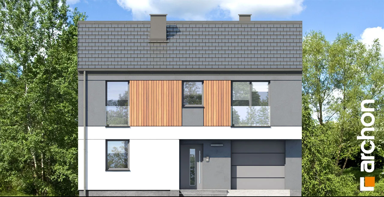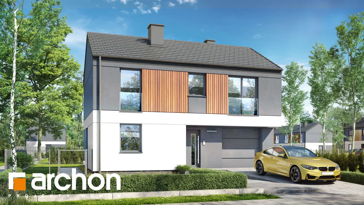 Проект современного дома с гаражом на одну машину. Отлично подходит для реализации на неглубоких участках, имеет привлекательную функциональную программу, которая оптимально организует небольшой интерьер. Простая форма корпуса здания прекрасно вписывается в современные архитектурные тенденции, а также способствует достижению высоких энергетических параметров дома. Белая и серая штукатурка эффектно гармонирует с деревянной облицовкой, которая является интересным декоративным акцентом. Терраса увеличивает гостиную, а столовая примыкает к просторной кухне. Функциональная программа кухни дополнена кладовой. Туалет расположен рядом с лестницей, а в гараже, доступном через тамбур, выделена практичная кладовая. Ночная зона в мансарде включает четыре комфортабельных комнаты, которые получили простор благодаря более высокой коленной стене. Правильное освещение обеспечивается современными портьерами, а удобство хранения - вместительными шкафами в каждой комнате. "Дом в мураях" - это готовый проект дома из коллекции: проекты домов с жилой мансардой, проекты современных домов.