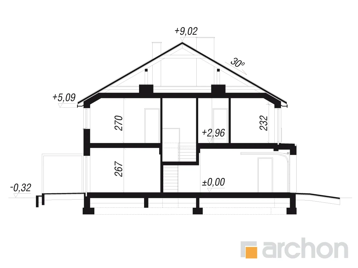 - Разрезы со всеми размерами (высоты этажей, кровли и др.)
