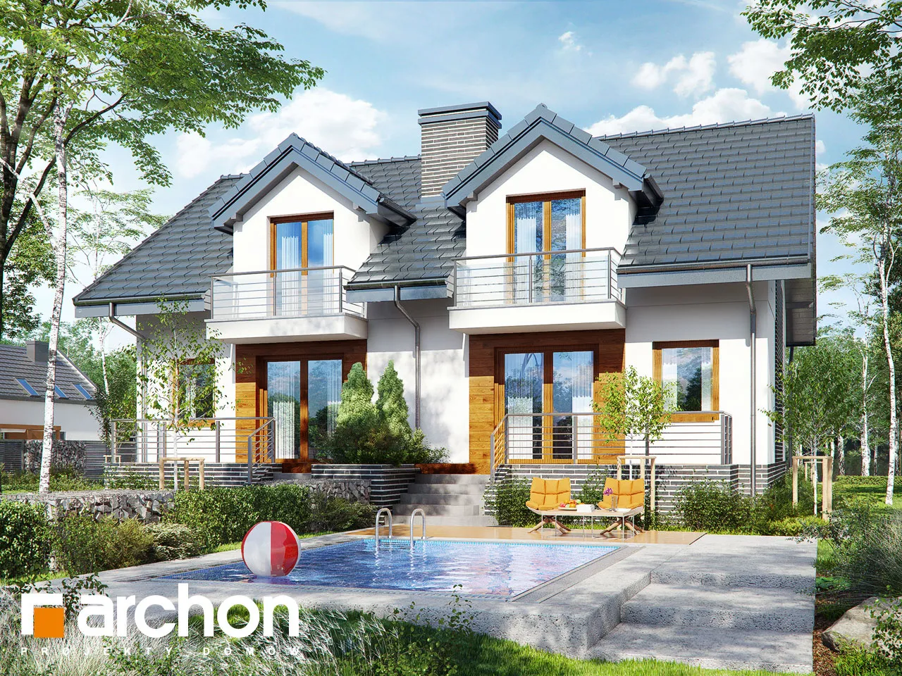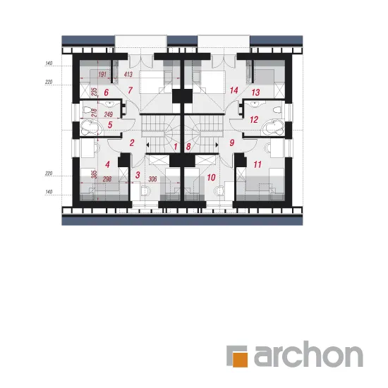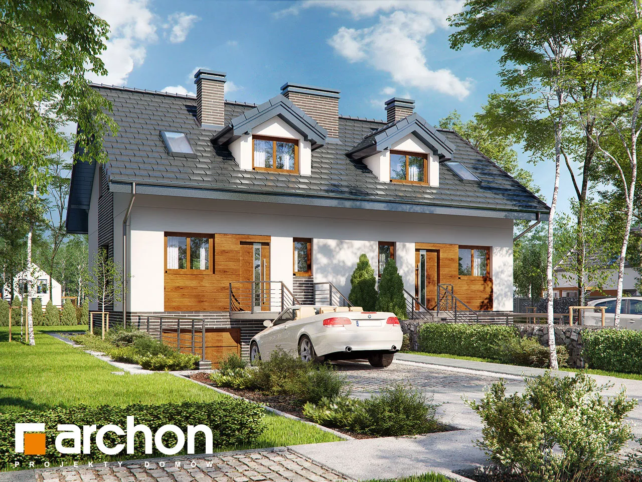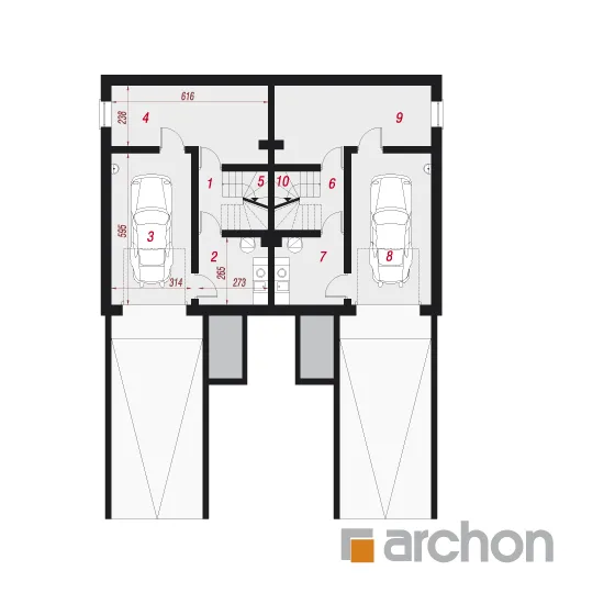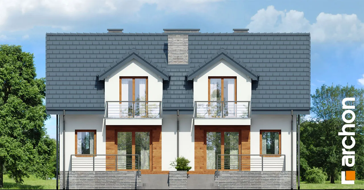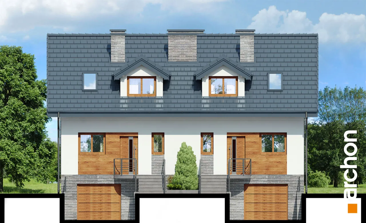 Функциональный и удобный дом для сблокированной застройки с подвалом, состоящий из двух сегментов. Подвал дома является полностью хозяйственным помещением. Имеется гараж, котельная на твердом топливе и большое подсобное помещение. Первый этаж - это открытая гостиная зона, просторная и прекрасно освещенная, с выходом на террасу и местом для домашнего кинотеатра и камина. Столовая соединяет открытую кухню с гостиной. Удобная двухмаршевая лестница ведет в мансарду, где расположены три спальни и ванная комната. Рядом со спальней родителей был спроектирован гардероб.