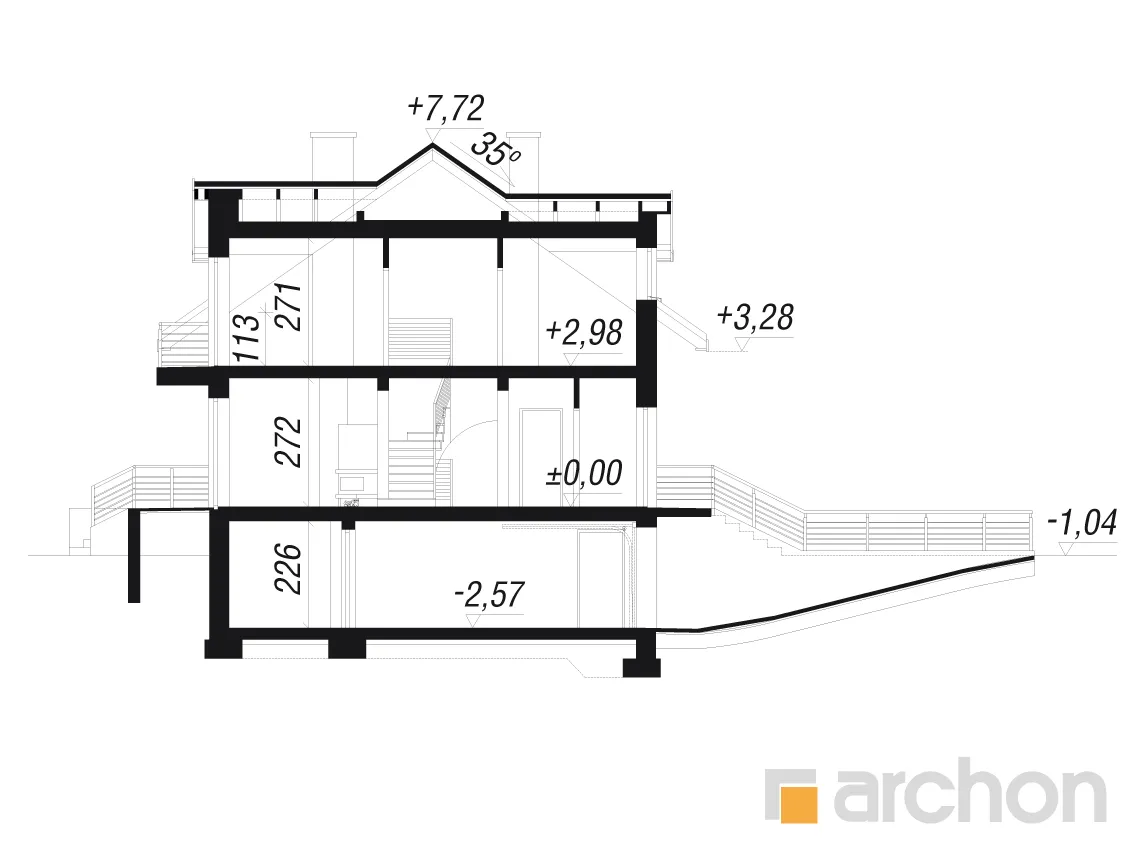 - Разрезы со всеми размерами (высоты этажей, кровли и др.)