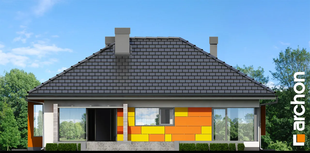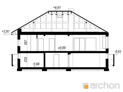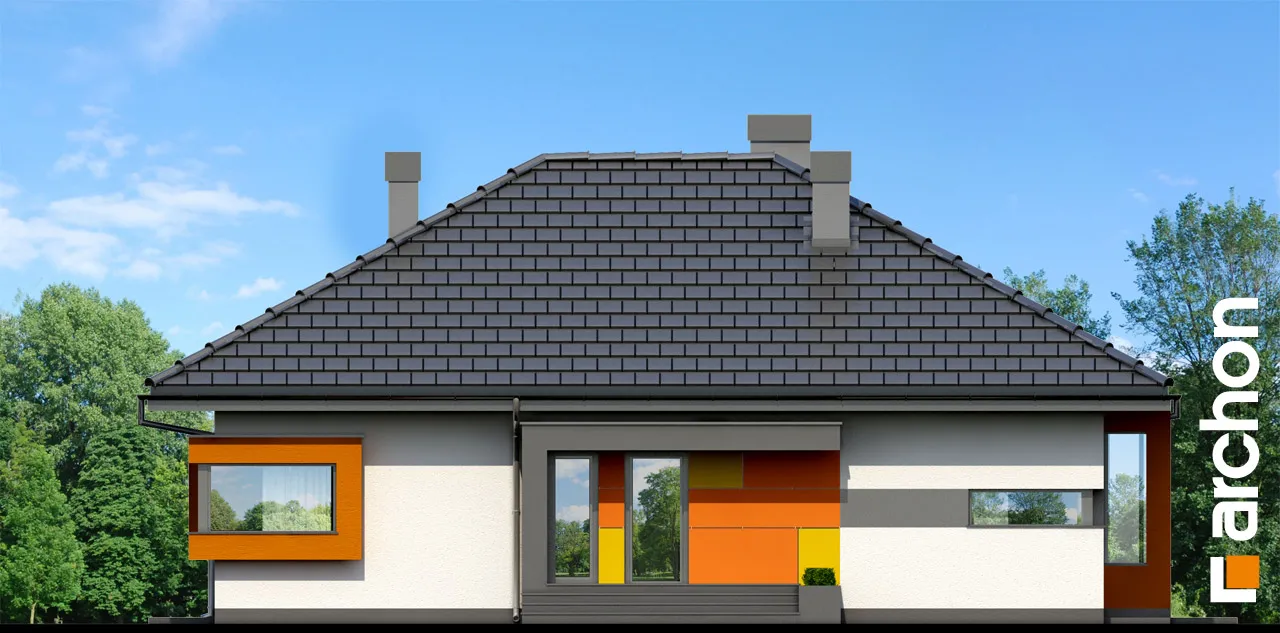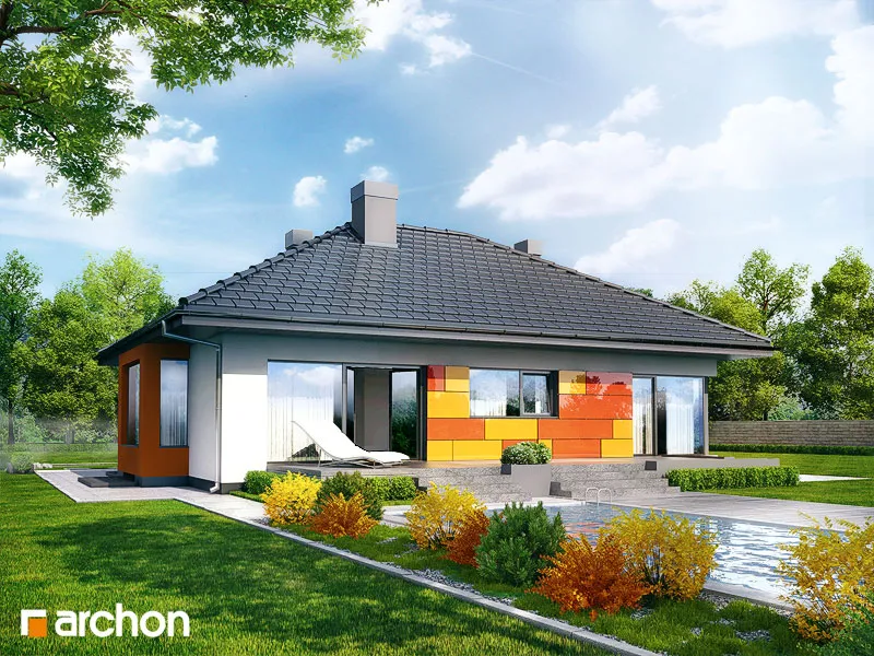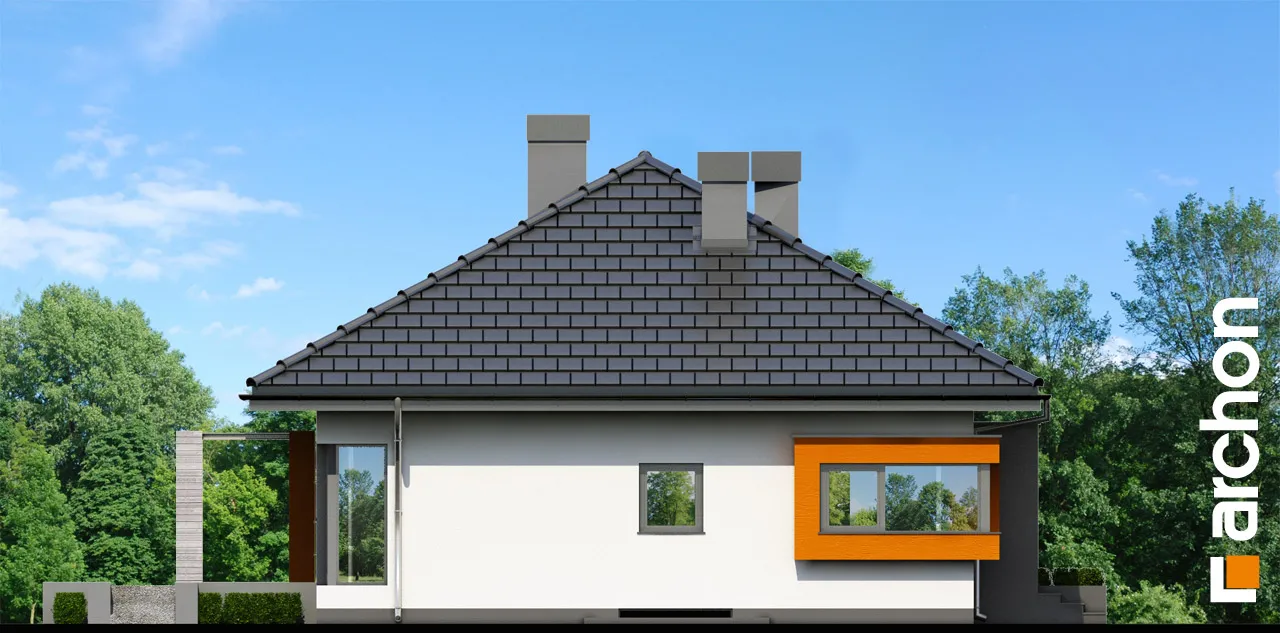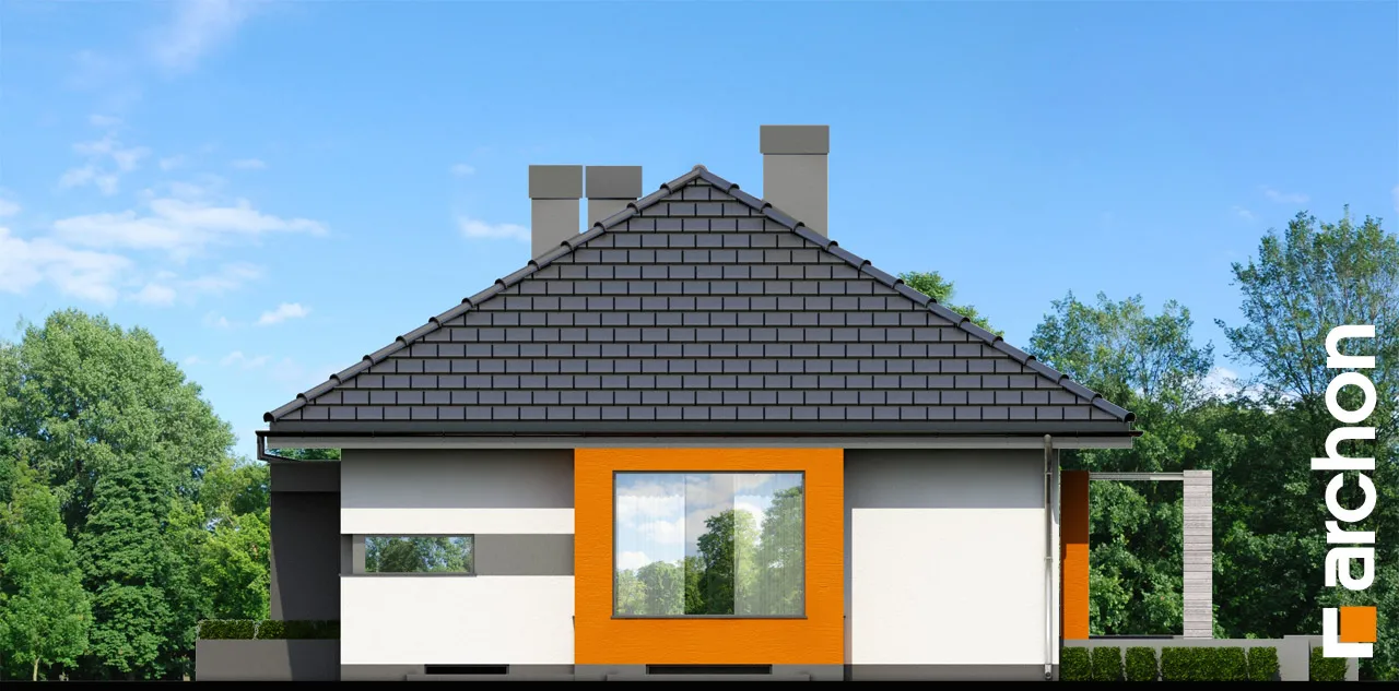 Привлекательный, современный дом с подвалом и обширной функциональной программой. Жилая зона состоит из гостиной с камином и выходом на крытую террасу, столовой, расположенной в застекленном эркере, и открытой кухни с кладовой. С другой стороны дома находится спальная зона с тремя комфортабельными комнатами и ванной комнатой. Рядом с входной дверью был спроектирован спуск в подвал. Внизу находится котельная, большая прачечная и подсобные помещения. Здание имеет простую структуру и современный стиль. Определенные цвета фасада, соответствующие современным тенденциям, оживляют массив и выделяют здание с точки зрения оригинальности.