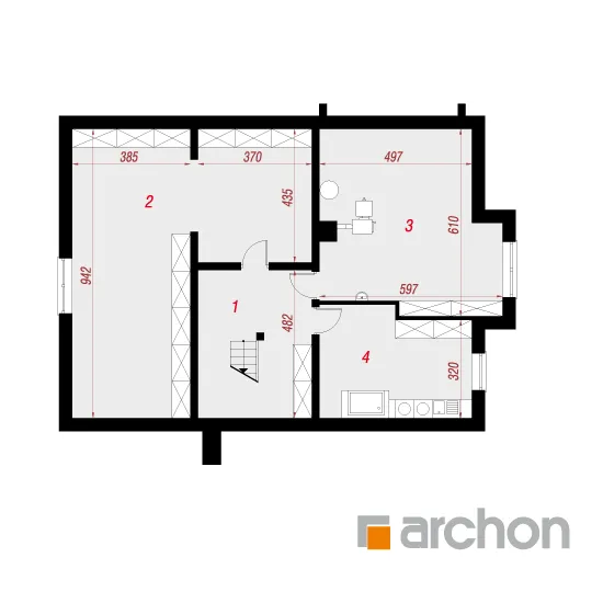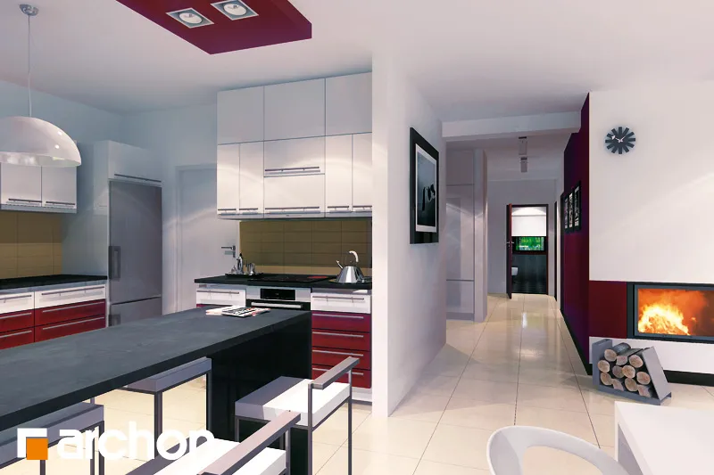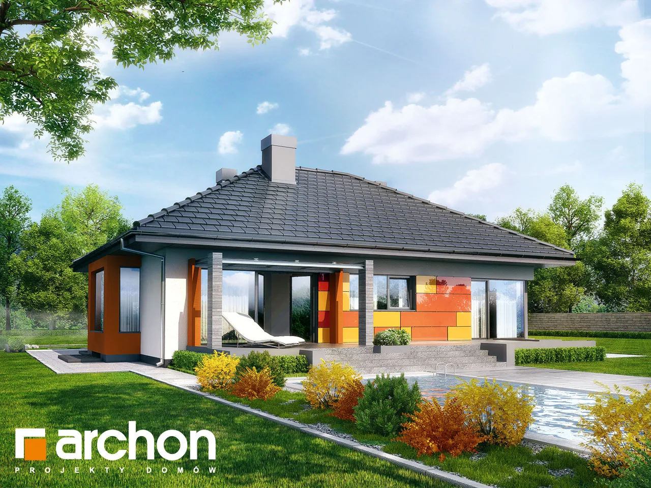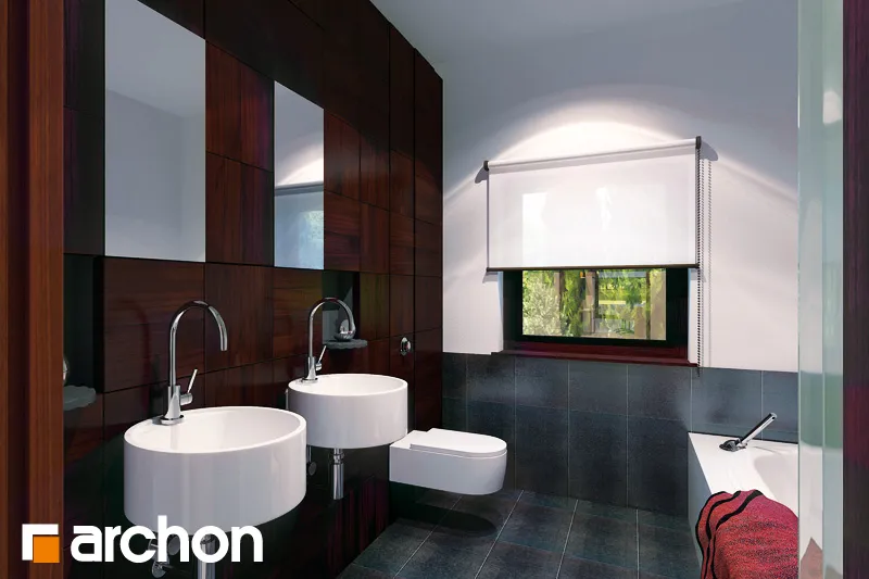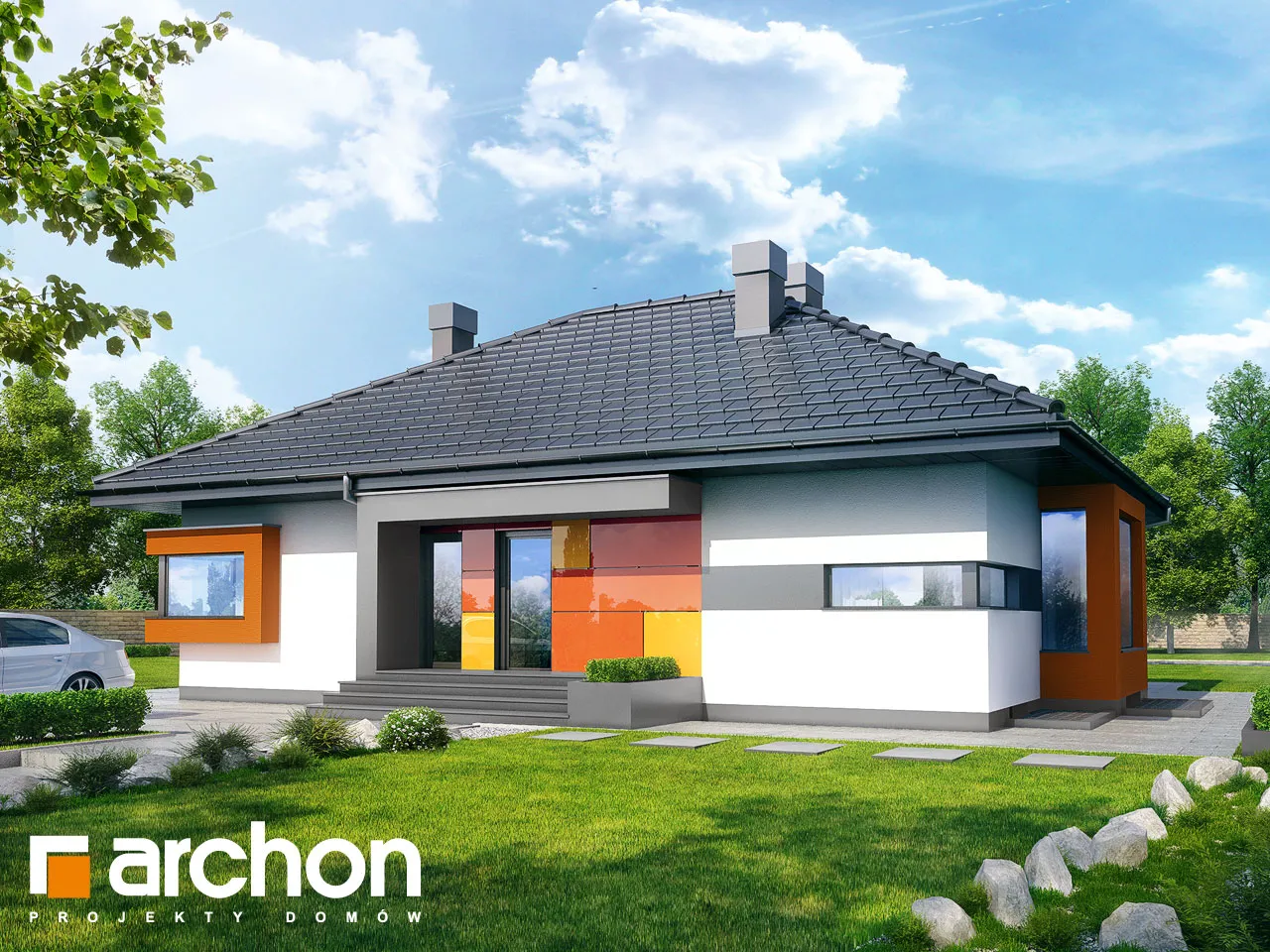 Привлекательный, современный дом с подвалом и обширной функциональной программой. Жилая зона состоит из гостиной с камином и выходом на крытую террасу, столовой, расположенной в застекленном эркере, и открытой кухни с кладовой. С другой стороны дома находится спальная зона с тремя комфортабельными комнатами и ванной комнатой. Рядом с входной дверью был спроектирован спуск в подвал. Внизу находится котельная, большая прачечная и подсобные помещения. Здание имеет простую структуру и современный стиль. Определенные цвета фасада, соответствующие современным тенденциям, оживляют массив и выделяют здание с точки зрения оригинальности.