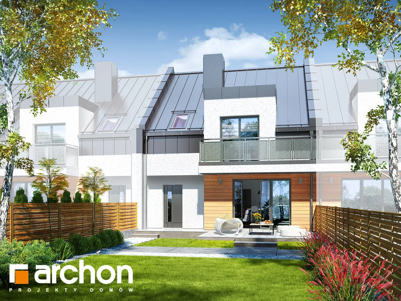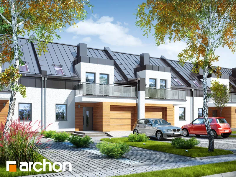 Экономичный и функциональный проект дома для рядовой застройки. Стоит обратить внимание на прямоугольные мансардные окна в современном стиле. Гаражом на одну машину, выступающий на переднем плане, создал привлекательный навес над входом. Жилая зона первого этажа состоит из светлой и просторной гостиной, столовой с большим семейным столом и открытой кухни с кладовой. Просторная терраса, расположенная со стороны садового возвышения, значительно увеличивает зону отдыха гостиной. Для удобства жителей на первом этаже был спроектирован туалет. Из тамбура есть прямой проход в гараж, а затем в котельную. В котельную можно попасть из сада, там же есть место для хранения. В мансарде находится приватная зона для жильцов, включающая три хорошо освещенные спальни. В главной спальне есть балкон с видом на сад и удобная гардеробная, две другие спальни имеют общий балкон, в одной из них также есть гардеробная. В мансарде также имеется общая ванная комната.