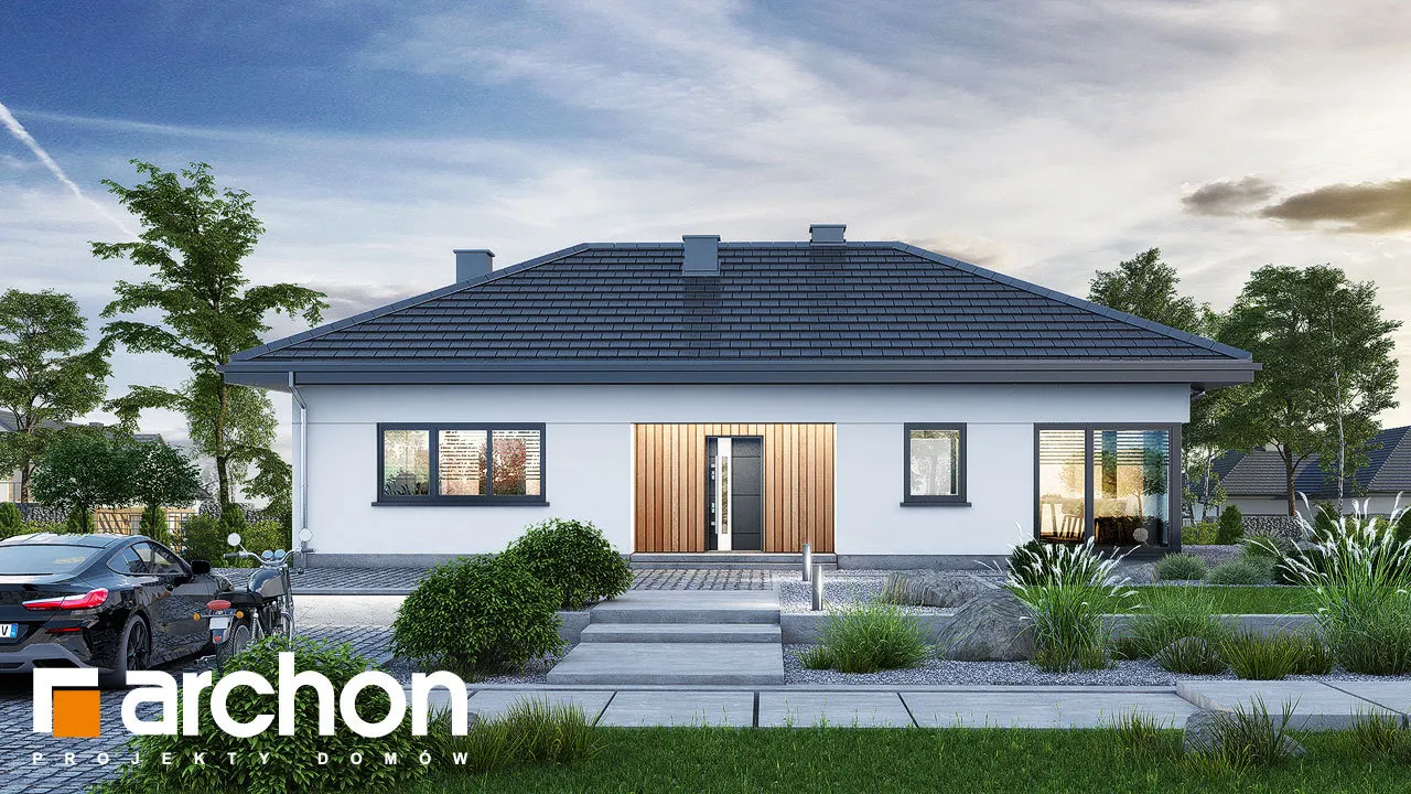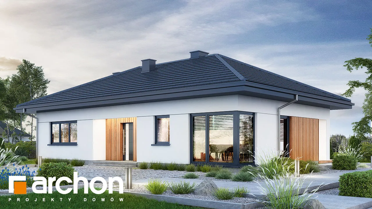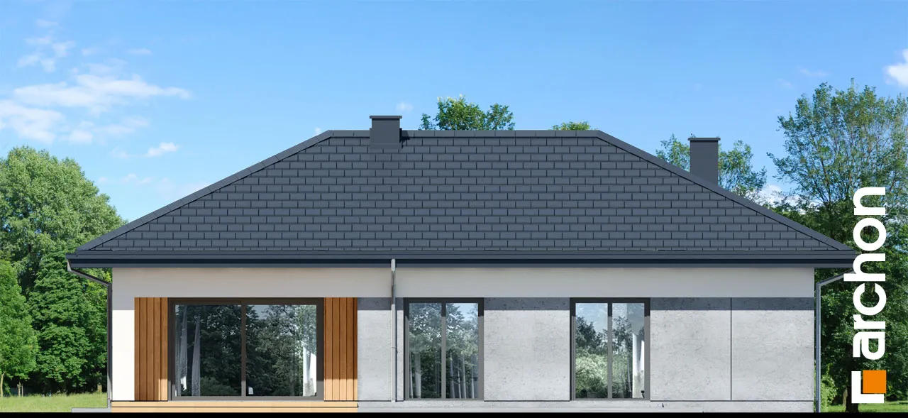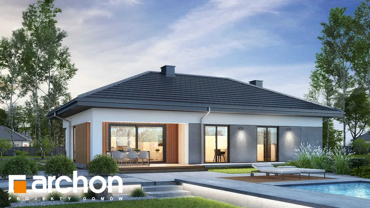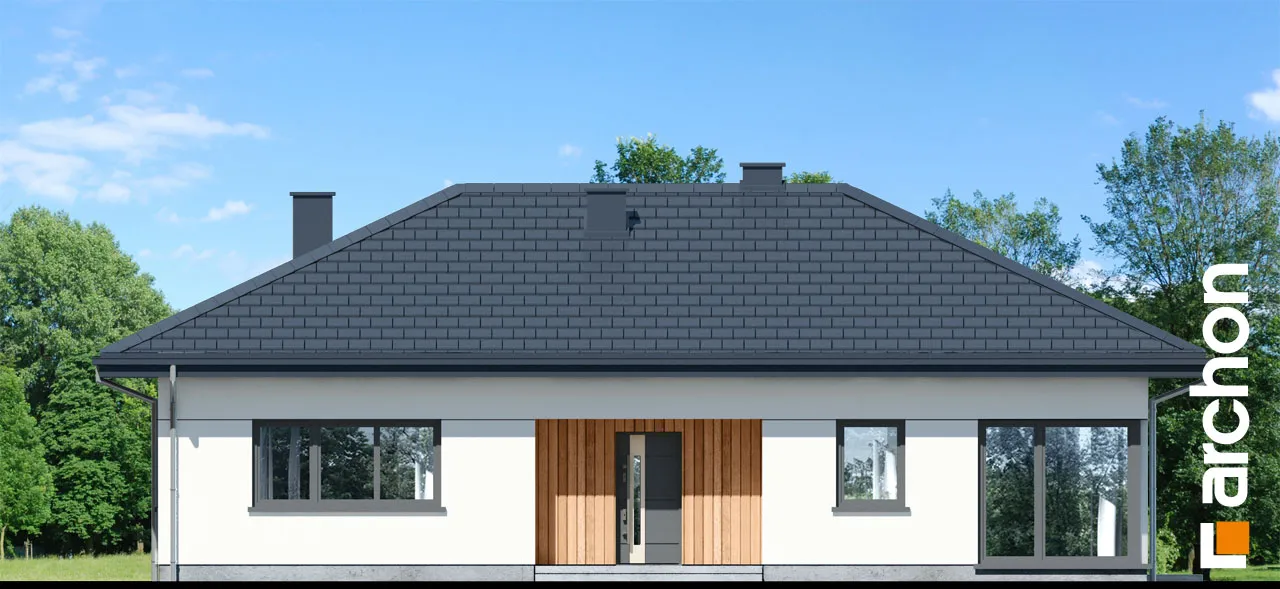 Это проект небольшого, функционального одноэтажного дома современной стилистики. Компактный, пропорциональный корпус дома приобрел интересный внешний вид за счет остекления и интересного разделения фасада. В парадной зоне внимание привлекает расположенная по центру и подчеркнутая натуральной облицовкой входная арка и большое, угловое остекление. Прекрасно освещенная жилая зона включает просторную гостиную с раздвижным выходом на террасу, что увеличивает пространство для отдыха в доме. Она частично покрыта крышей, что делает ее идеальной в качестве летней столовой. Продуманная кухня имеет просторный полуостров, где можно организовать современную зону приготовления пищи, совмещенную с рабочей поверхностью и барной стойкой. Примыкающая к кухне столовая вмещает большой семейный стол, который можно раздвинуть. Отдельные комнаты расположены во второй части дома, включая комфортабельную спальню родителей с собственным просторным гардеробом, и две комнаты для детей. Комнаты, расположенные со стороны сада, имеют прямой выход на террасу. Хозяйственная программа представленного дома также включает две ванные комнаты и газовую котельную, которая также может служить в качестве прачечной. "Дом в амерсах" - это готовый проект одноэтажного дома, относящийся к коллекции: проекты небольших домов, проекты домов в современном стиле.