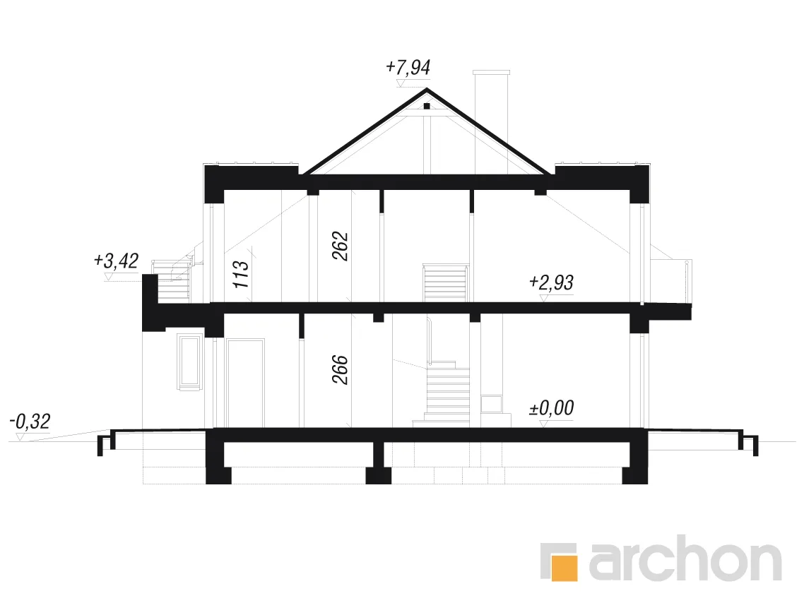 - Разрезы со всеми размерами (высоты этажей, кровли и др.)