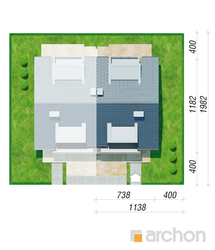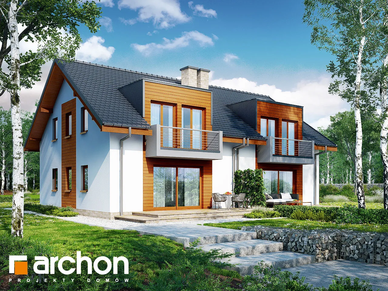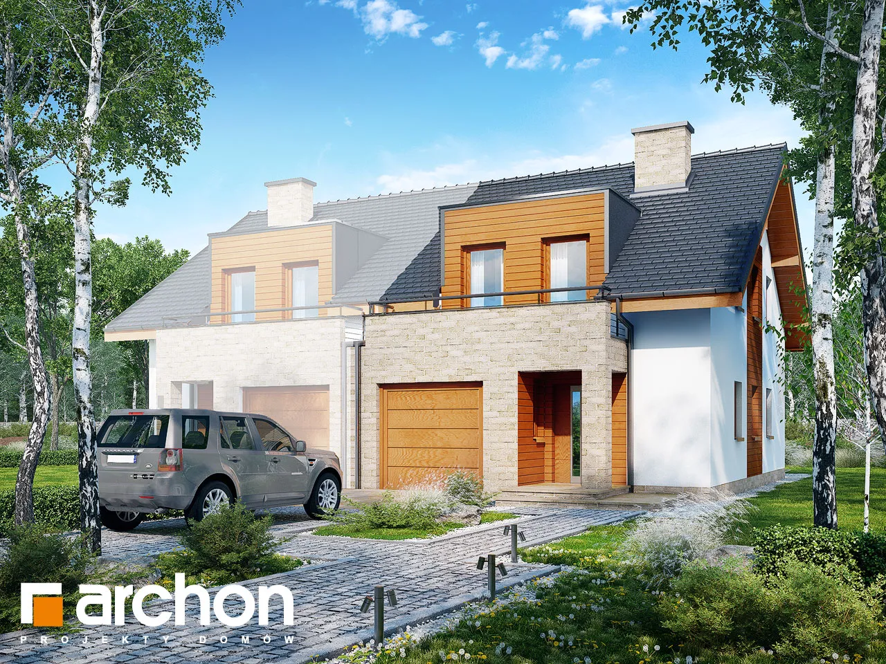 Элегантный дом для сблокированной застройки с функционально продуманной планировкой комнат. Простую форму корпуса дома разнообразят прямоугольные эркеры, а входная зона привлекает внимание практичной аркой. Жилая зона на первом этаже состоит из гостиной с местом для отдыха у домашнего кинотеатра и камина, а также столовой. Удобная терраса является продолжением зоны отдыха, а большое остекление привлекательно освещает интерьер. Открытая кухня соединена со столовой через барную стойку. В хозяйственной части находится гараж, доступный из тамбура. Мансарда была спроектирована как приватная зона для жильцов. К вашим услугам четыре светлых комнаты с балконами и общей ванной комнатой.