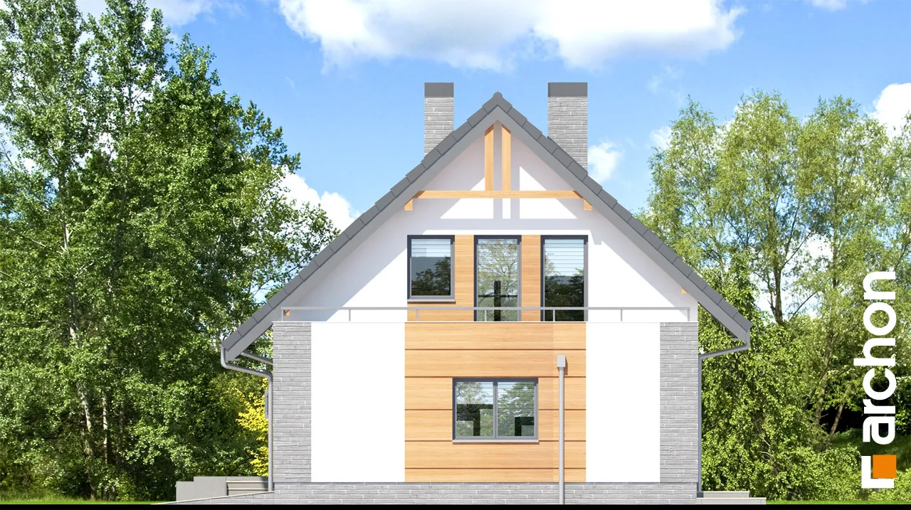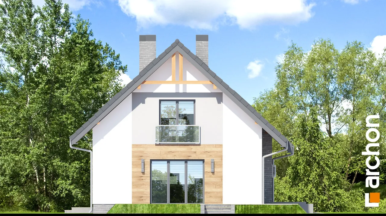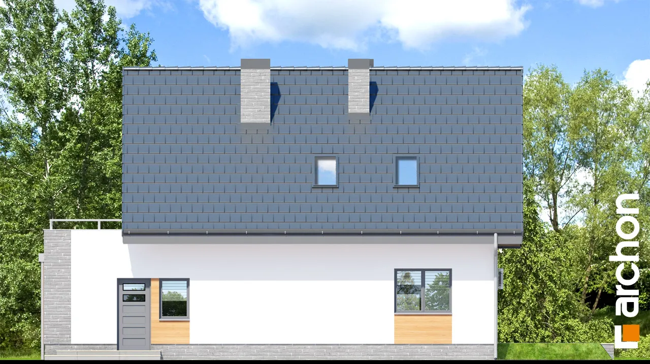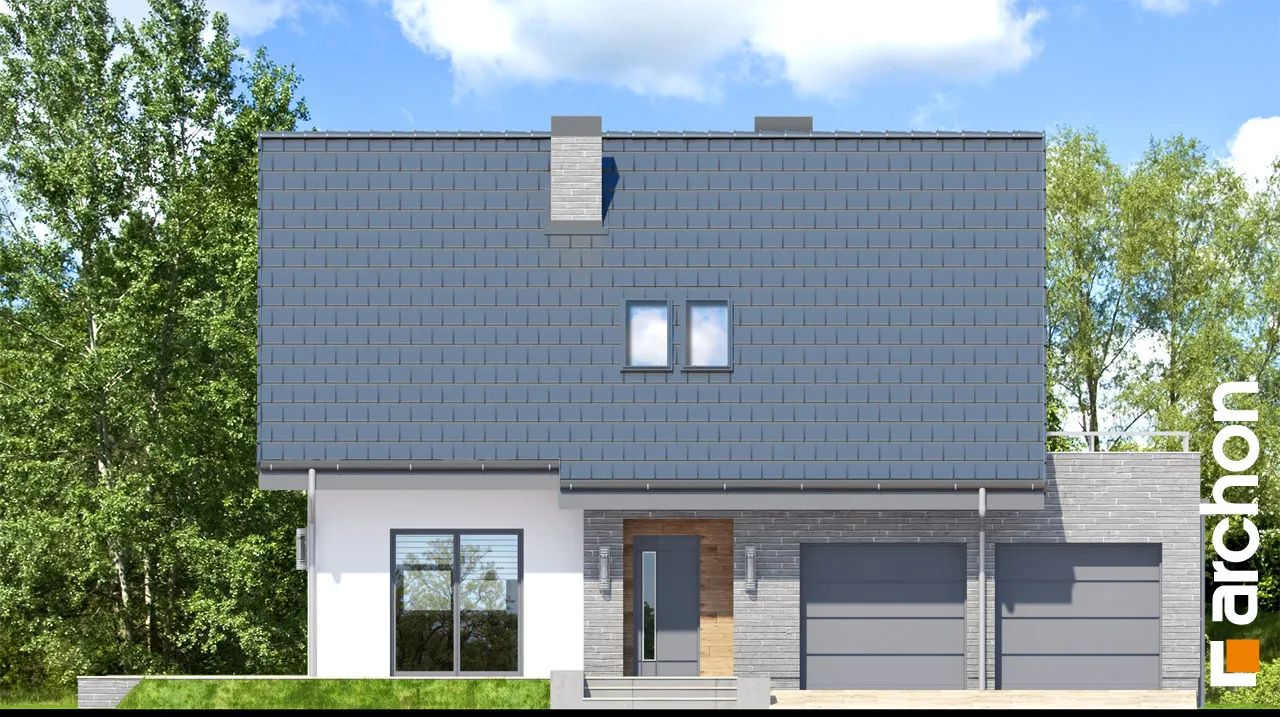 Комфортабельный дом с простым корпусом с тонкими рельефными дополнениями, подчеркивающими его современную форму. Дневная зона была спроектирована на боковой стороне дома, поэтому на нее попадает больше солнечного света. Она оптически увеличена за счет большого остекления и выхода на террасу. Стол для семейных трапез соединяет гостиную с кухней. В хозяйственной части расположены гараж и просторная котельная на твердом топливе с местом для хранения. Котельная имеет дополнительный выход наружу. Двойная лестница ведет в мансарду, где находятся три комфортабельные комнаты и большая ванная комната. В спальне родителей есть своя гардеробная. Большая терраса над гаражом увеличивает личное пространство для отдыха.