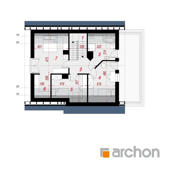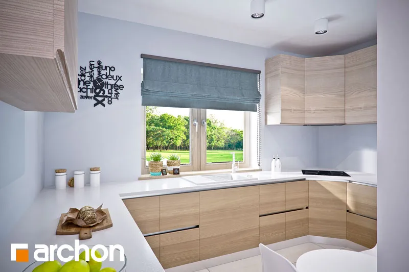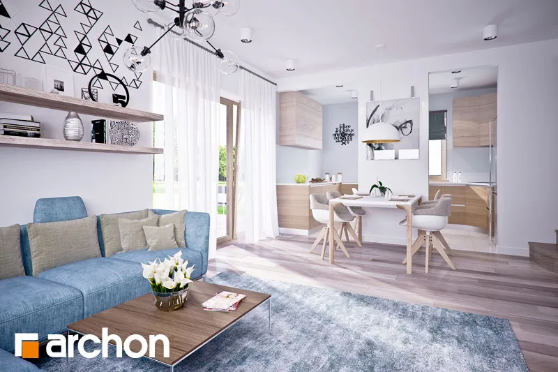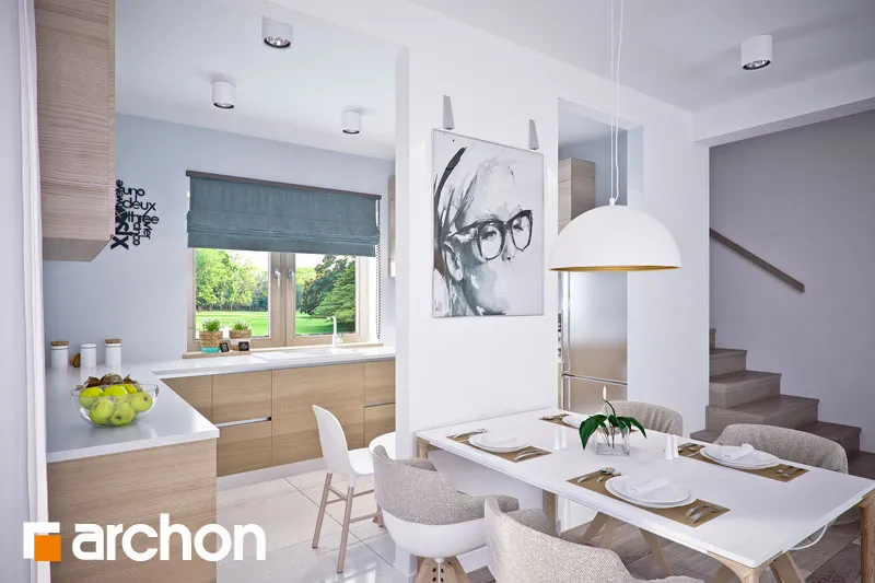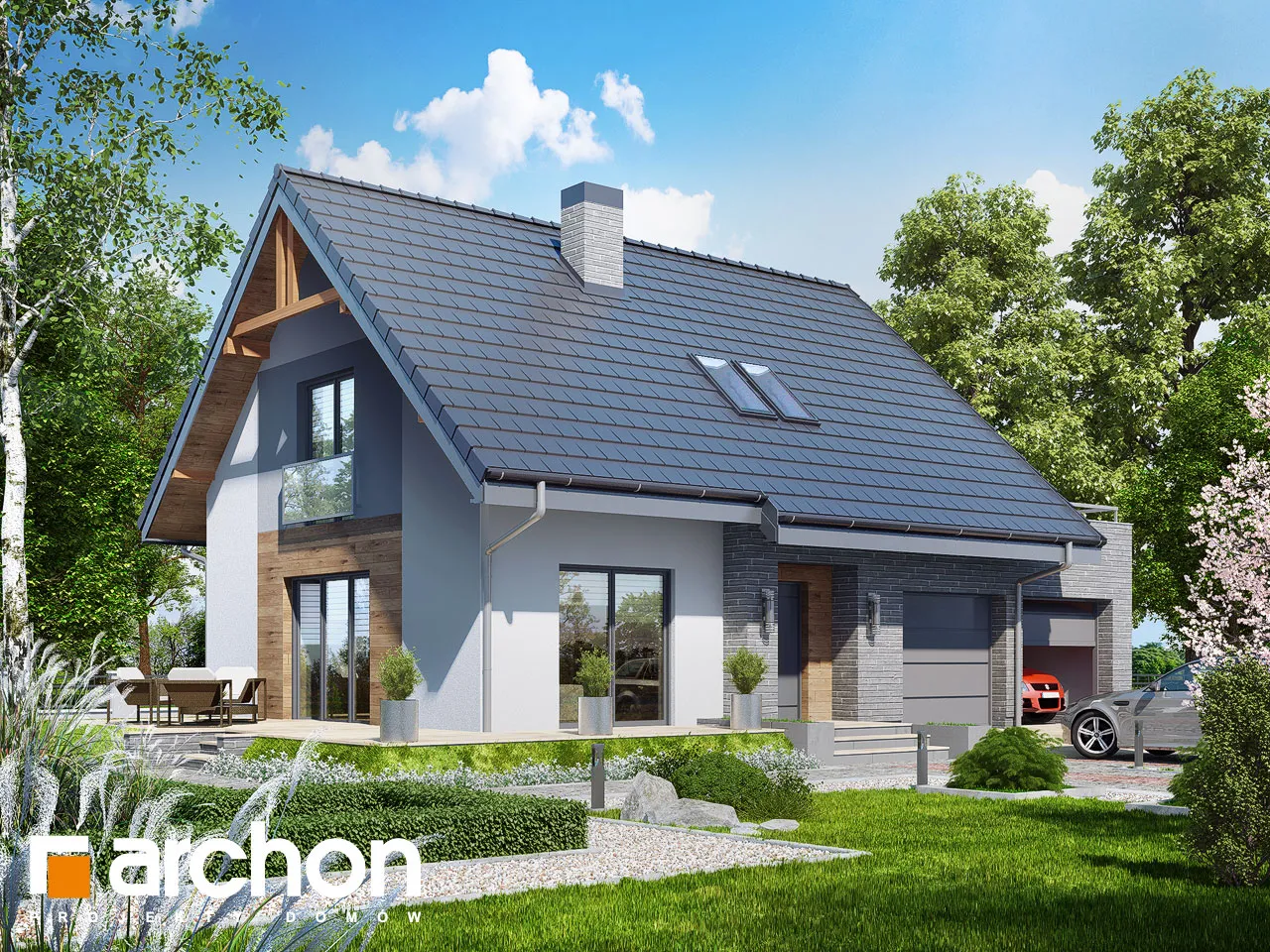 Комфортабельный дом с простым корпусом с тонкими рельефными дополнениями, подчеркивающими его современную форму. Дневная зона была спроектирована на боковой стороне дома, поэтому на нее попадает больше солнечного света. Она оптически увеличена за счет большого остекления и выхода на террасу. Стол для семейных трапез соединяет гостиную с кухней. В хозяйственной части расположены гараж и просторная котельная на твердом топливе с местом для хранения. Котельная имеет дополнительный выход наружу. Двойная лестница ведет в мансарду, где находятся три комфортабельные комнаты и большая ванная комната. В спальне родителей есть своя гардеробная. Большая терраса над гаражом увеличивает личное пространство для отдыха.