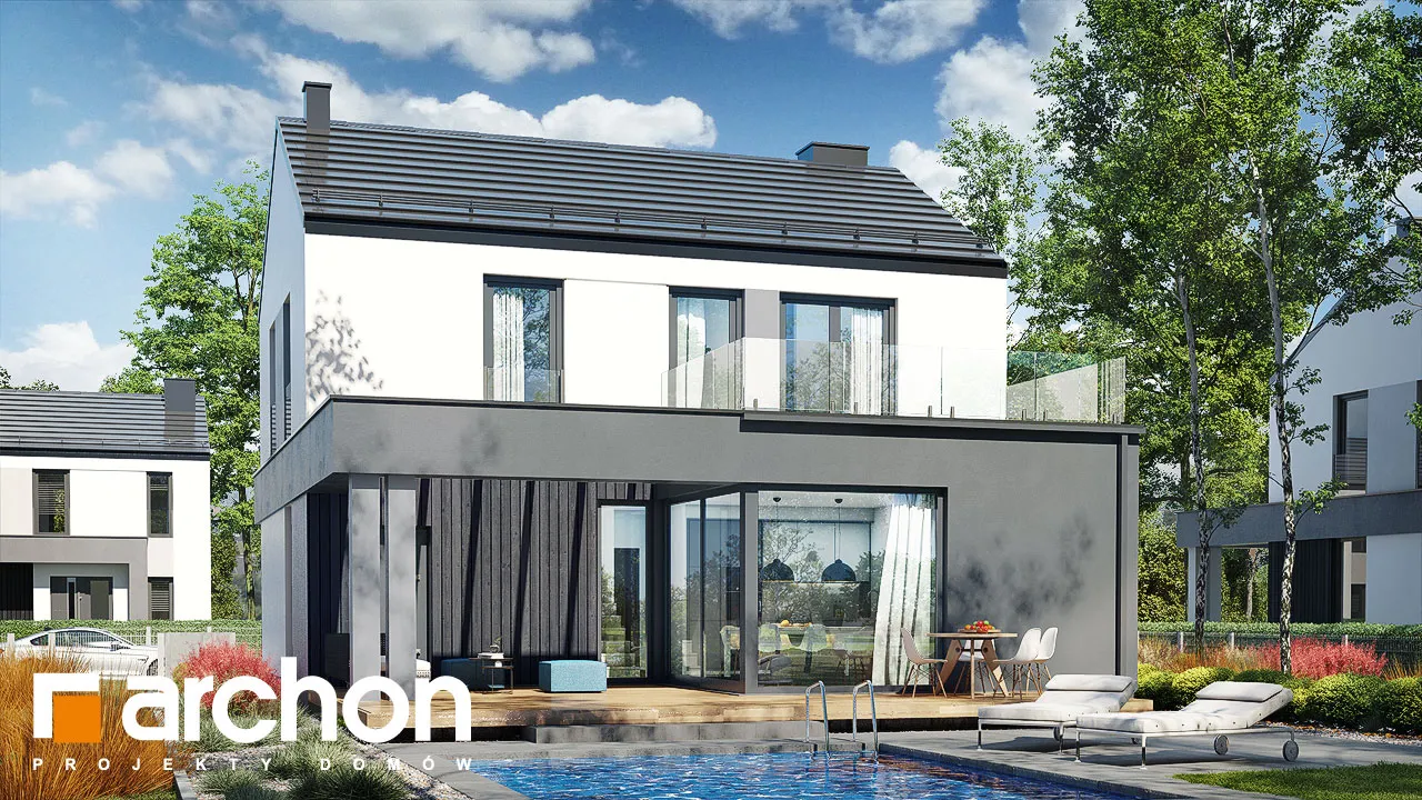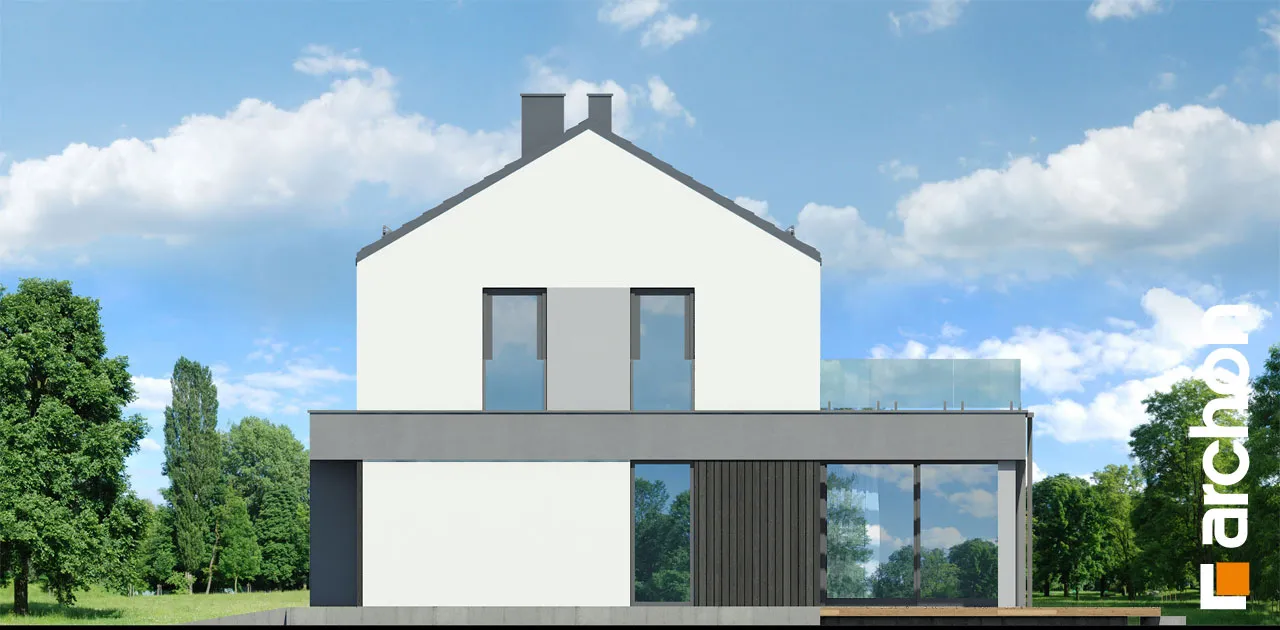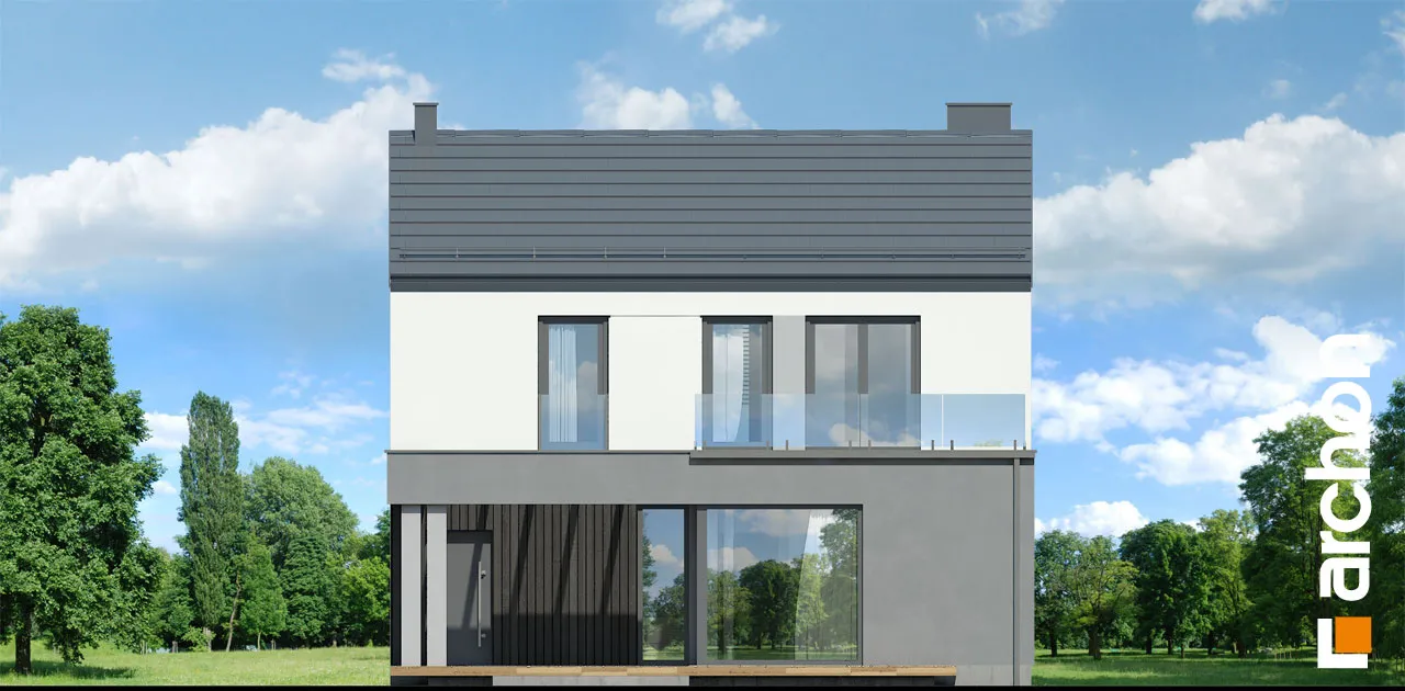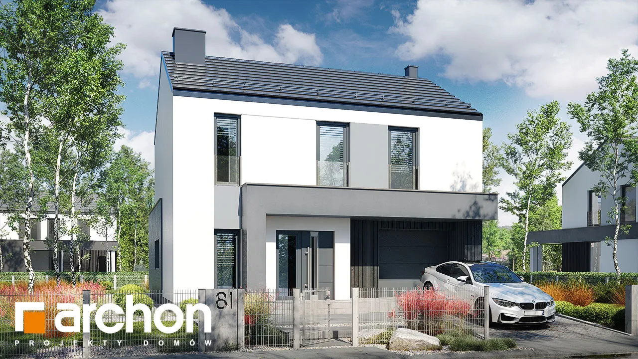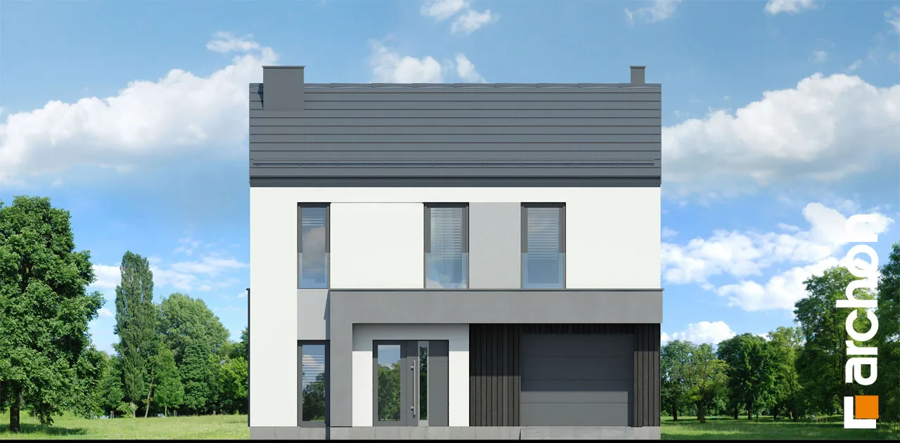 Современный односемейный дом с простым корпусом, уникальный облик которому придают интересная композиция фасада и тщательно подобранные детали. Характерным элементом является двускатная крыша без карнизов, которая покрыта плоской черепицей антрацитового цвета. Интересное сочетание белого цвета, графитовой штукатурки и натуральной облицовки в модных тонах. Главный вход подчеркнут современной рамой, которая служит практичным навесом. Большое угловое остекление в гостиной привлекательным образом открывает интерьеру вид на сад, а раздвижная система открывания увеличивает возможности его обустройства. На кухне достаточно места для приготовления пищи, хранения и место для удобного стола. На первом этаже находится туалет, а через тамбур - котельная с функцией прачечной и одноместный гараж, в котором также можно разместить спортивное оборудование и садовый инвентарь. Мансарда включает спальню родителей с гардеробом, две детские комнаты и полностью оборудованную ванную комнату. На террасу, которая является дополнительной зоной отдыха, можно попасть как из родительской комнаты, так и из холла. Удобное сообщение между первым этажом и мансардой обеспечивает одномаршевая лестница. Представленный "Дом в цитронах" относится к категории: проекты небольших домов, проекты домов со скатной крышей, проекты современных домов.