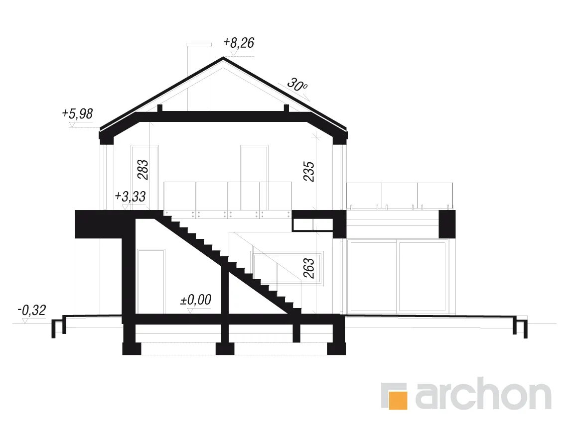 - Разрезы со всеми размерами (высоты этажей, кровли и др.)