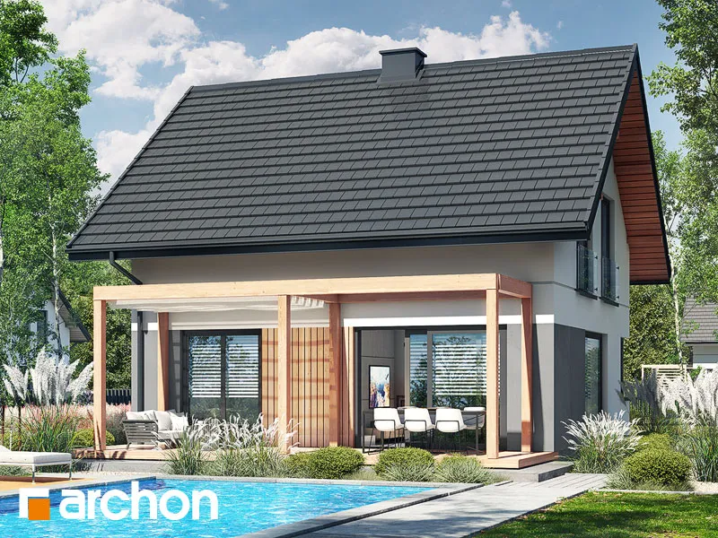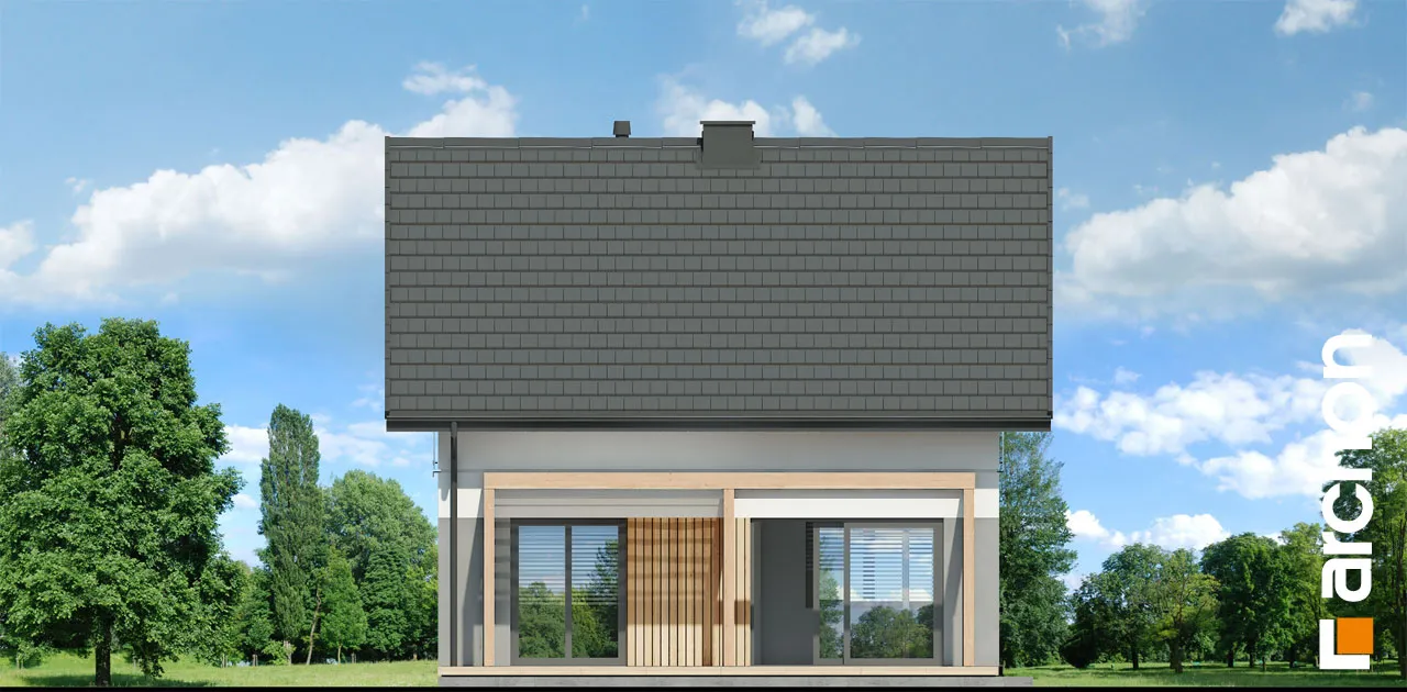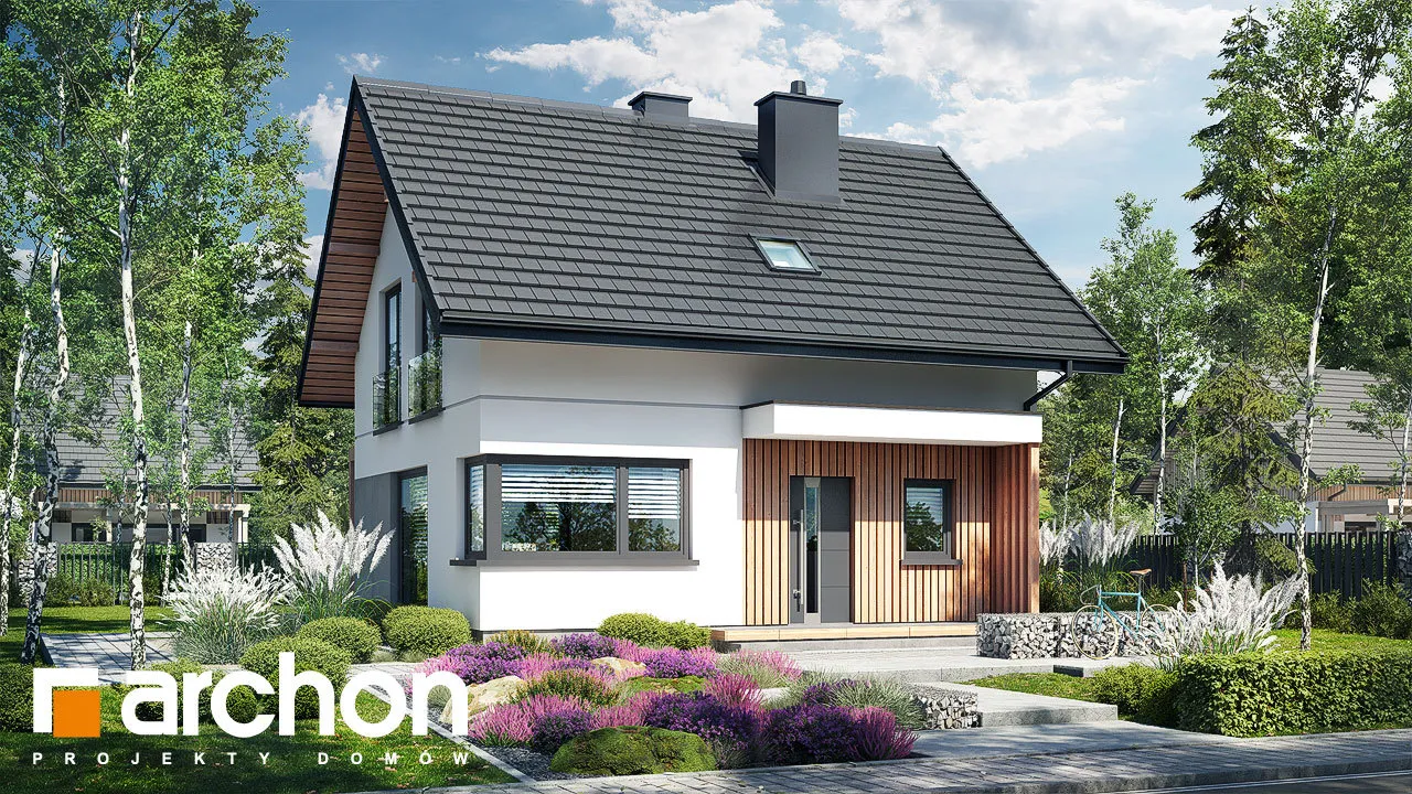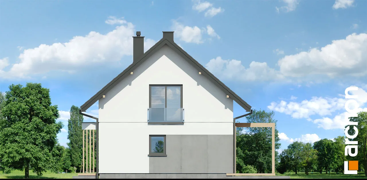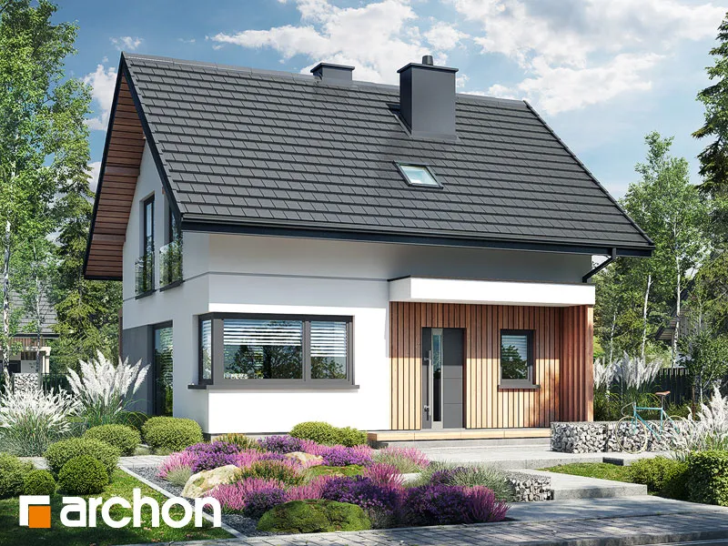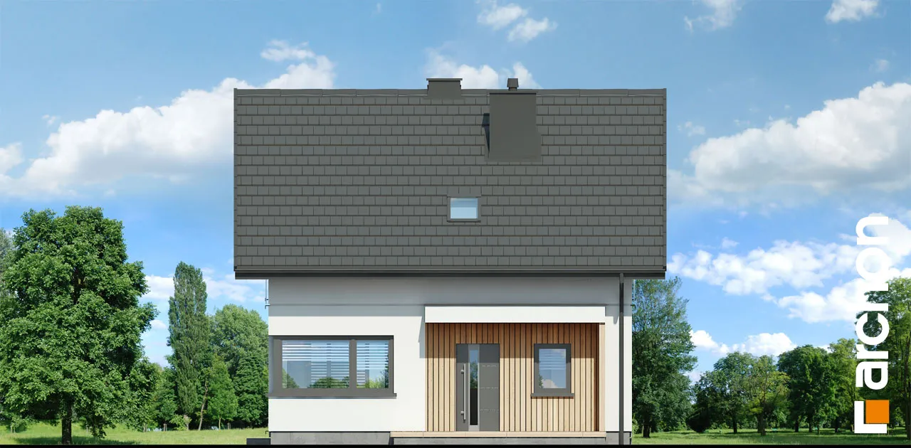 Привлекательный проект дома площадью застройки до 70 м2, с простым и недорогим корпусом конструкции, покрытым двускатной крышей. Светлый фасад с акцентами серой штукатурки и деревянной облицовки подчеркивает современный характер и обеспечивает очень привлекательный внешний вид дома. Правильно спроектированное остекление придает легкость конструкции и впускает внутрь много естественного света. В мансарде были использованы современные окна. Открытая планировка жилой зоны визуально увеличивает ее простор. Гостиная с угловым диваном легко соединяется со столовой. На кухне с функциональной встроенной мебелью достаточно места для приготовления еды и хранения. Большое угловое окно на кухне повышает комфорт работы, а раздвижное стеклянное окно в гостиной обеспечивает плавное соединение с террасой, над которой создается тень от деревянной перголы. Также на первом этаже спроектирована дополнительная комната, которую, в зависимости от потребностей, можно использовать как кабинет или комнату для гостей. Его преимуществом является широкое остекление и прямой выход в сад. Ванная комната на первом этаже может быть оборудована современной душевой кабиной, а в прихожей предусмотрено место для вместительных шкафов. Благодаря сочетанию газовой котельной и функции прачечной можно удобно организовать домашние дела. В мансарде, которая служит ночной зоной дома, спроектирована большая спальня родителей с гардеробной, две спальни для детей и светлая ванная комната. "Дом в кронселах" - предложение из коллекции: проекты домов до 70 м2 площади застройки, проекты небольших домов, проекты домов в современном стиле.