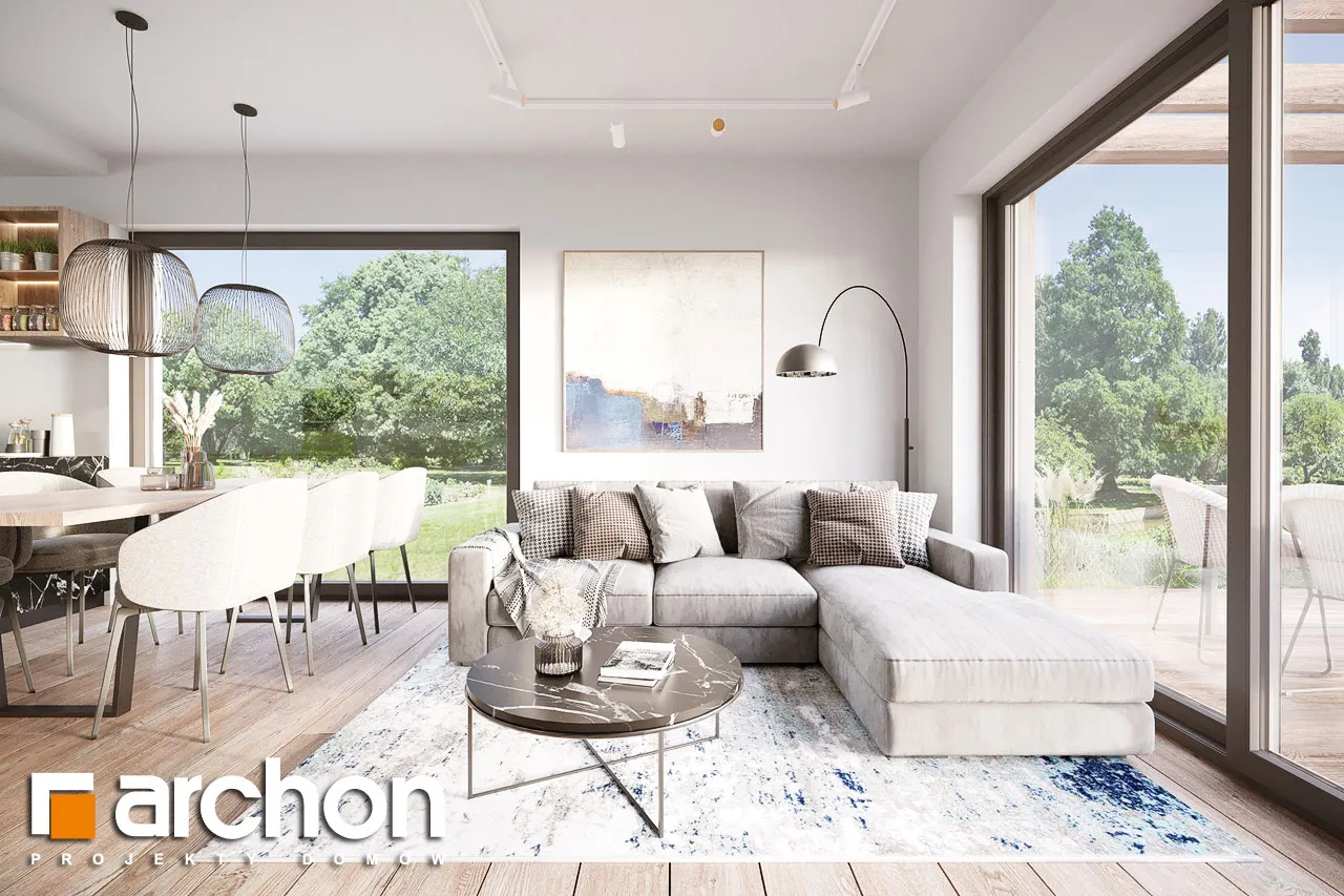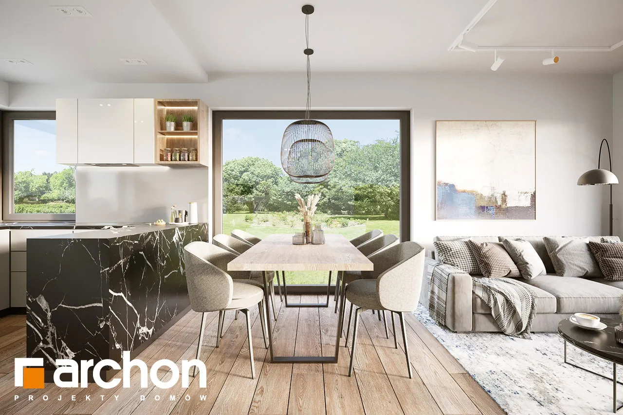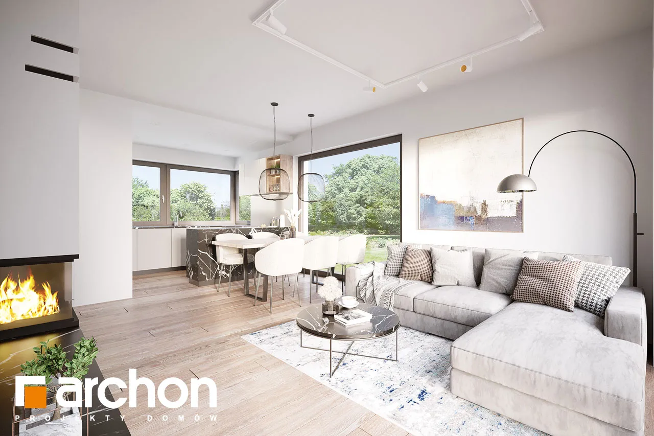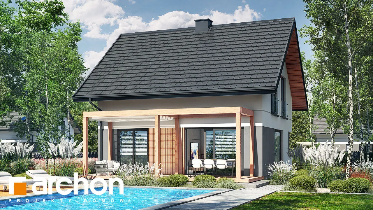 Привлекательный проект дома площадью застройки до 70 м2, с простым и недорогим корпусом конструкции, покрытым двускатной крышей. Светлый фасад с акцентами серой штукатурки и деревянной облицовки подчеркивает современный характер и обеспечивает очень привлекательный внешний вид дома. Правильно спроектированное остекление придает легкость конструкции и впускает внутрь много естественного света. В мансарде были использованы современные окна. Открытая планировка жилой зоны визуально увеличивает ее простор. Гостиная с угловым диваном легко соединяется со столовой. На кухне с функциональной встроенной мебелью достаточно места для приготовления еды и хранения. Большое угловое окно на кухне повышает комфорт работы, а раздвижное стеклянное окно в гостиной обеспечивает плавное соединение с террасой, над которой создается тень от деревянной перголы. Также на первом этаже спроектирована дополнительная комната, которую, в зависимости от потребностей, можно использовать как кабинет или комнату для гостей. Его преимуществом является широкое остекление и прямой выход в сад. Ванная комната на первом этаже может быть оборудована современной душевой кабиной, а в прихожей предусмотрено место для вместительных шкафов. Благодаря сочетанию газовой котельной и функции прачечной можно удобно организовать домашние дела. В мансарде, которая служит ночной зоной дома, спроектирована большая спальня родителей с гардеробной, две спальни для детей и светлая ванная комната. "Дом в кронселах" - предложение из коллекции: проекты домов до 70 м2 площади застройки, проекты небольших домов, проекты домов в современном стиле.