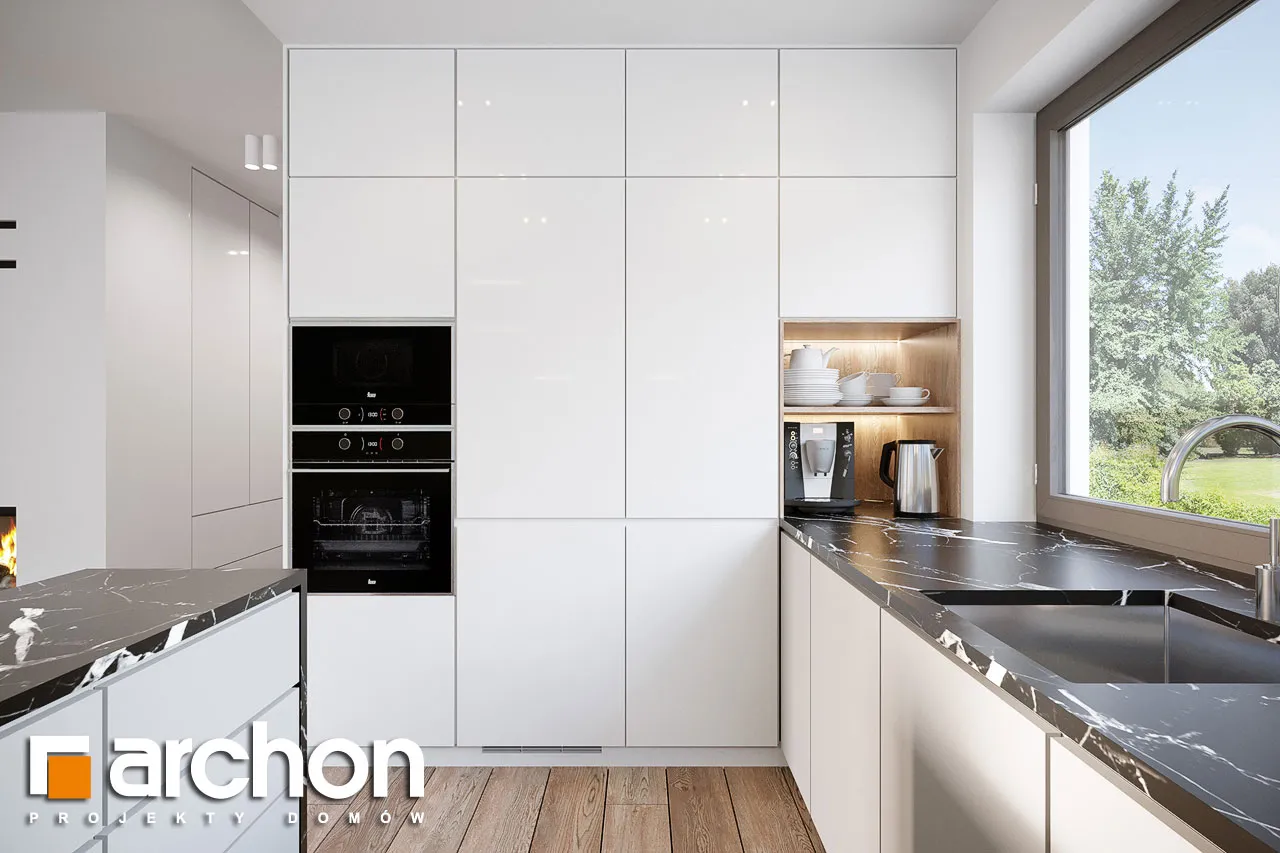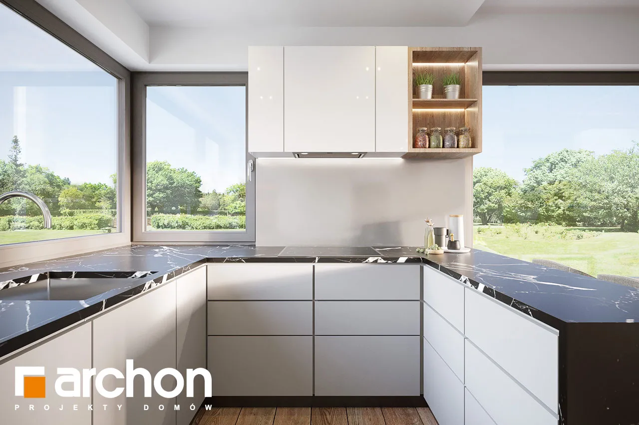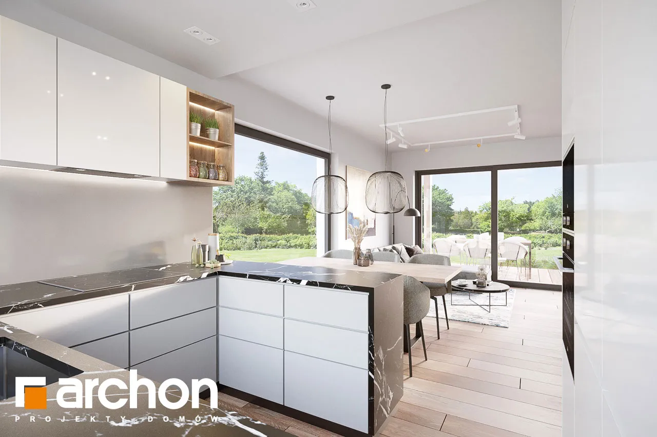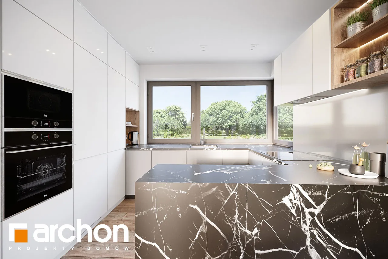 Привлекательный проект дома площадью застройки до 70 м2, с простым и недорогим корпусом конструкции, покрытым двускатной крышей. Светлый фасад с акцентами серой штукатурки и деревянной облицовки подчеркивает современный характер и обеспечивает очень привлекательный внешний вид дома. Правильно спроектированное остекление придает легкость конструкции и впускает внутрь много естественного света. В мансарде были использованы современные окна. Открытая планировка жилой зоны визуально увеличивает ее простор. Гостиная с угловым диваном легко соединяется со столовой. На кухне с функциональной встроенной мебелью достаточно места для приготовления еды и хранения. Большое угловое окно на кухне повышает комфорт работы, а раздвижное стеклянное окно в гостиной обеспечивает плавное соединение с террасой, над которой создается тень от деревянной перголы. Также на первом этаже спроектирована дополнительная комната, которую, в зависимости от потребностей, можно использовать как кабинет или комнату для гостей. Его преимуществом является широкое остекление и прямой выход в сад. Ванная комната на первом этаже может быть оборудована современной душевой кабиной, а в прихожей предусмотрено место для вместительных шкафов. Благодаря сочетанию газовой котельной и функции прачечной можно удобно организовать домашние дела. В мансарде, которая служит ночной зоной дома, спроектирована большая спальня родителей с гардеробной, две спальни для детей и светлая ванная комната. "Дом в кронселах" - предложение из коллекции: проекты домов до 70 м2 площади застройки, проекты небольших домов, проекты домов в современном стиле.